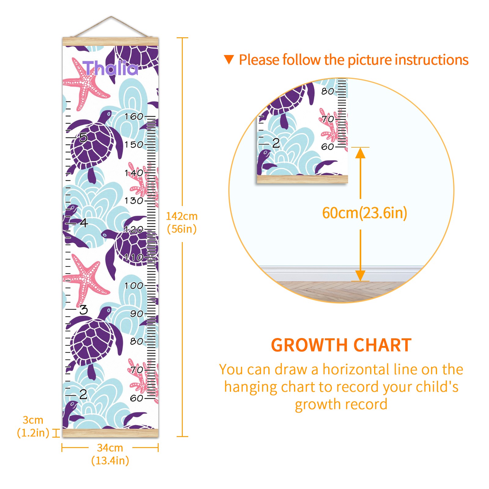 Personalized Kids Name Growth Chart Ruler for Wall Wood Frame Canvas Height Measure Chart 13.4x56 in Hanging Growth Chart Sea Turtle Starfish Coral11.10 Boys Girls Room Decor