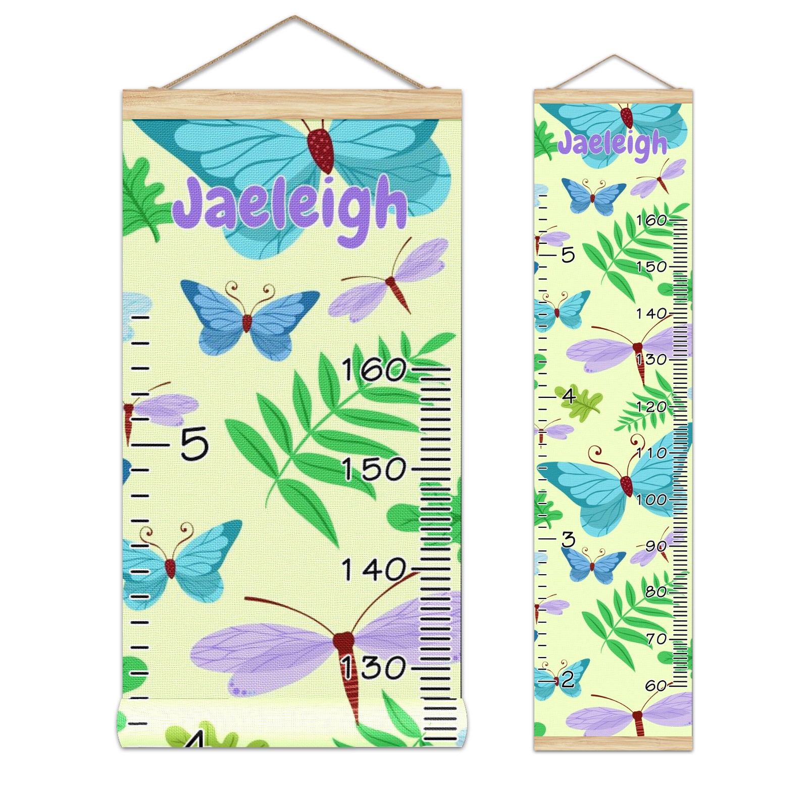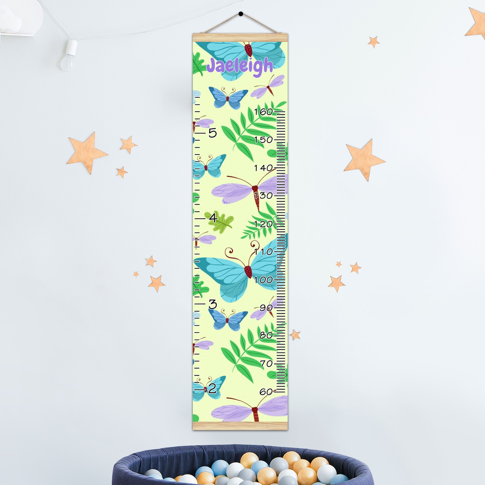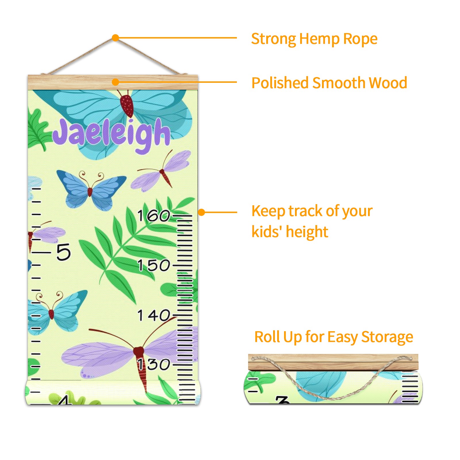 Personalized Kids Name Growth Chart Ruler for Wall Wood Frame Canvas Height Measure Chart 13.4x56 in Hanging Growth Chart Butterflies Green11.10 Boys Girls Room Decor