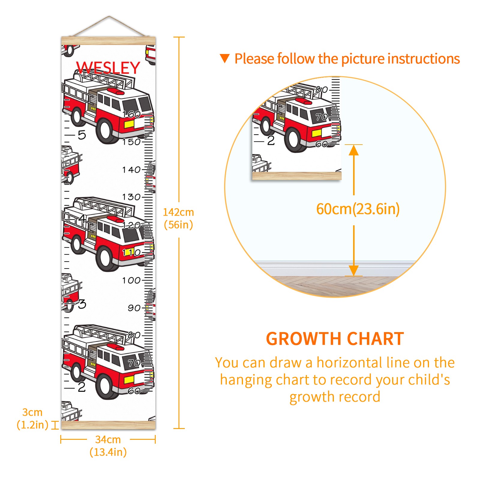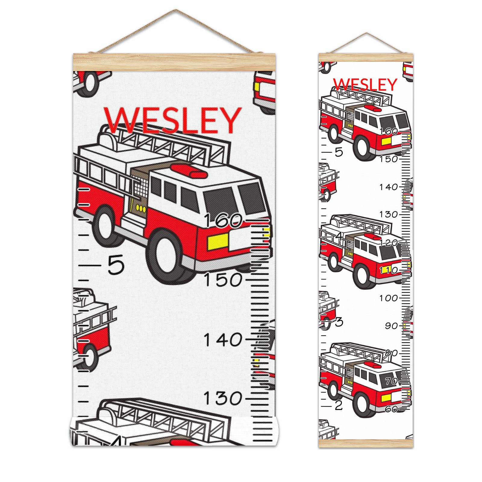 Personalized Kids Name Growth Chart Ruler for Wall Wood Frame Canvas Height Measure Chart 13.4x56 in Hanging Growth Chart Fire Truck11.10 Boys Girls Room Decor
