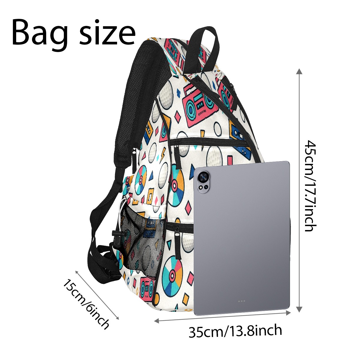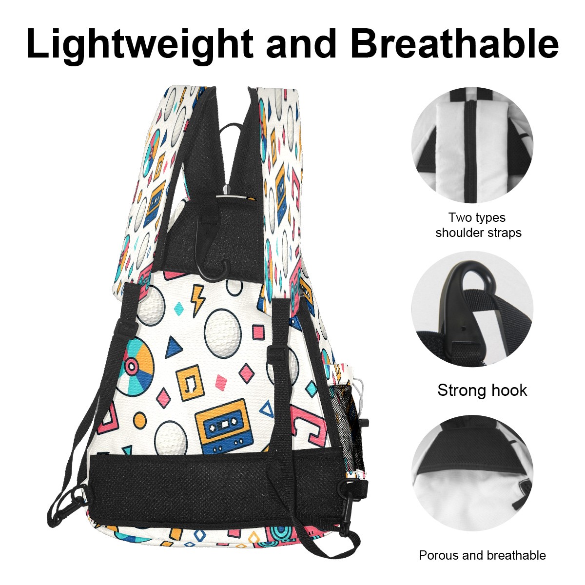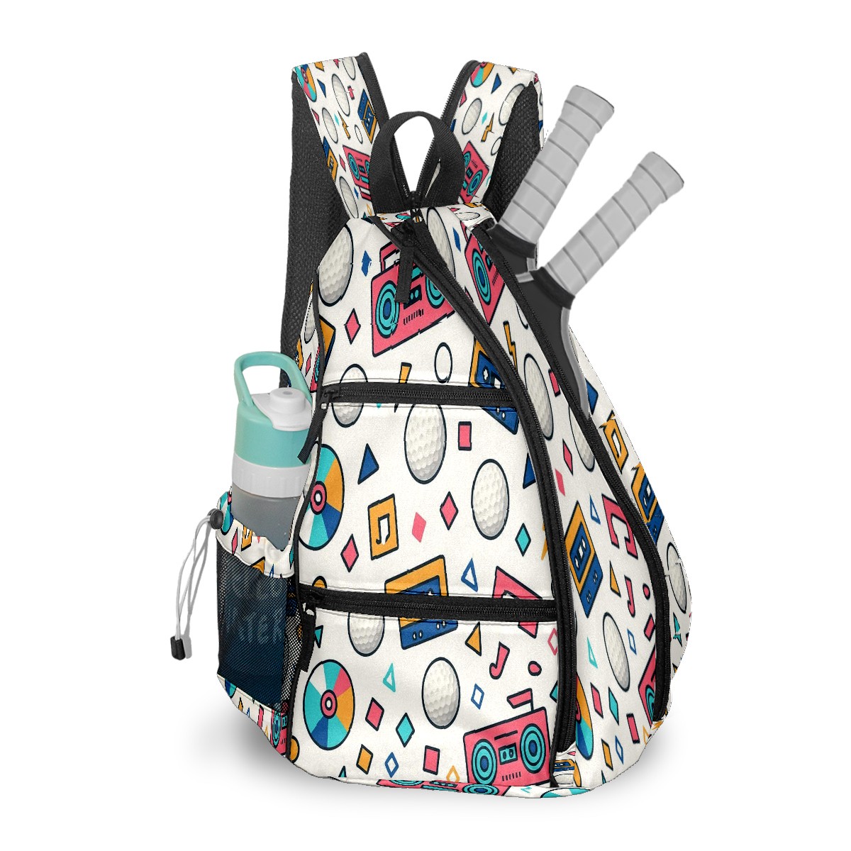 Pickleball Bag with Padded Back, Multicolor Retro Music Multi-Compartment Paddle Backpack, Lightweight Nylon Sports Bag for Men & Women