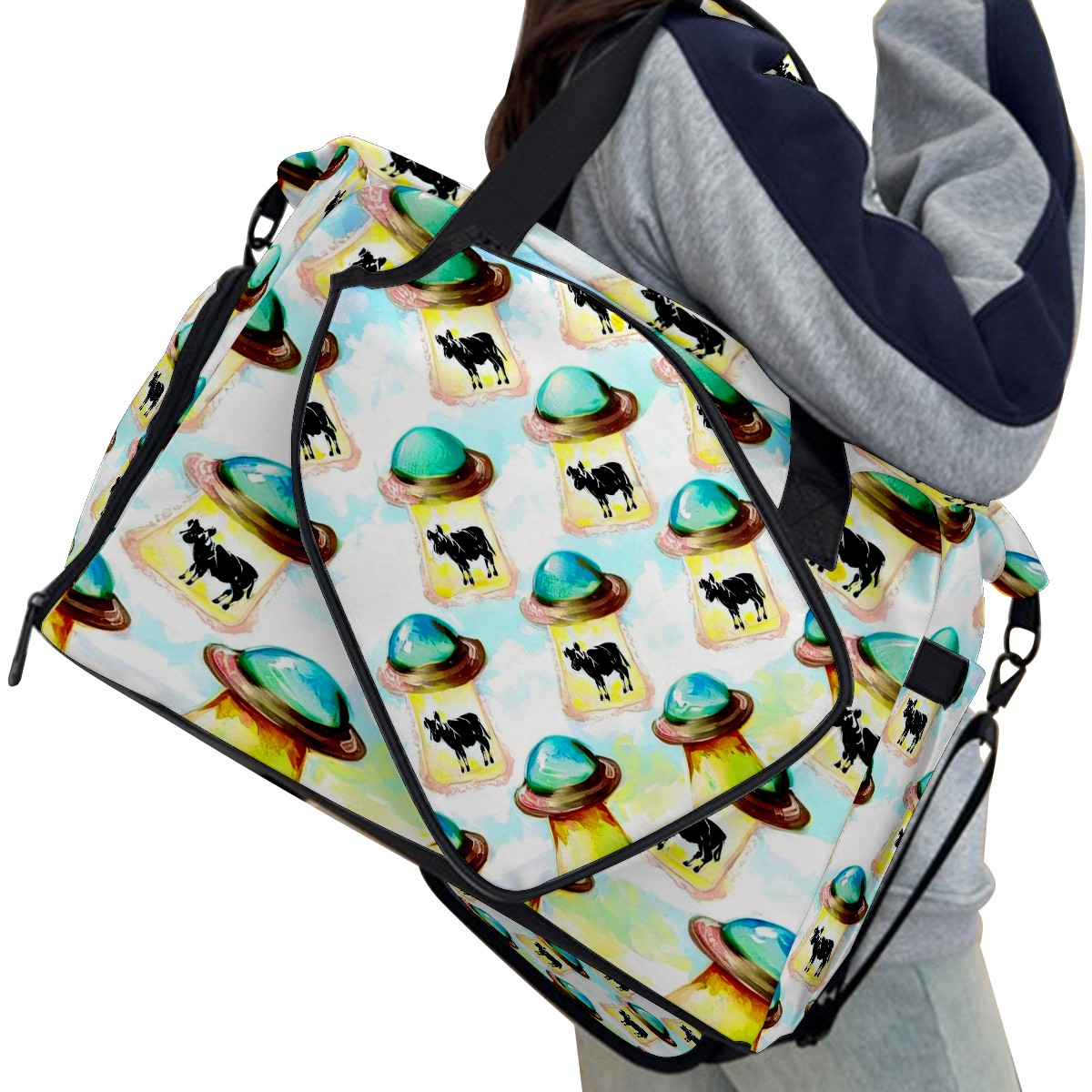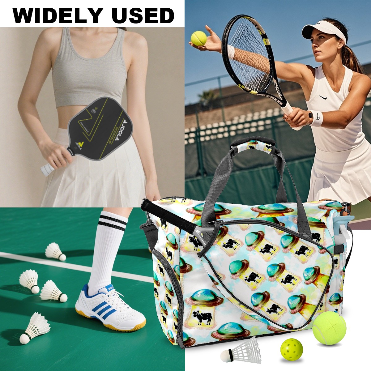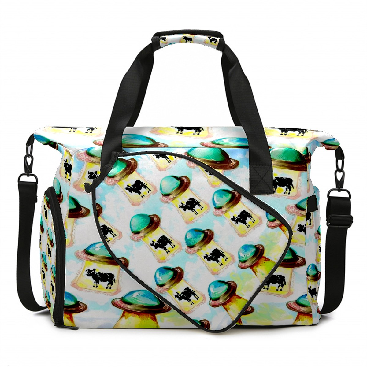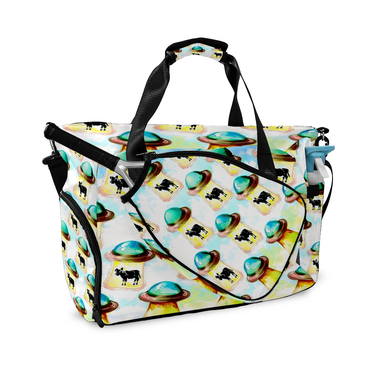 Women's Tennis Bag Large Capacity - Ventilated Shoe Compartment & Waterproof Wet Pocket, Multi-Functional Gym Duffel Bag for Tennis, Yoga, Travel (Green UFO Cows)