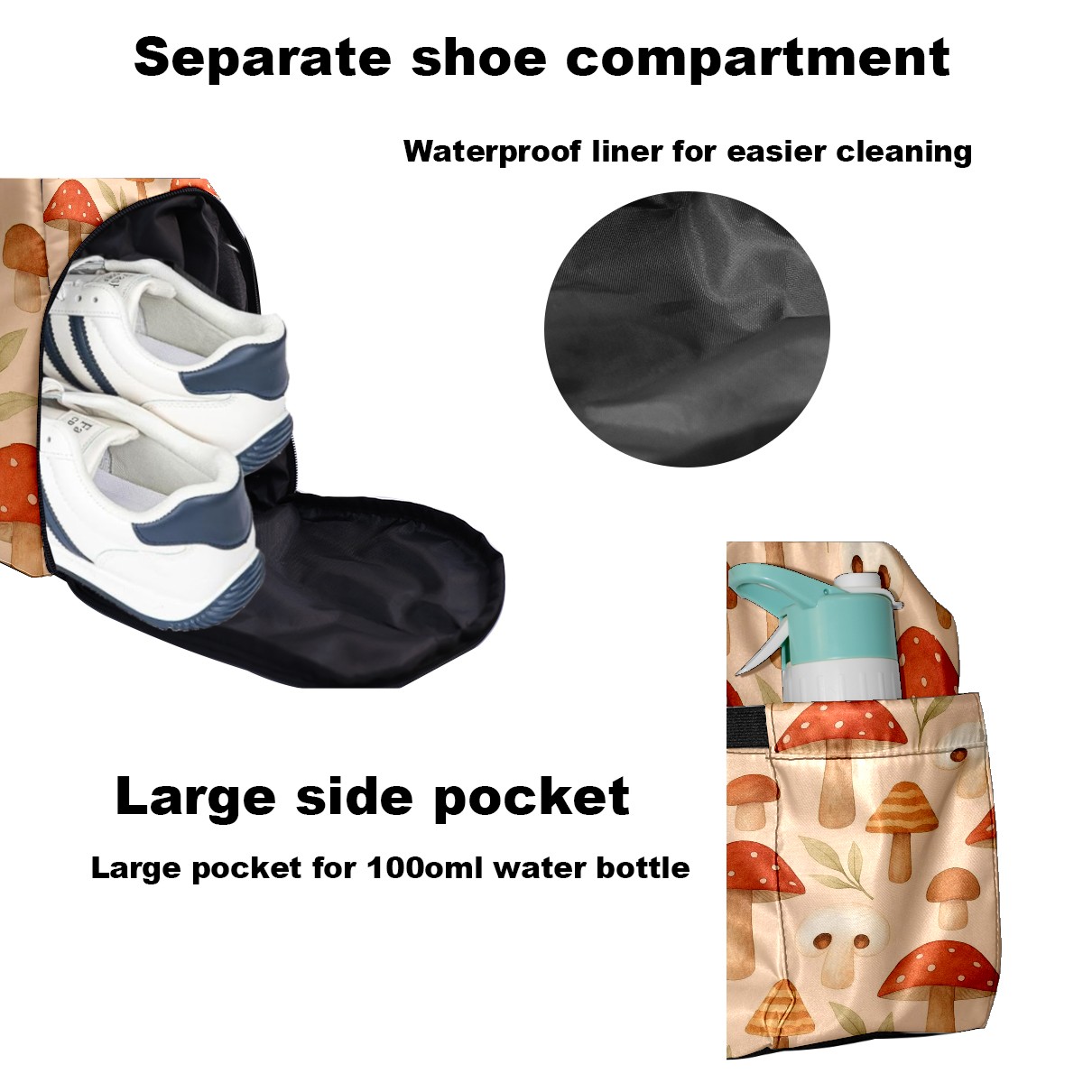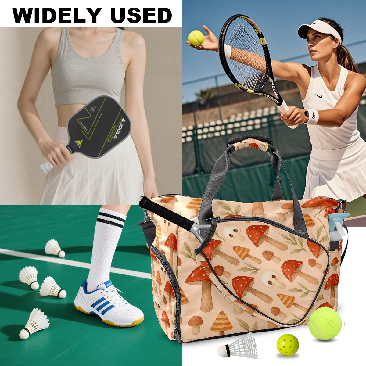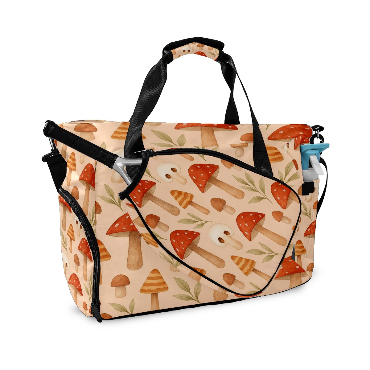 Women's Tennis Bag Large Capacity - Ventilated Shoe Compartment & Waterproof Wet Pocket, Multi-Functional Gym Duffel Bag for Tennis, Yoga, Travel (Beige Mushrooms)