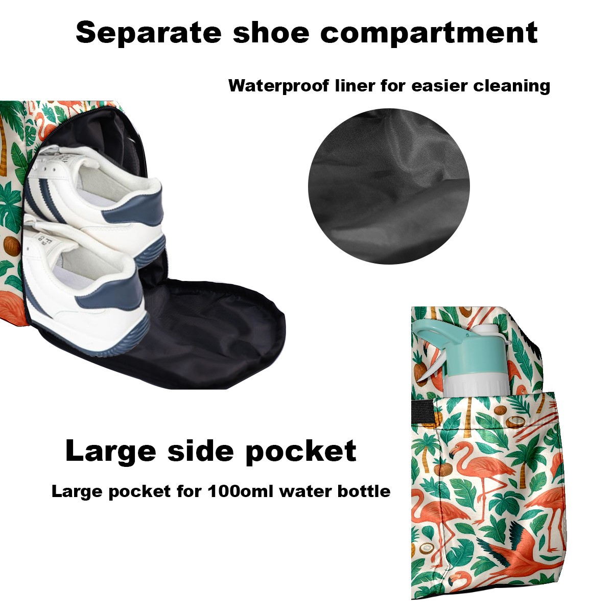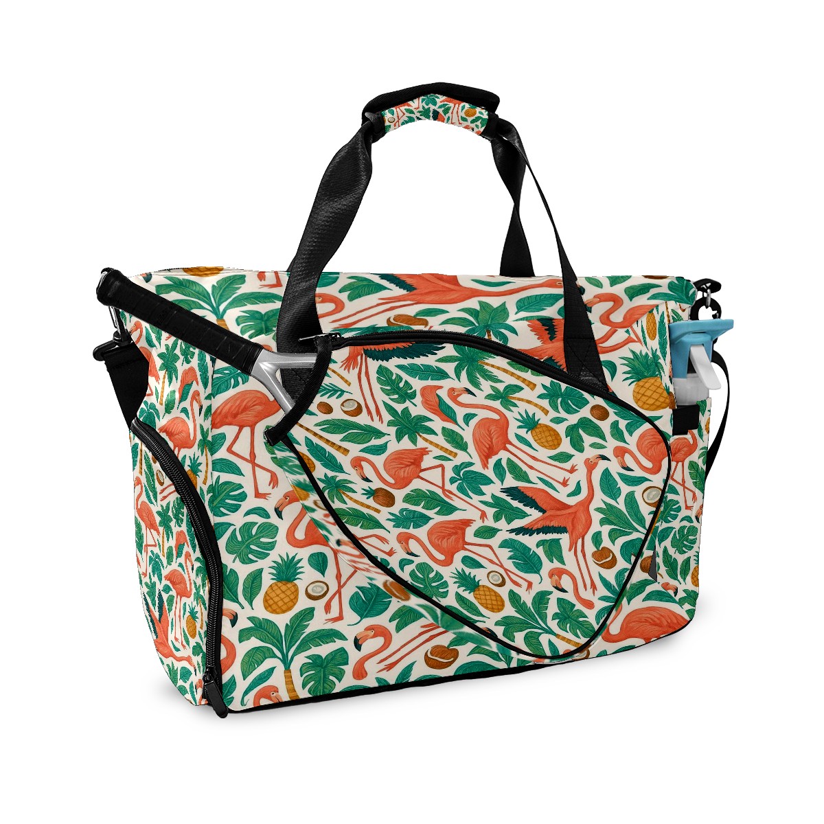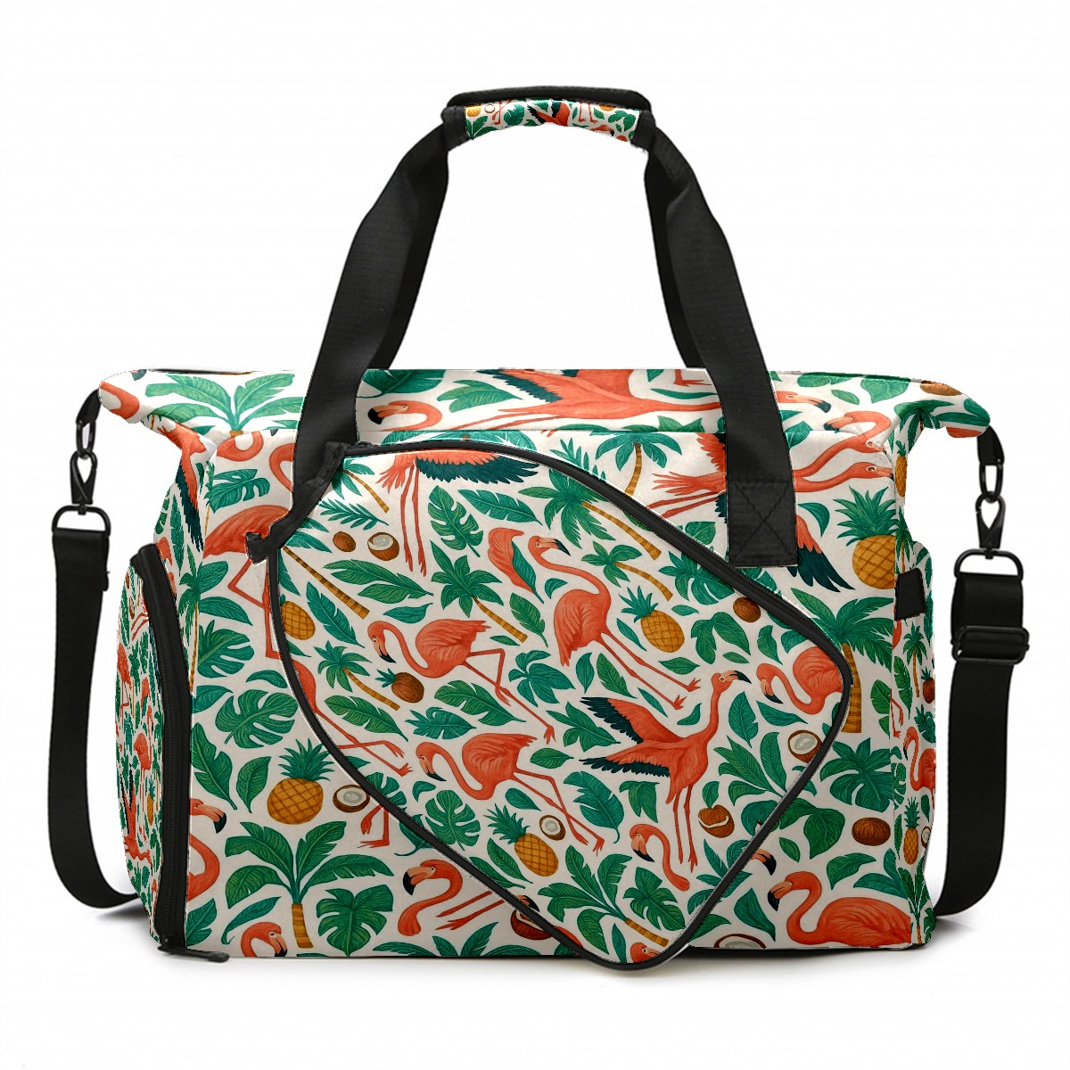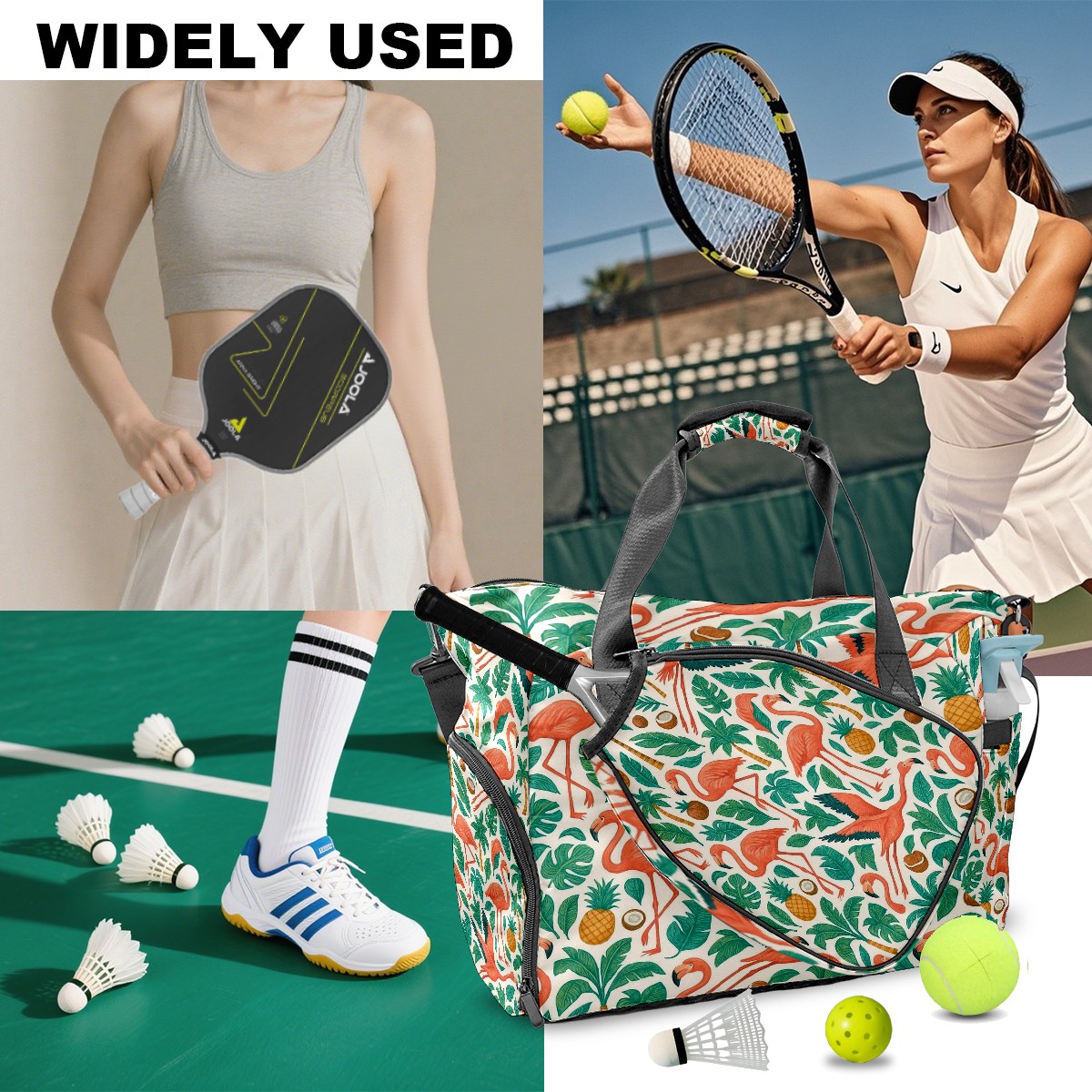 Women's Tennis Bag Large Capacity - Ventilated Shoe Compartment & Waterproof Wet Pocket, Multi-Functional Gym Duffel Bag for Tennis, Yoga, Travel (Green Tropical Flamingos)