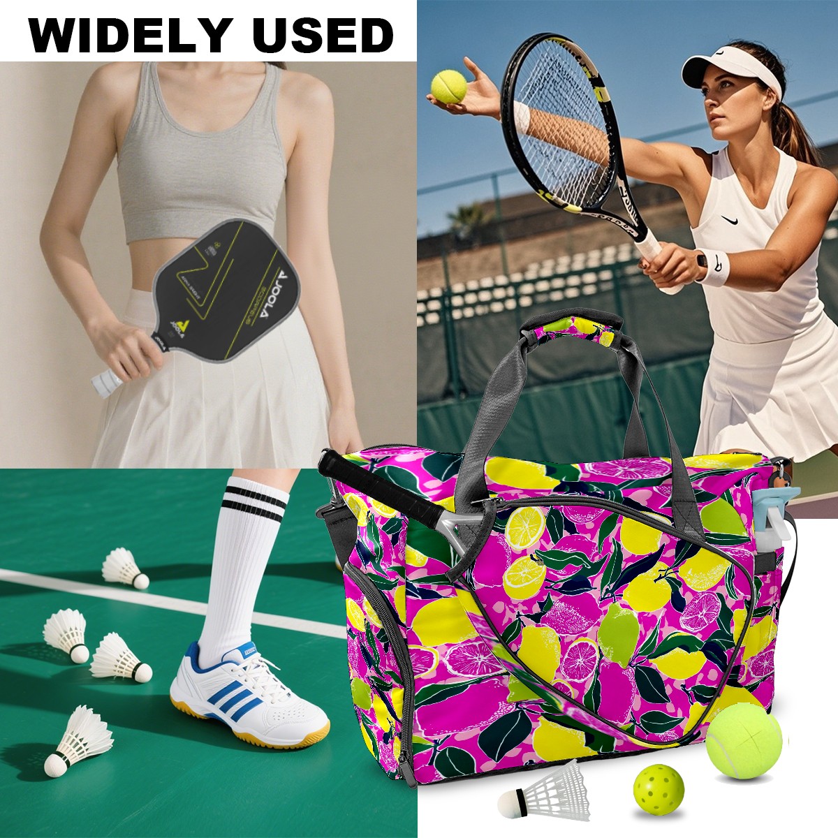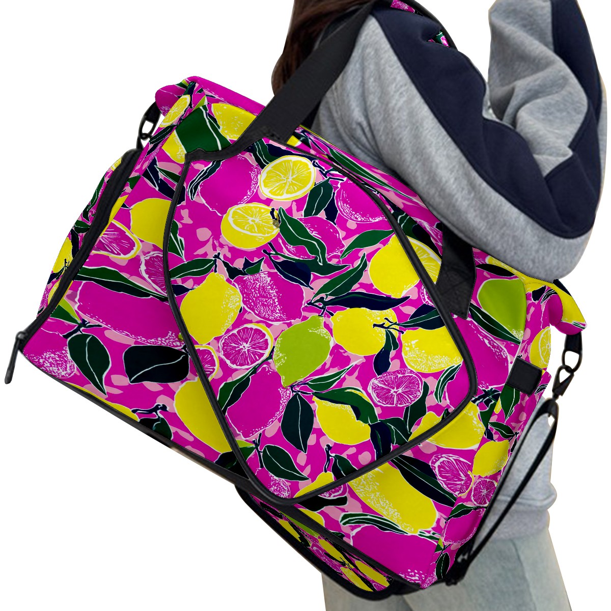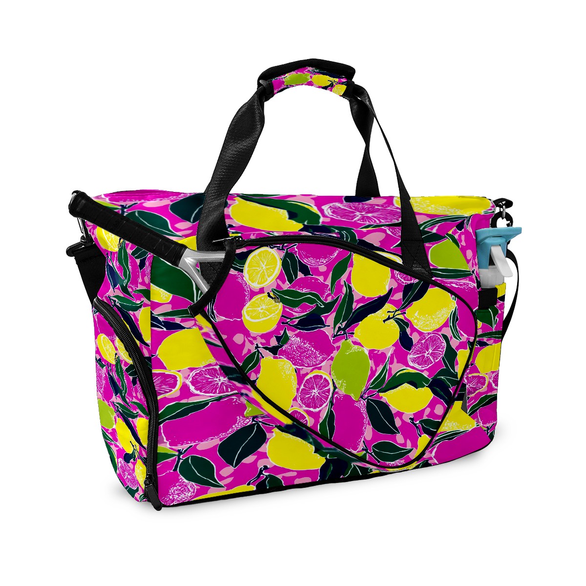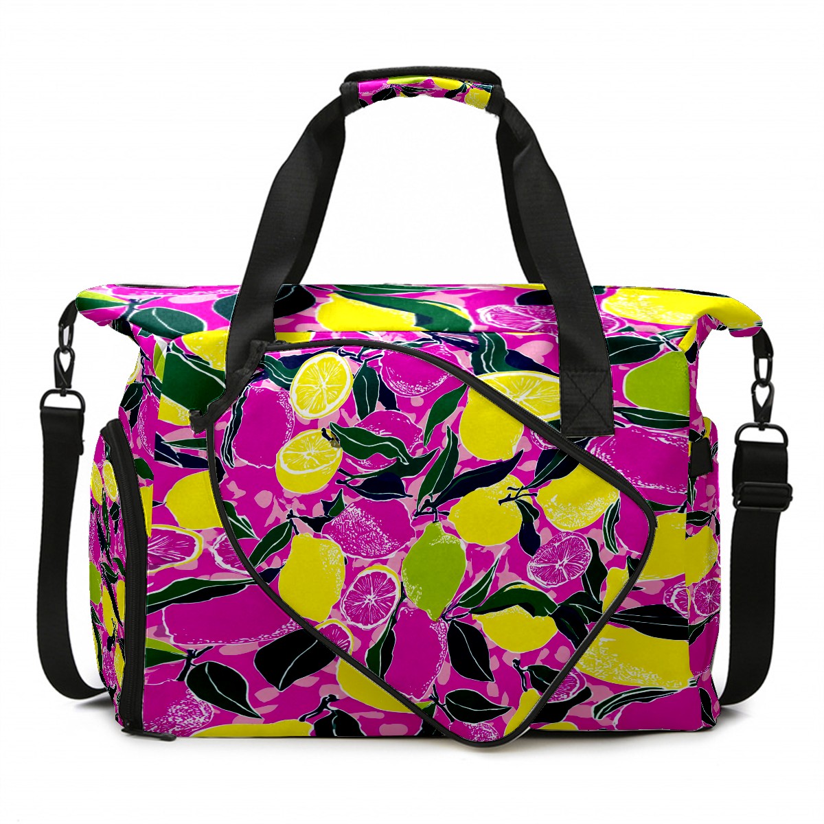 Women's Tennis Bag Large Capacity - Ventilated Shoe Compartment & Waterproof Wet Pocket, Multi-Functional Gym Duffel Bag for Tennis, Yoga, Travel (Pink Yellow Lemons Flowers)