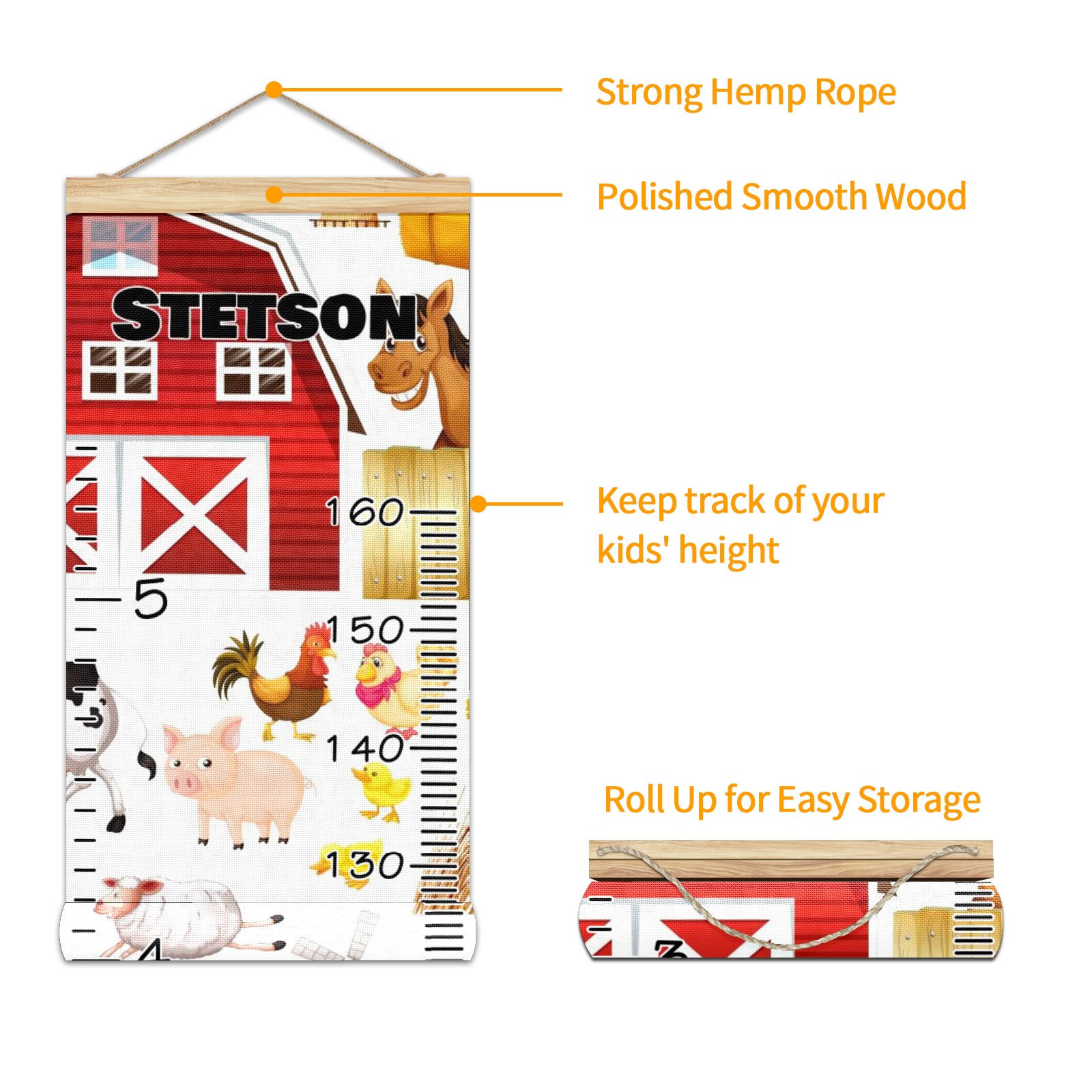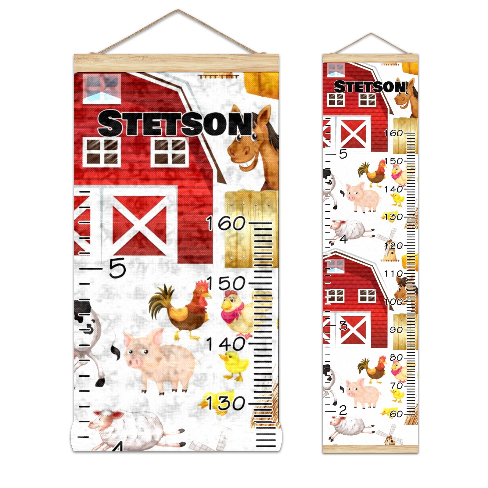 Personalized Kids Name Growth Chart Ruler for Wall Wood Frame Canvas Height Measure Chart 13.4x56 in Hanging Growth Chart Farm Animals Horse Red Barn11.13 Boys Girls Room Decor
