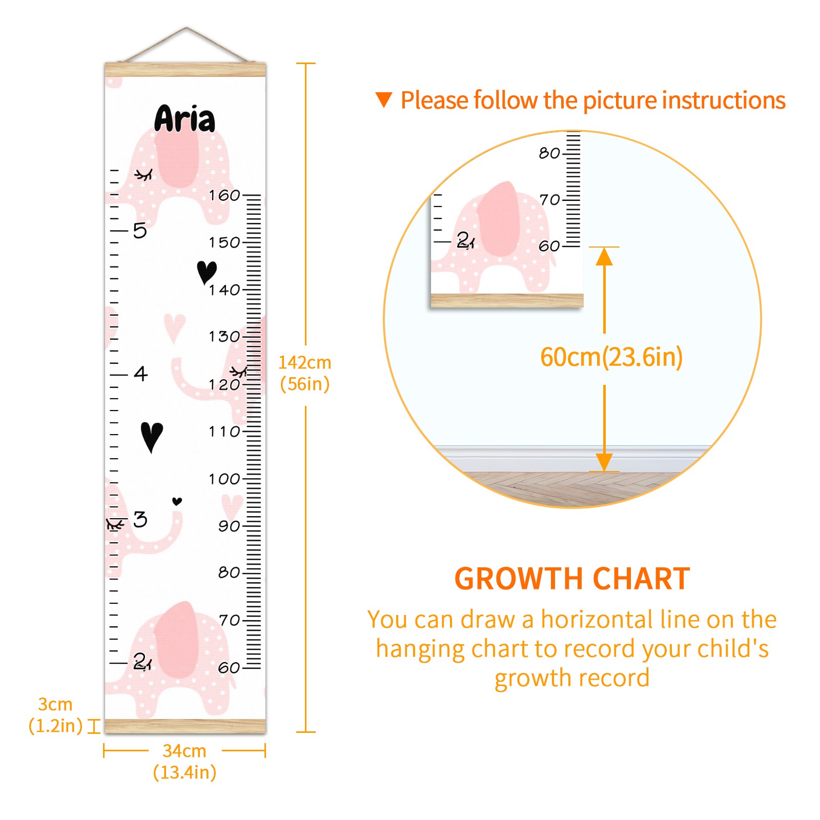 <p><b>Features:</b></p> <p>Rope for Hanging</p> <p>Material: Linen + Wood</p> <p>Dimensions: 13.4x56 inches</p> <p>Package Included: 1 * Baby Growth Chart</p> <p><b>Baby height growth chart can be used anywhere</b></p> <p>Ideal for kids nursery decoration, kids bedroom, interior walls or windows, playroom, living room, homedecoration.Add name and make the growth chart special!</p> <p><b>Easy to fold and carry</b></p> <p>With rope at the top of the growth chart, it is easy to install and remove.You can fold it and unfold any time any where.</p> <p><b>Perfect Gift Idea for Kids</b></p> <p>Environmental and non-toxic for kids use, it must be a perfect gift for baby, kids, girls, and boys.This is a best choice for your friend who have kids or baby as a popular gift.</p> <p><b>Easy to read</b></p> <p>Measurement accrate with 2 scales, Centimeters and feet. The letters are big enough, very easy to read.</p> <p><b>60cm(23.6inch) Over Ground Design</b></p> <p>Not only can protect from dust and other damage, but also will not interfere in floor cleaning.</p>