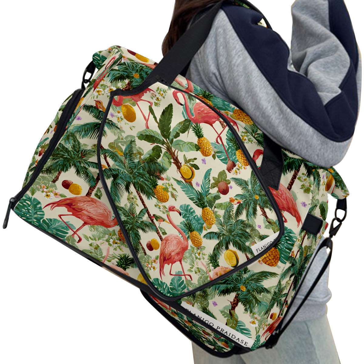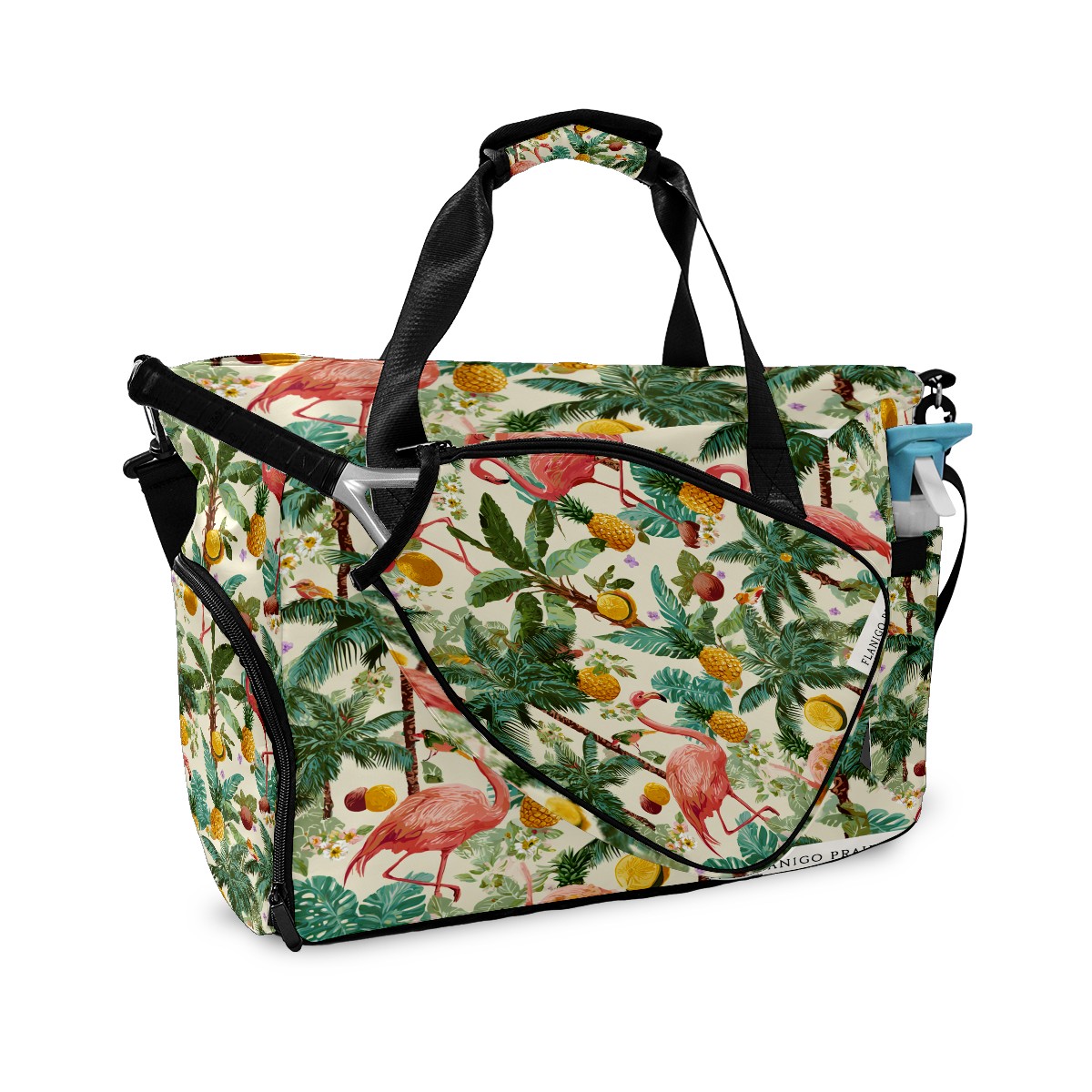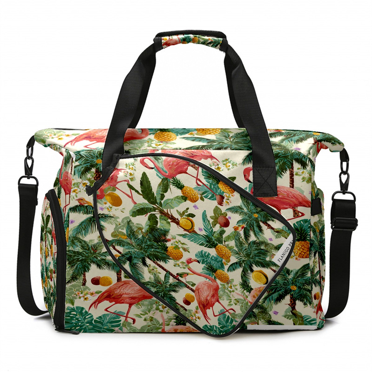 Women's Tennis Bag Large Capacity - Ventilated Shoe Compartment & Waterproof Wet Pocket, Multi-Functional Gym Duffel Bag for Tennis, Yoga, Travel (Green Tropical Flamingos)