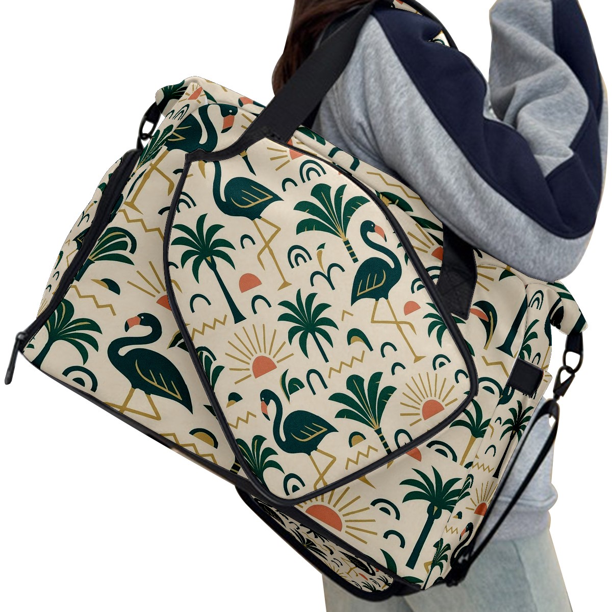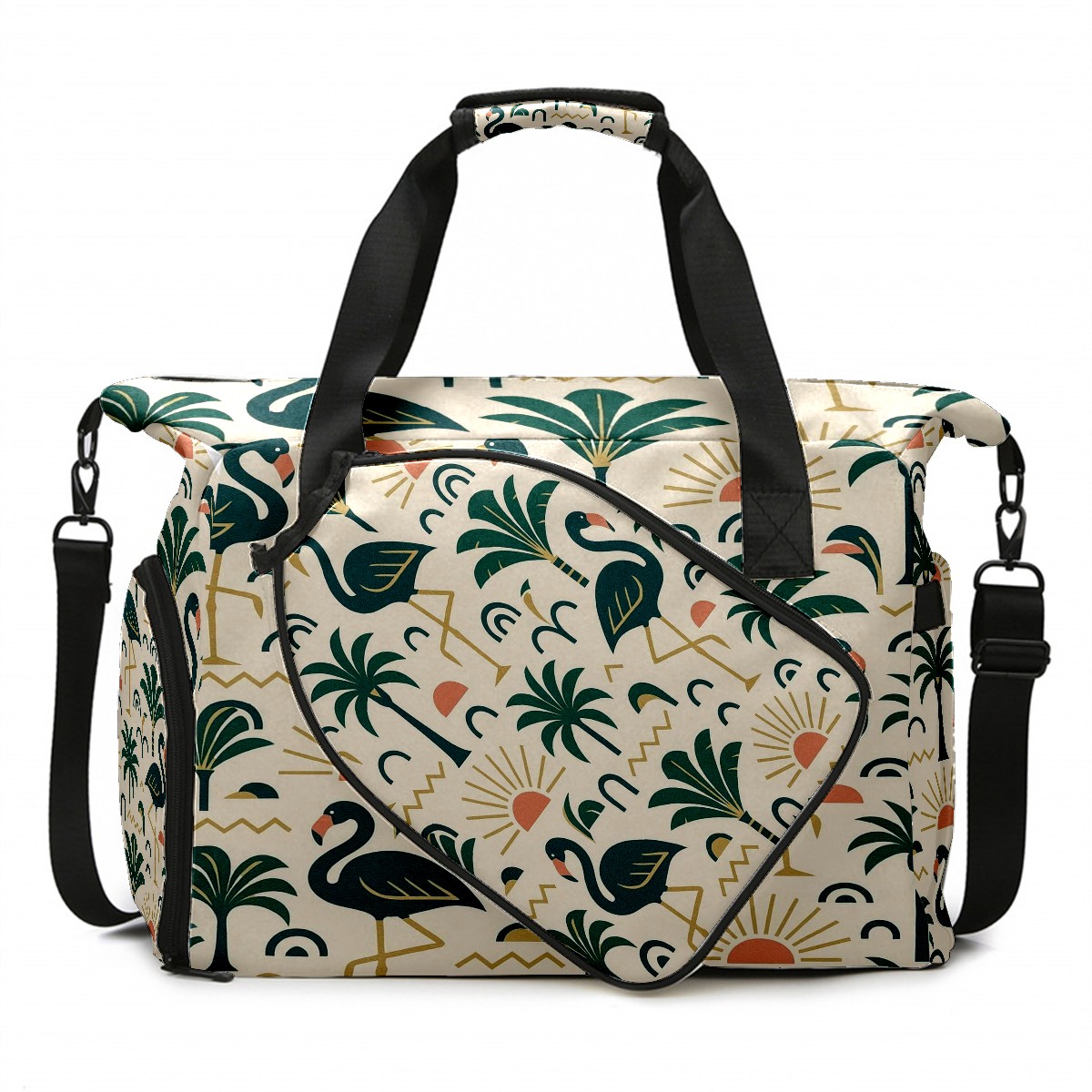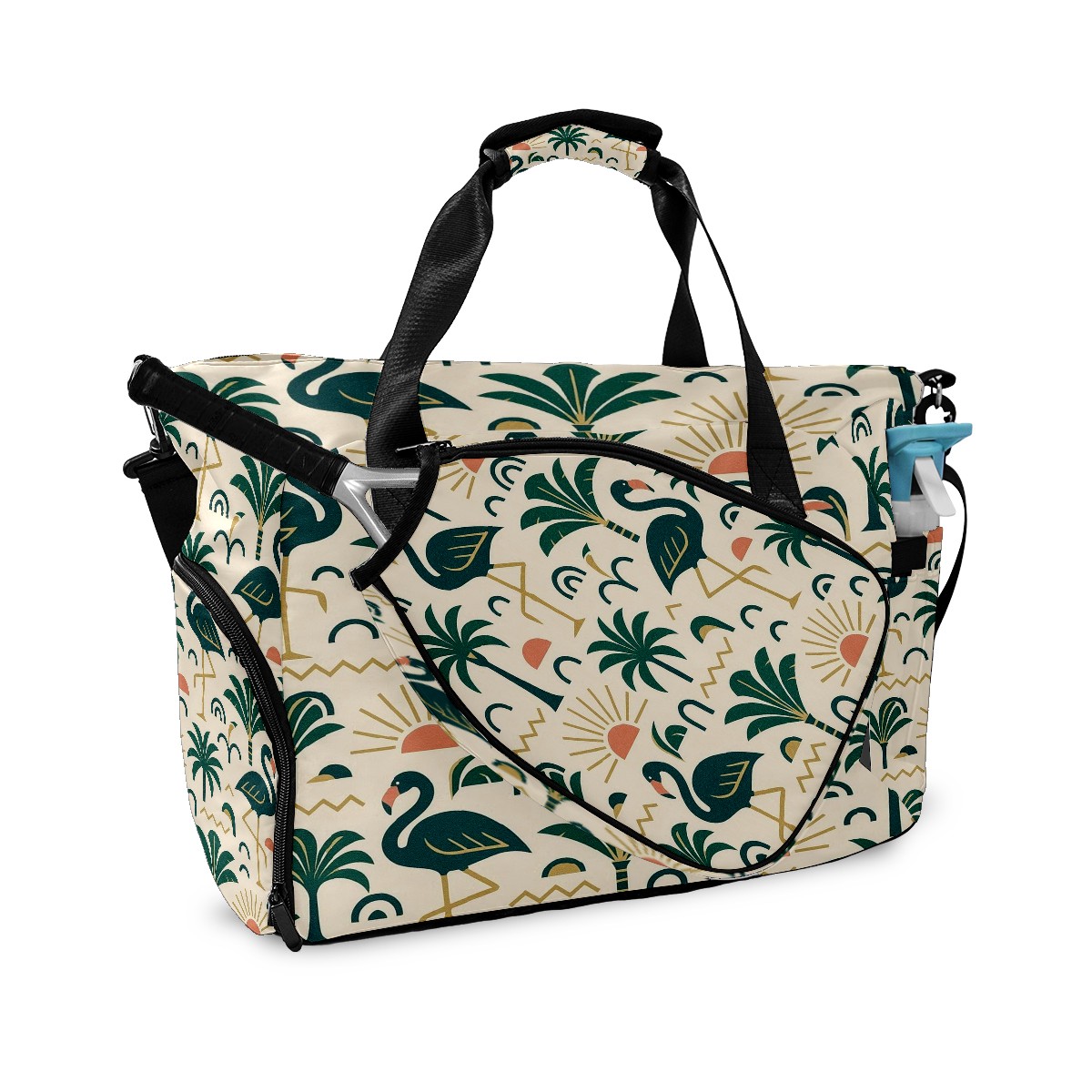 Women's Tennis Bag Large Capacity - Ventilated Shoe Compartment & Waterproof Wet Pocket, Multi-Functional Gym Duffel Bag for Tennis, Yoga, Travel (Green Flamingos Palms)
