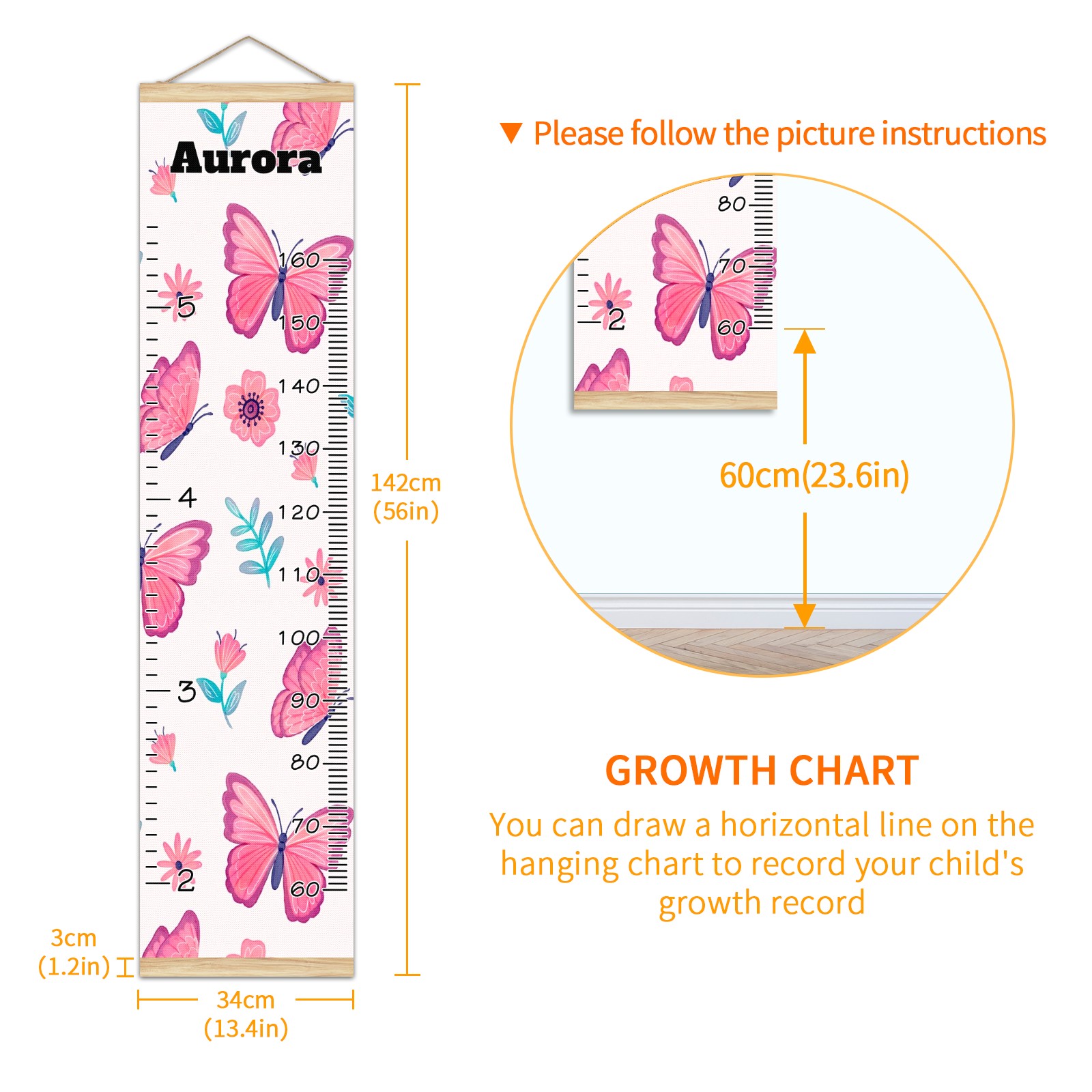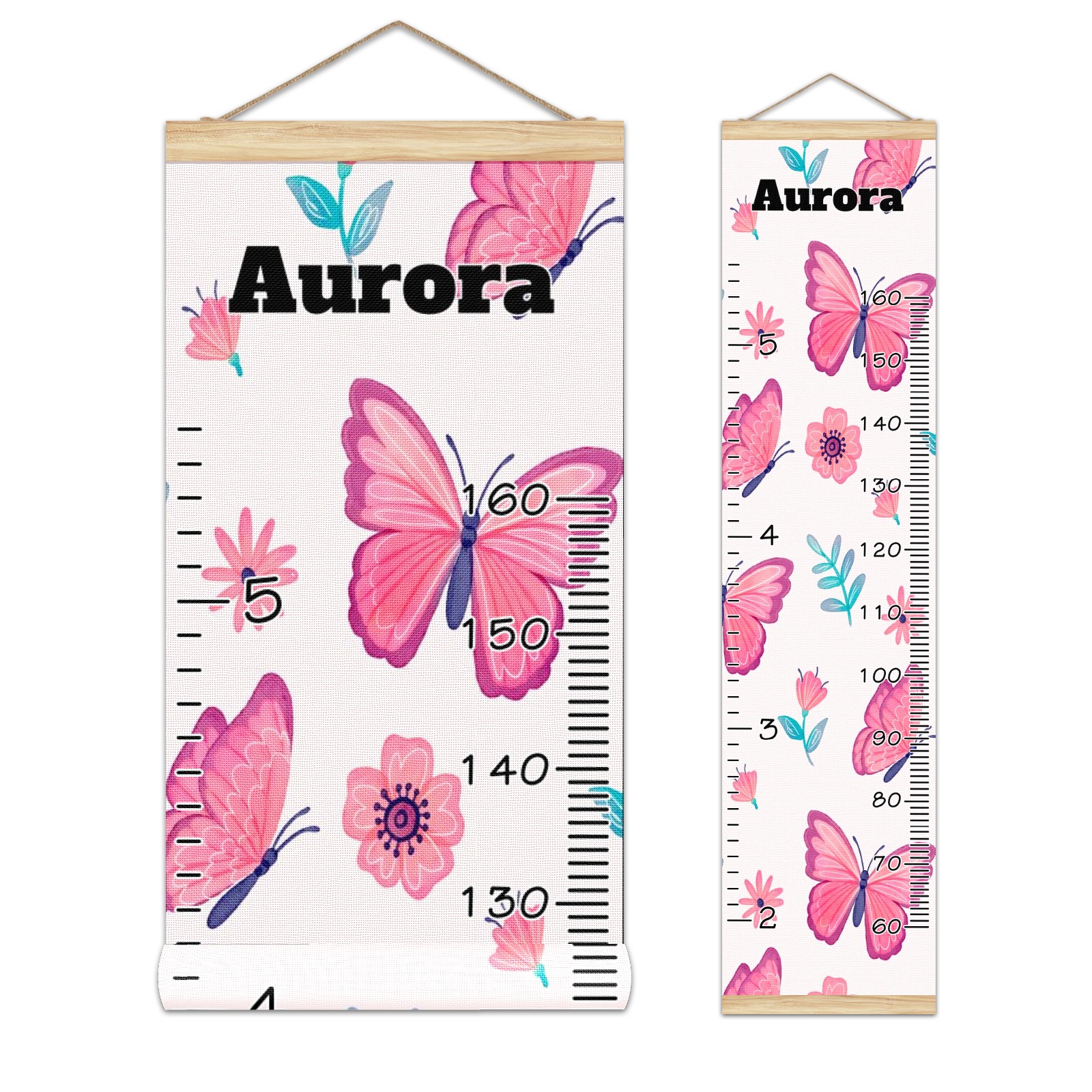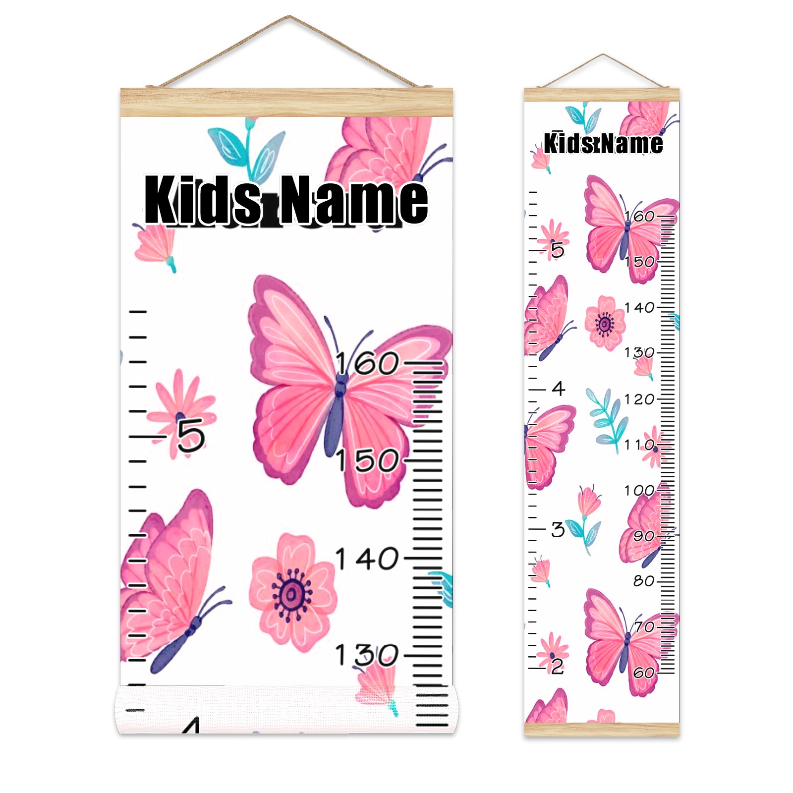 Personalized Kids Name Growth Chart Ruler for Wall Wood Frame Canvas Height Measure Chart 13.4x56 in Hanging Growth Chart Pink Butterfly & Flower11.14 Boys Girls Room Decor