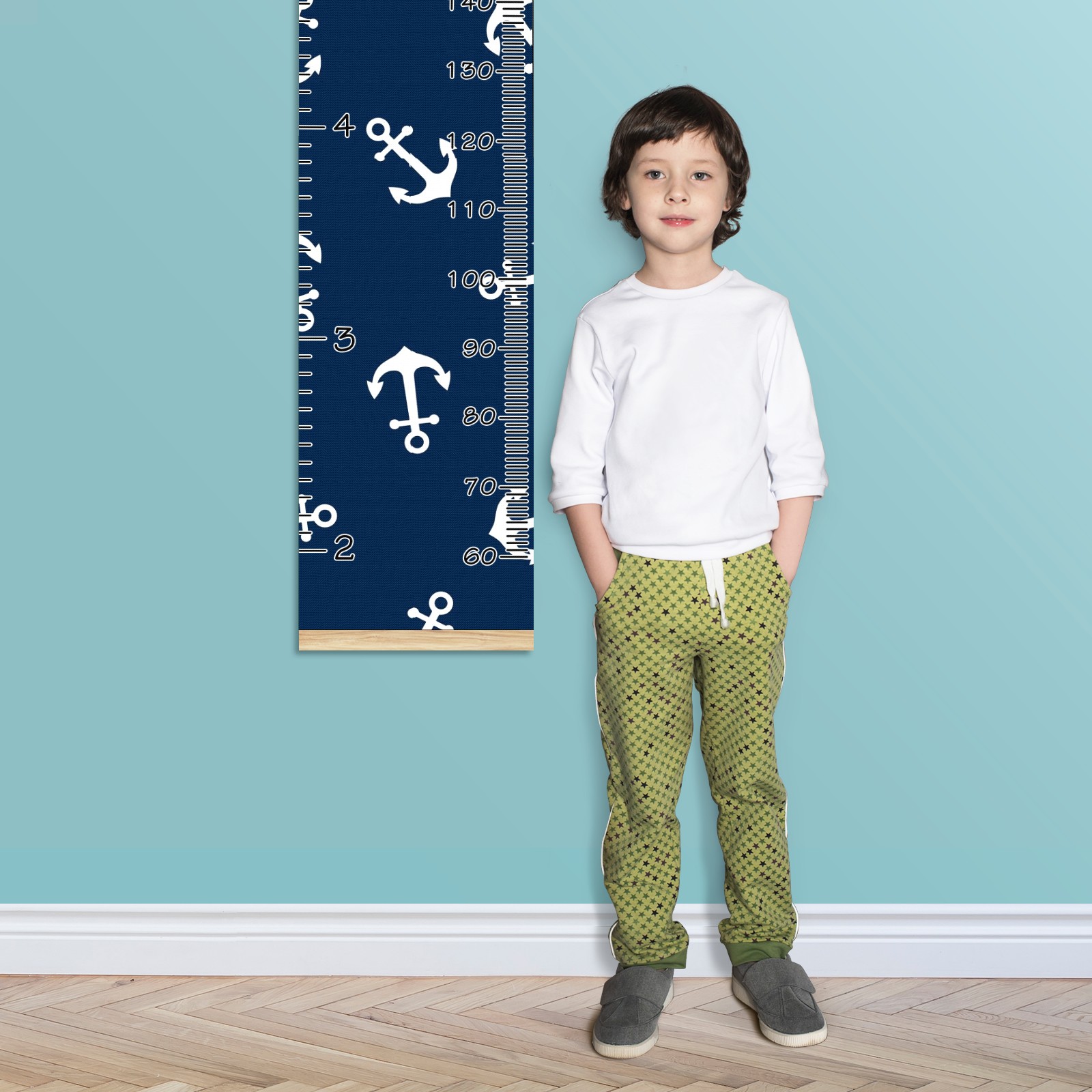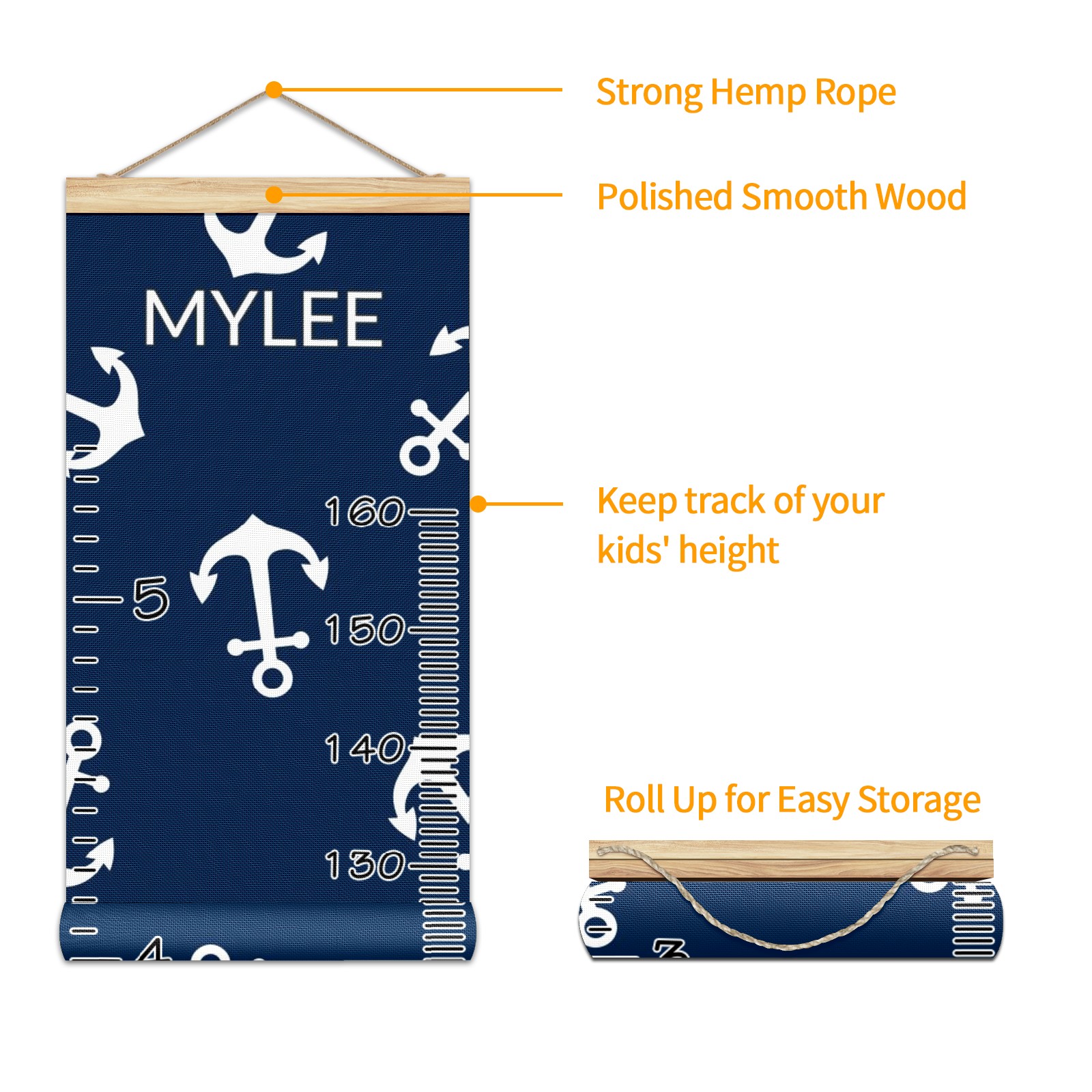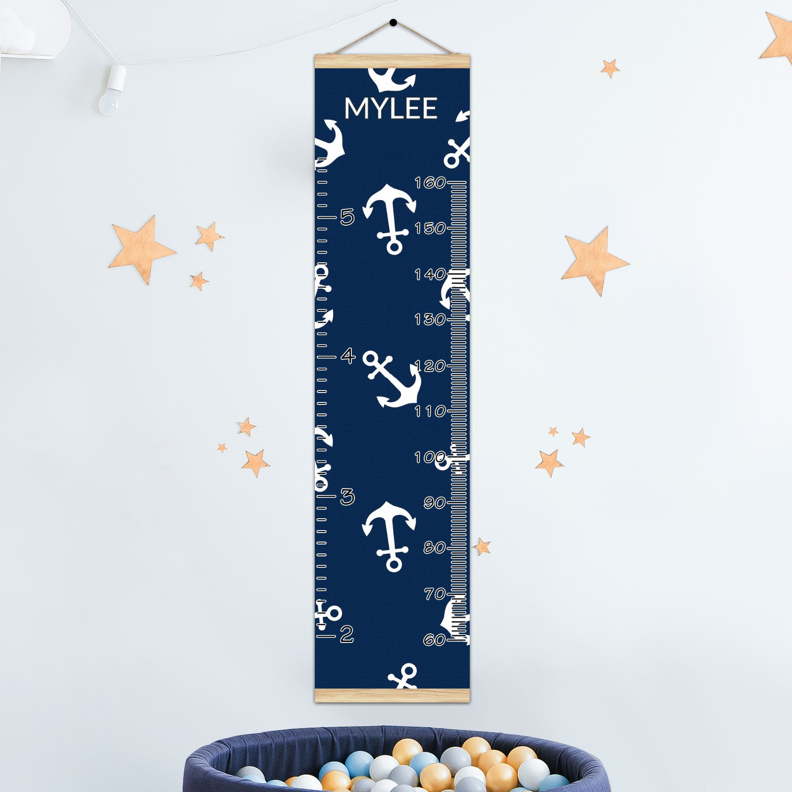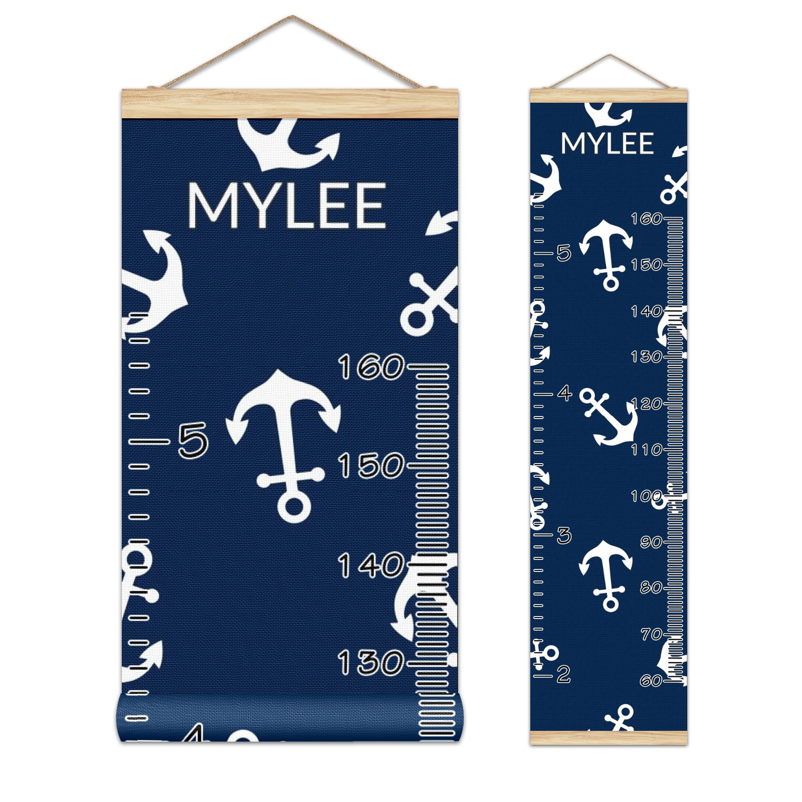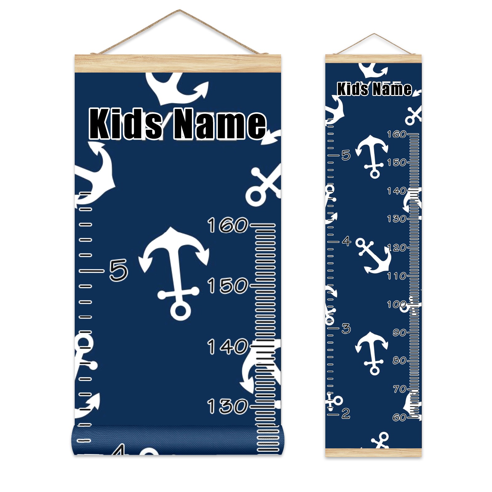 Personalized Kids Name Growth Chart Ruler for Wall Wood Frame Canvas Height Measure Chart 13.4x56 in Hanging Growth Chart Nautical Anchor Navy Blue11.17 Boys Girls Room Decor