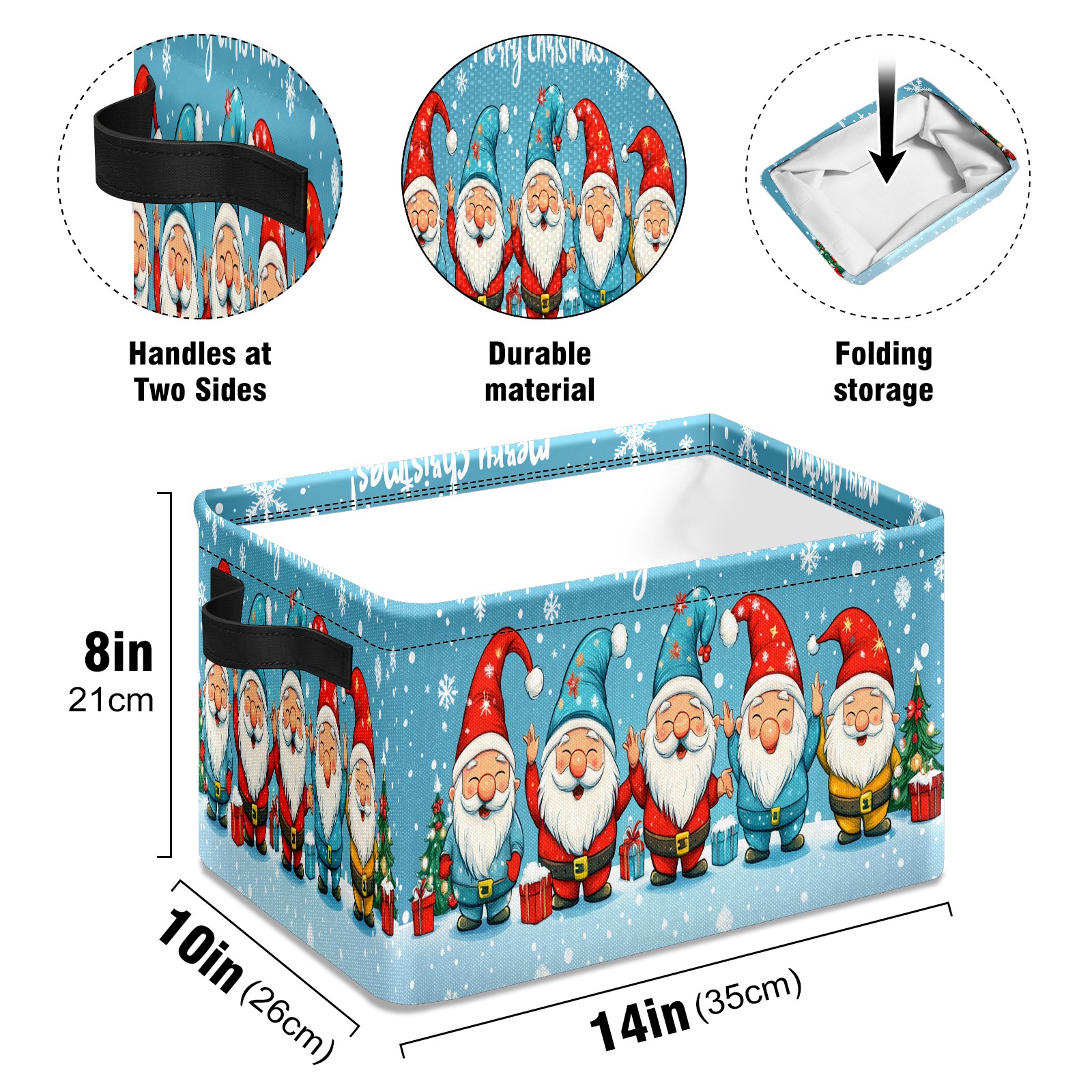<p>This storage basket can be used for a variety of purposes, including bedroom organization baskets, laundry storage boxes, toy storage boxes, bathroom towel cube storage boxes, toilet storage containers, book and magazine storage boxes, holiday decoration storage cubes, living room storage, etc. The spacious size of 10×14×8 inches gives it ample storage capacity. This Christmas-themed storage basket is a great household item that combines practicality with a festive atmosphere! Made of easy-to-clean Oxford cloth, daily dirt can be cleaned by gently wiping with mild soapy water. With a sturdy metal frame and hard bottom support, it ensures a crisp shape when stored, but also needs to avoid machine washing to extend its service life. It is lightweight and flat after folding, taking up no space</p>