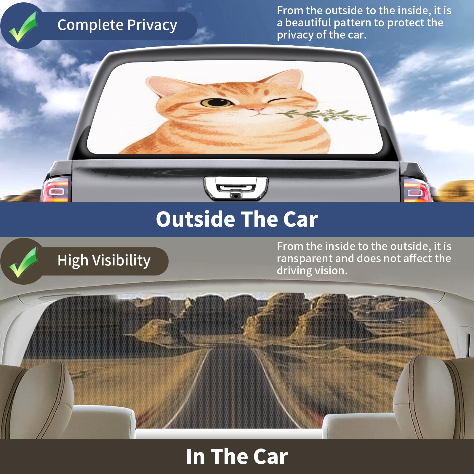 • <p>This car's rear window decoration sticker measures 66 ''x22' '(with an additional 2 inches reserved for easy installation) and is compatible with most pickup trucks, SUVs, and sedans in universal specifications. Our truck's rear window film is made of high-quality PVC vinyl material, which is waterproof, sun resistant, and weather resistant, effectively resisting ultraviolet rays and preventing fading. Unique one-way transparent design, opaque pattern from the outside, protecting privacy inside the car; The view inside the car is clear and transparent, without affecting the observation of the road conditions outside the car. Easy installation, easy to locate by tearing off the sticker, and excess parts can be cut and removed; Easy disassembly without residue. Dazzling design paired with vibrant colors, making your car stand out instantly and increasing its return rate<br></p>