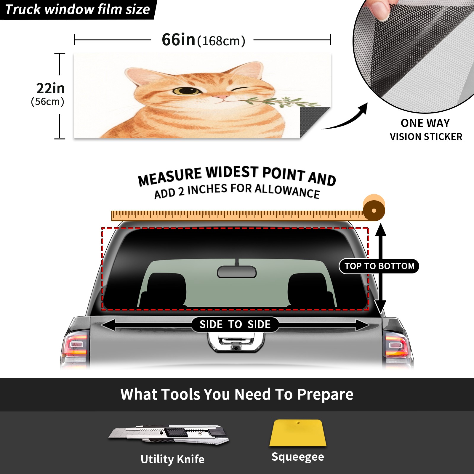 <p>This car's rear window decoration sticker measures 66 ''x22' '(with an additional 2 inches reserved for easy installation) and is compatible with most pickup trucks, SUVs, and sedans in universal specifications. Our truck's rear window film is made of high-quality PVC vinyl material, which is waterproof, sun resistant, and weather resistant, effectively resisting ultraviolet rays and preventing fading. Unique one-way transparent design, opaque pattern from the outside, protecting privacy inside the car; The view inside the car is clear and transparent, without affecting the observation of the road conditions outside the car. Easy installation, easy to locate by tearing off the sticker, and excess parts can be cut and removed; Easy disassembly without residue. Dazzling design paired with vibrant colors, making your car stand out instantly and increasing its return rate<br></p>