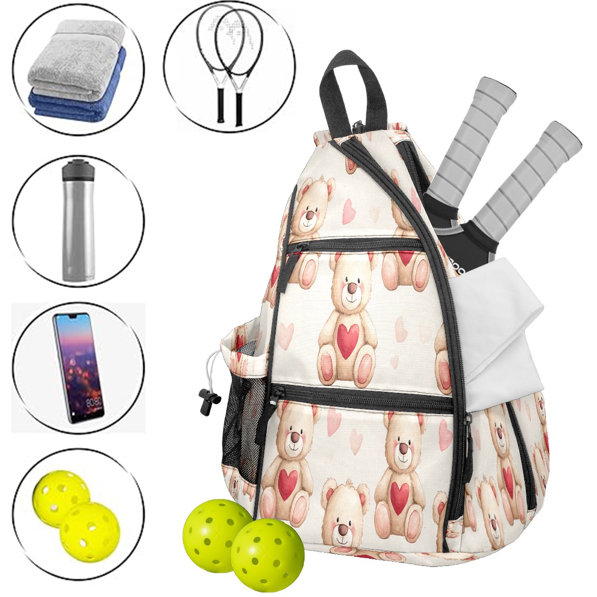 Pickleball Bag with Padded Back, Beige Teddy Bears Multi-Compartment Paddle Backpack, Lightweight Nylon Sports Bag for Men & Women