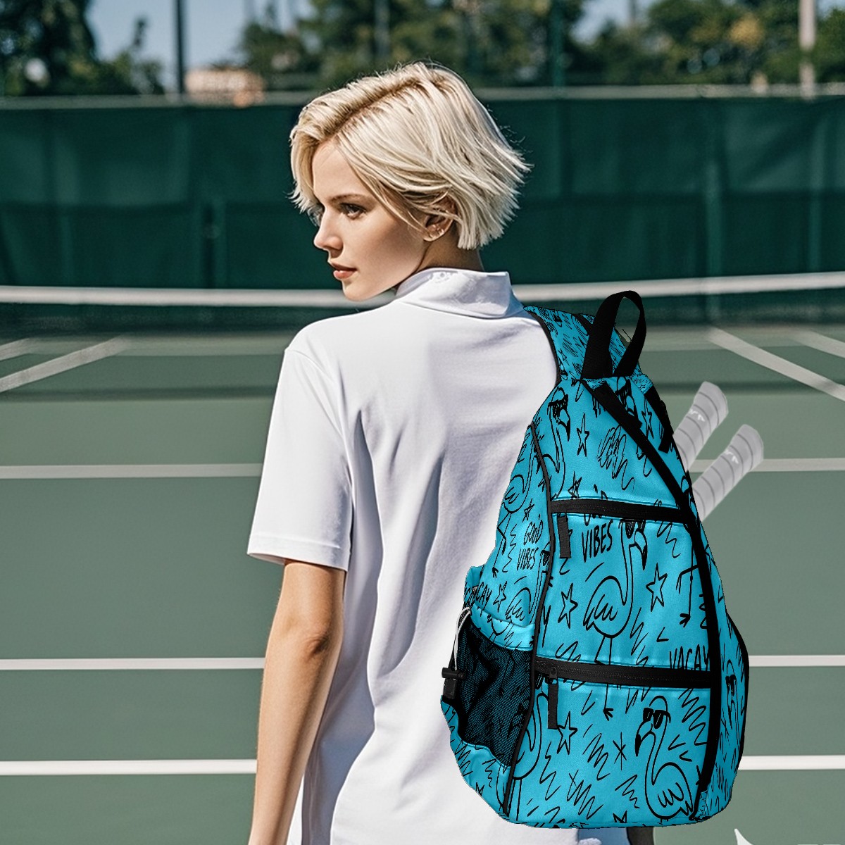 Pickleball Bag with Padded Back, Blue Flamingos Vacay Multi-Compartment Paddle Backpack, Lightweight Nylon Sports Bag for Men & Women