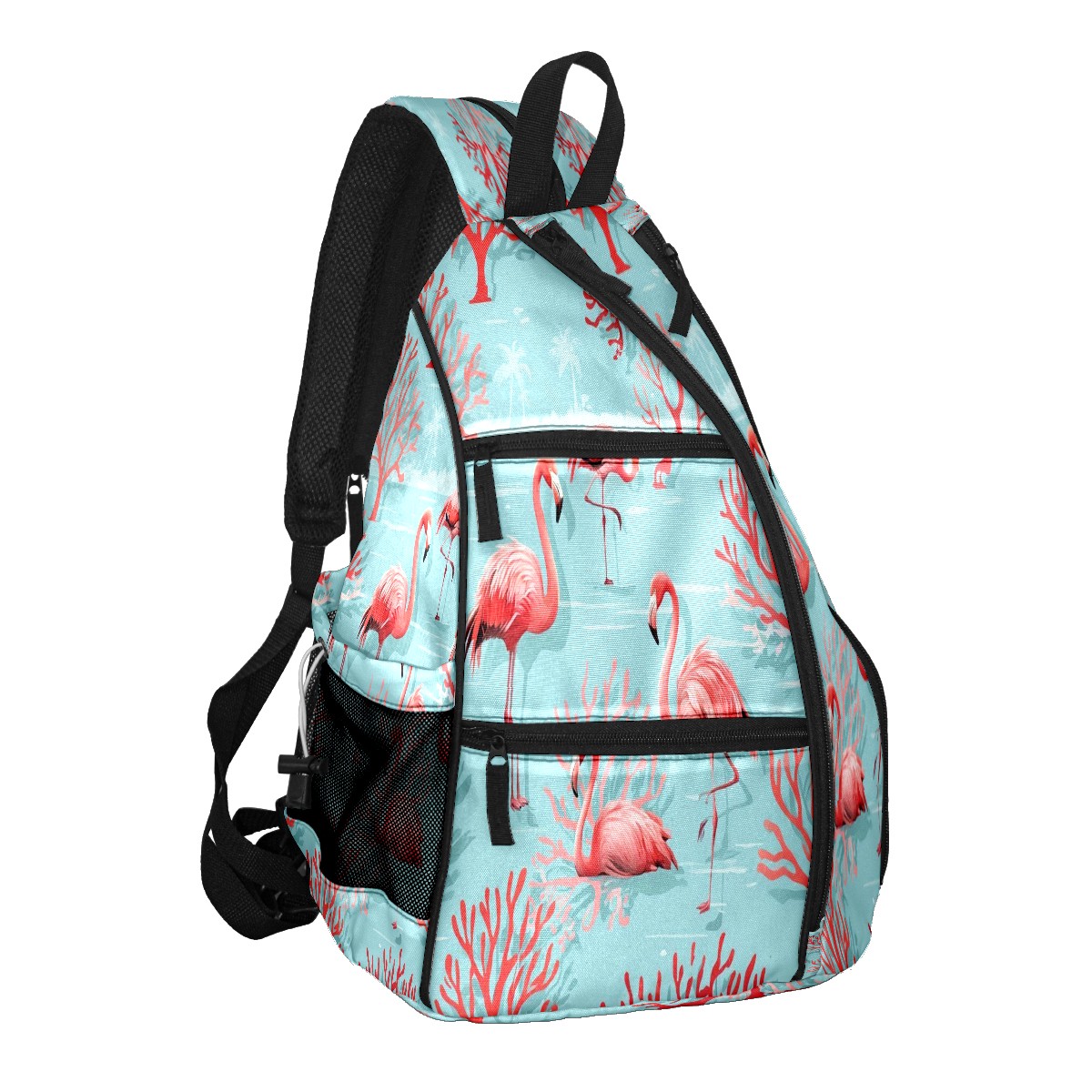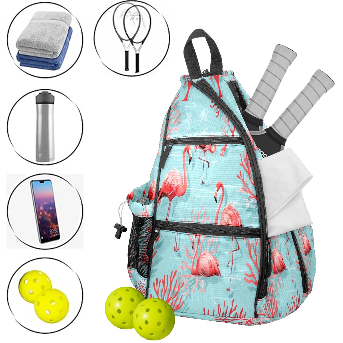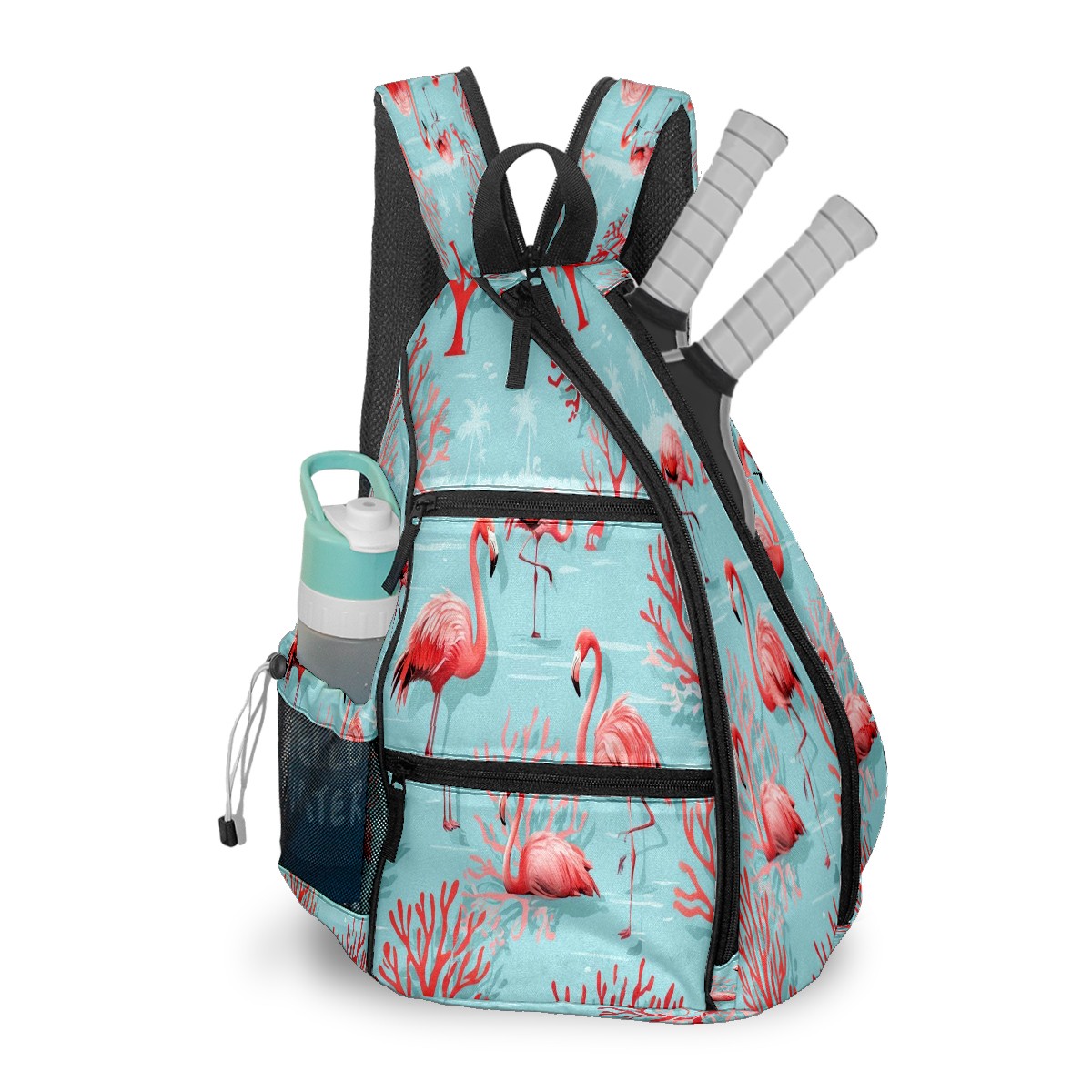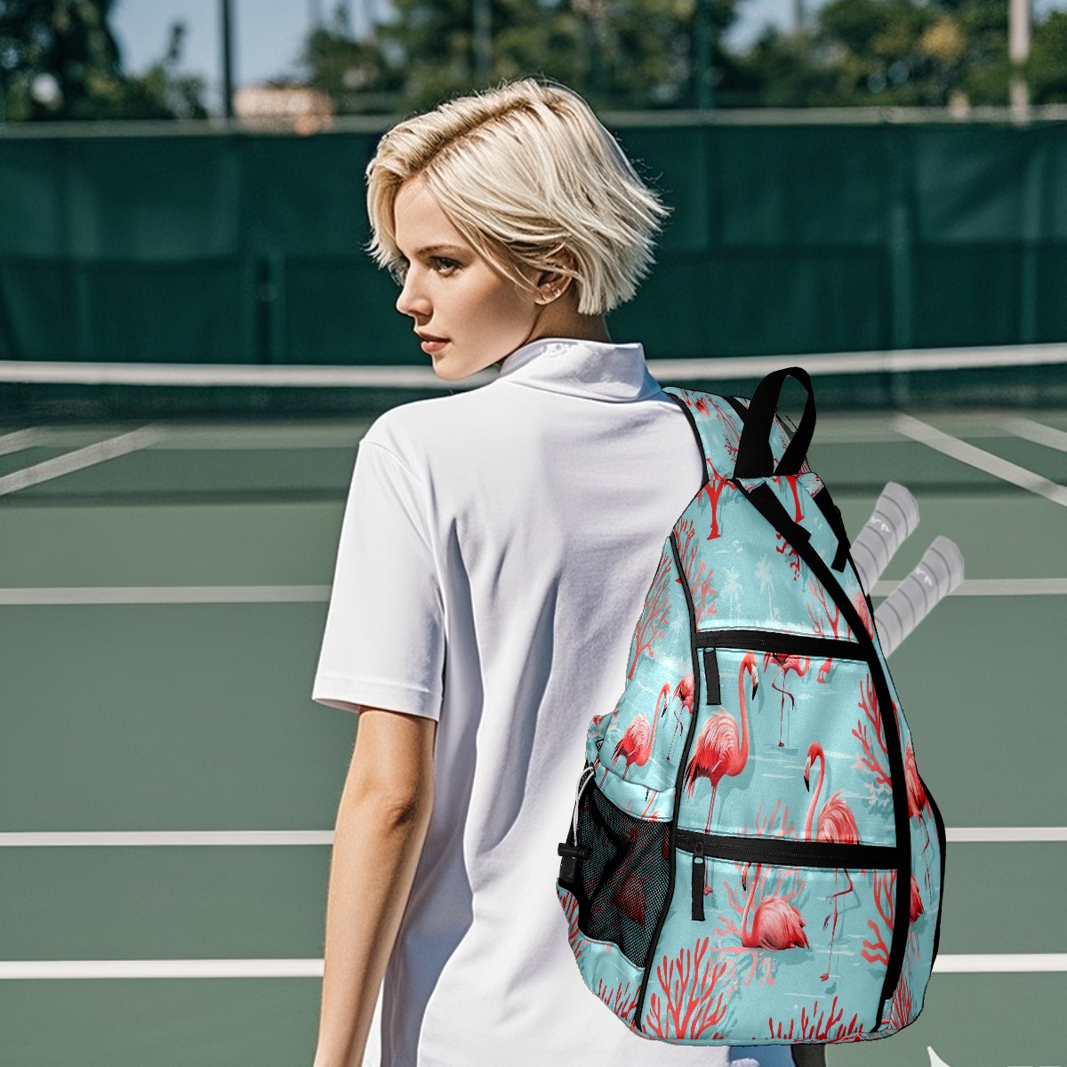 Pickleball Bag with Padded Back, Blue Flamingos Corals Multi-Compartment Paddle Backpack, Lightweight Nylon Sports Bag for Men & Women