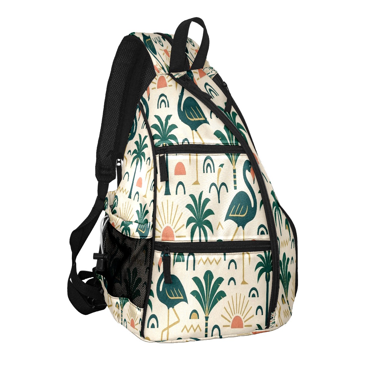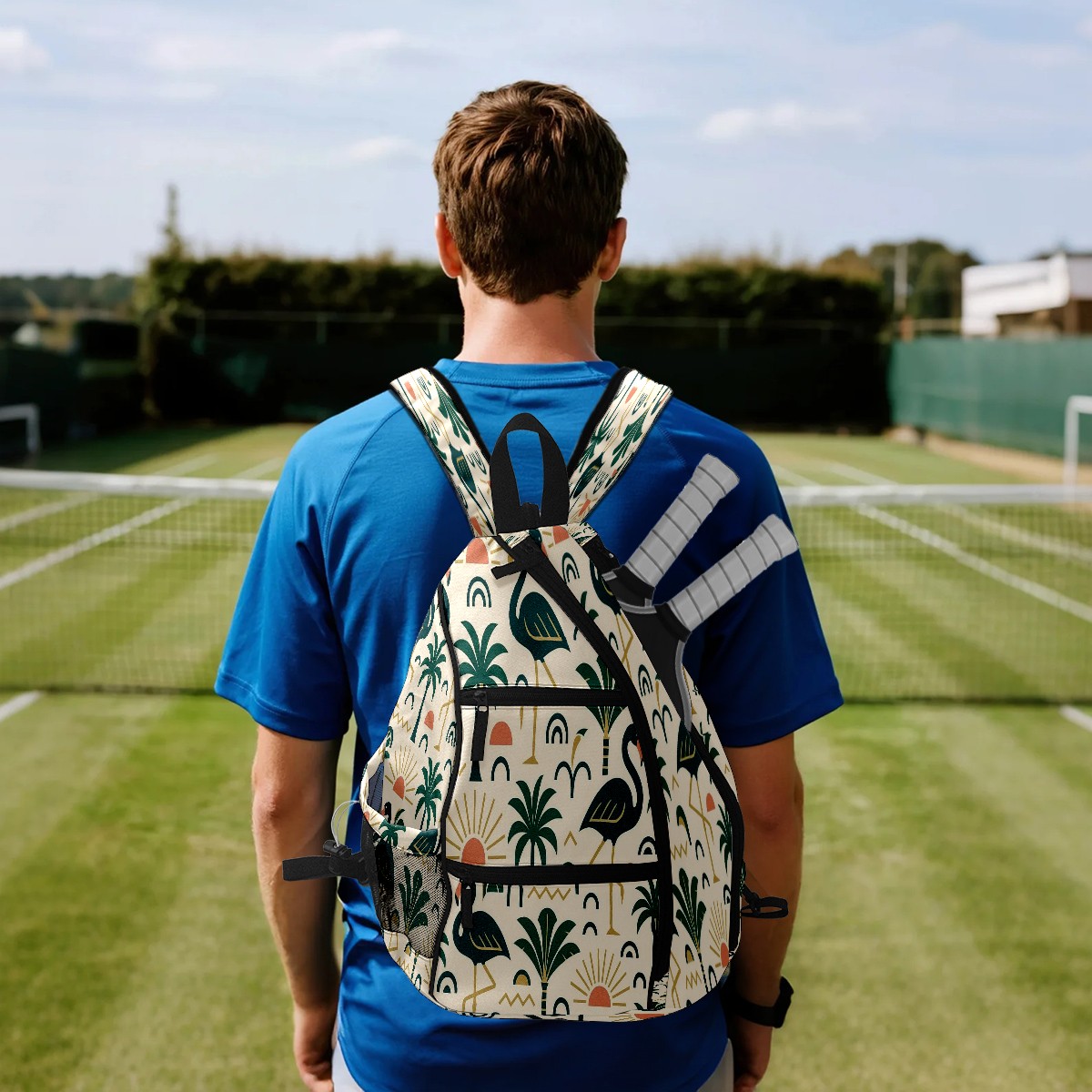 Pickleball Bag with Padded Back, Green Flamingos Palms Multi-Compartment Paddle Backpack, Lightweight Nylon Sports Bag for Men & Women