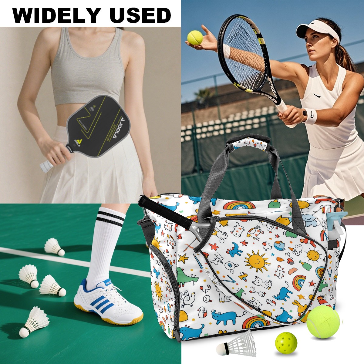<p>This pickleball bag measures 8.7in x 18.9in x 13.8in and features a practical and versatile design. It includes dedicated racket/gear pockets, a ventilated shoe compartment (fits size 10 sneakers), and a waterproof wet bag to separate items and isolate odors. A fence hook allows you to hang the bag off the ground for easy access. It can be carried by hand or crossbody, making it suitable for both men and women. It's perfect for not only pickleball, but also badminton, squash, fitness, and short trips. It combines fashion and functionality, making it a perfect gift for birthdays, Mother's Day, and other occasions.</p>