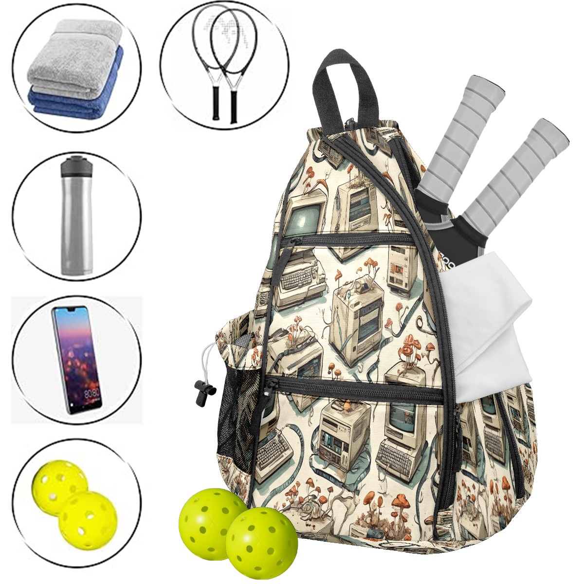 Print Pickleball Backpack Beige Computers | Padded 6-Paddle Compartment & Separate Shoe Bag | Multi-Pocket Sports & Gym Backpack for Tennis, Travel, Commute