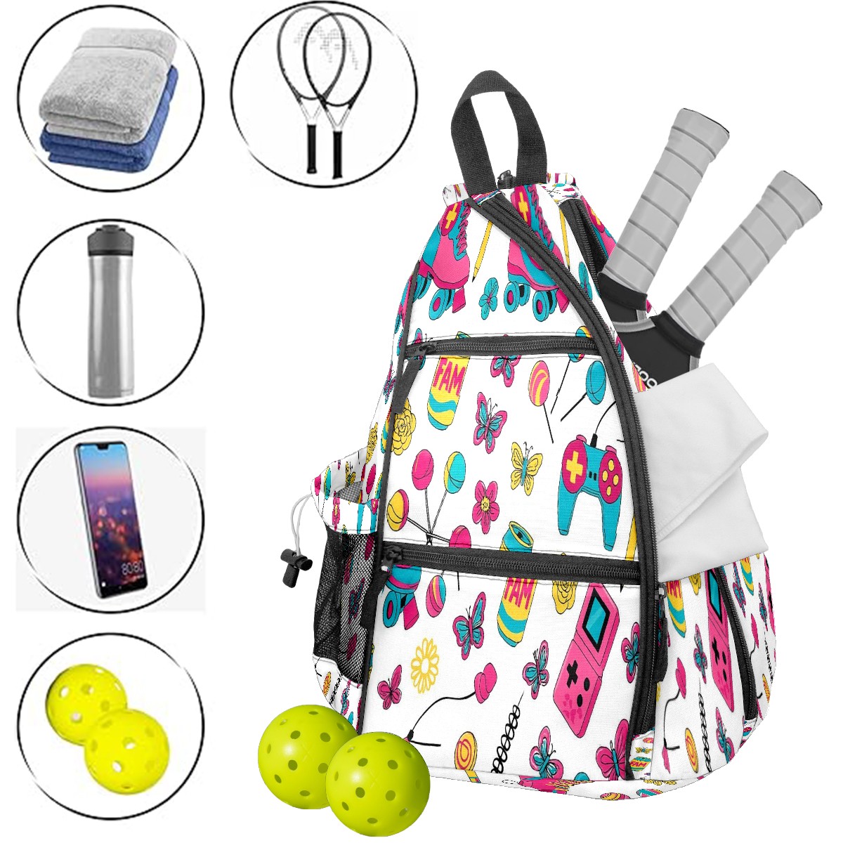 Print Pickleball Backpack Multicolor Retro Games | Padded 6-Paddle Compartment & Separate Shoe Bag | Multi-Pocket Sports & Gym Backpack for Tennis, Travel, Commute