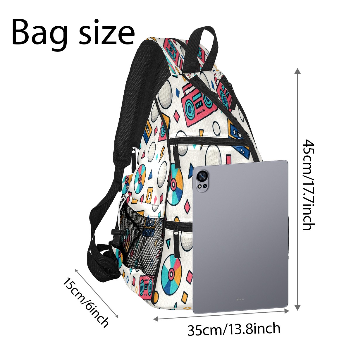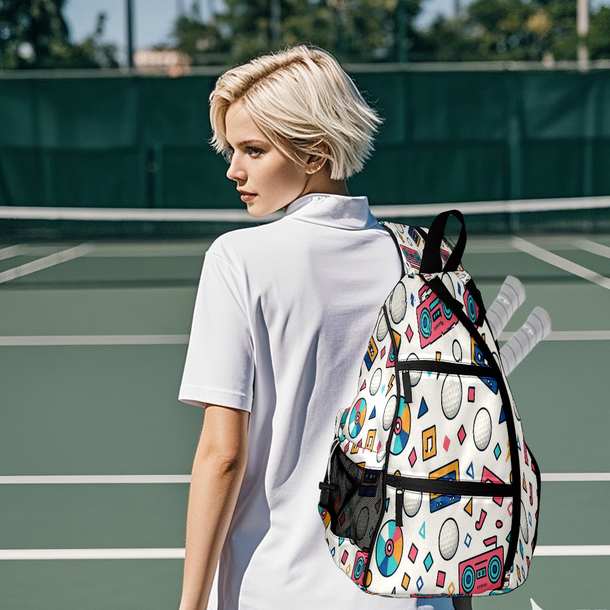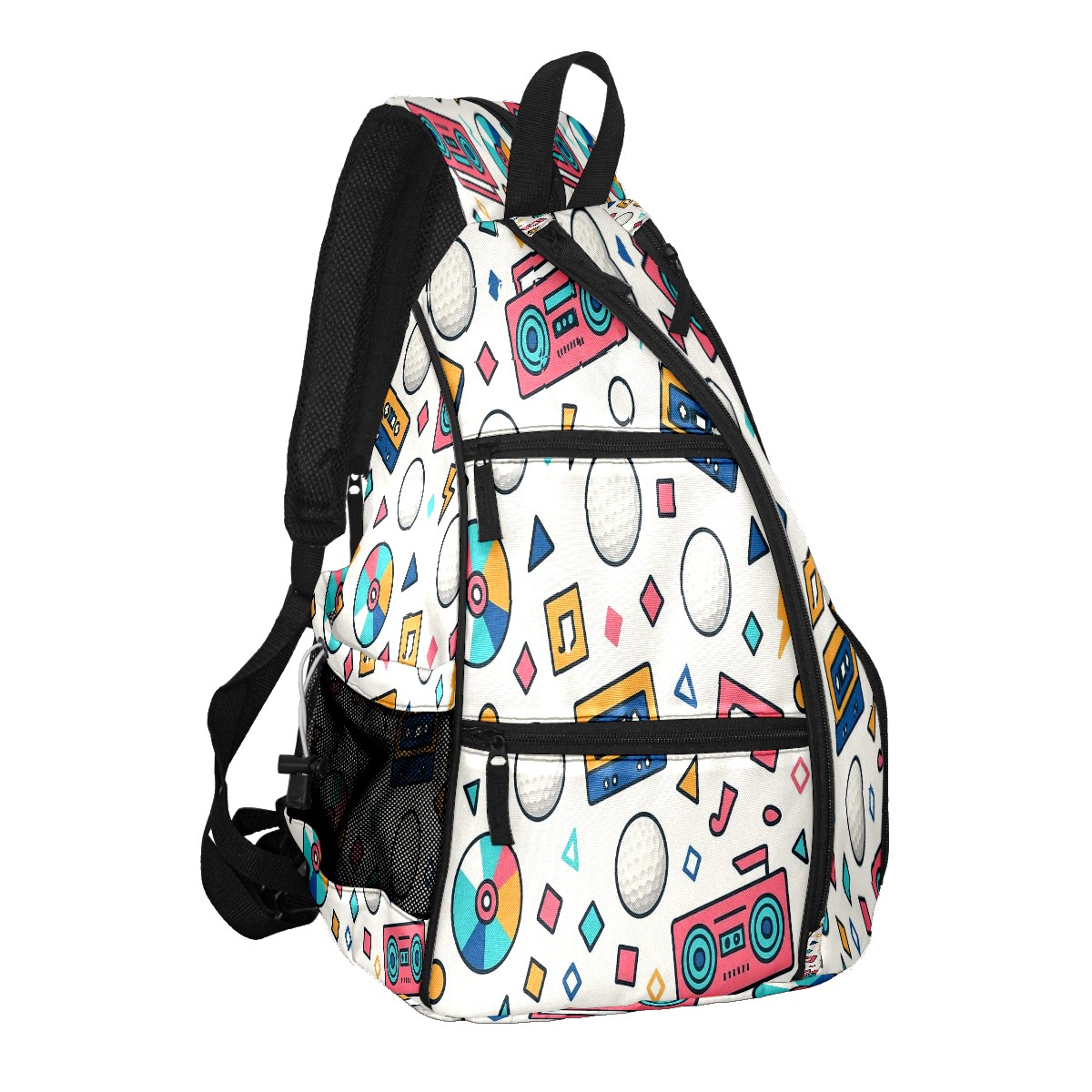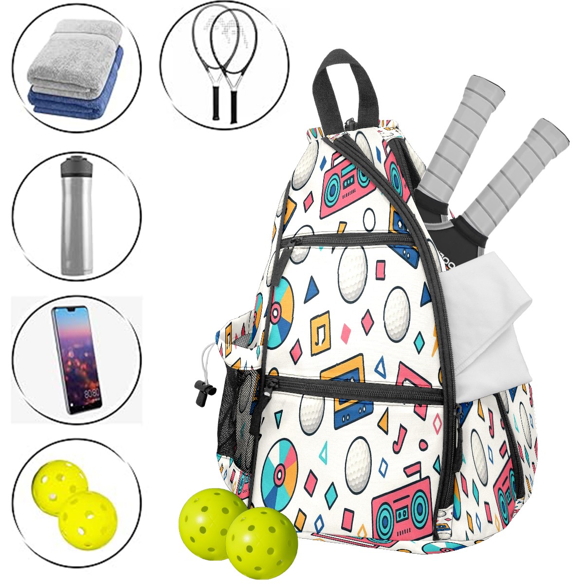 Print Pickleball Backpack Multicolor Retro Music | Padded 6-Paddle Compartment & Separate Shoe Bag | Multi-Pocket Sports & Gym Backpack for Tennis, Travel, Commute