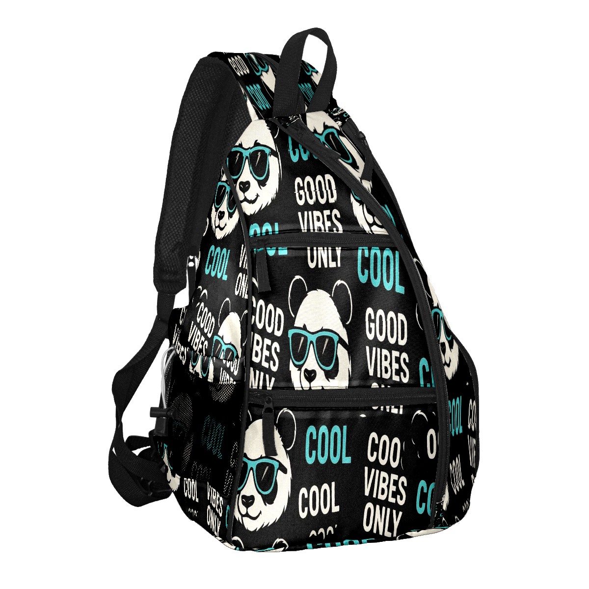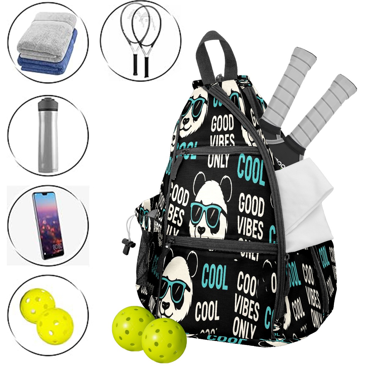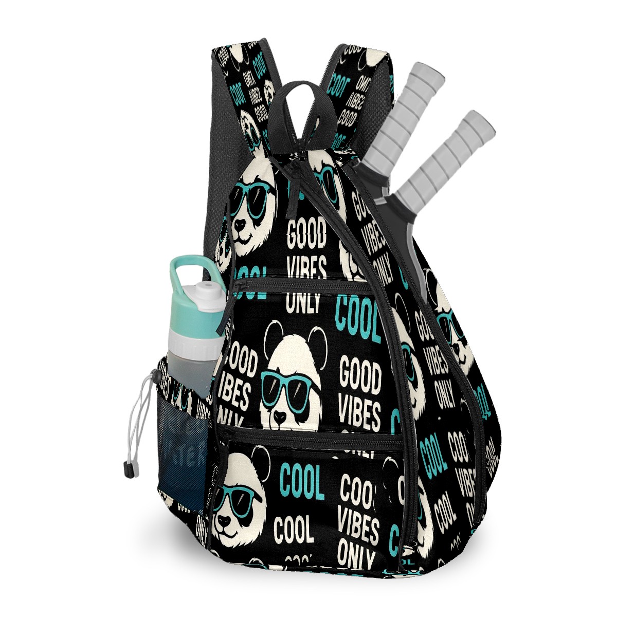 Print Pickleball Backpack Black Funny Pandas | Padded 6-Paddle Compartment & Separate Shoe Bag | Multi-Pocket Sports & Gym Backpack for Tennis, Travel, Commute