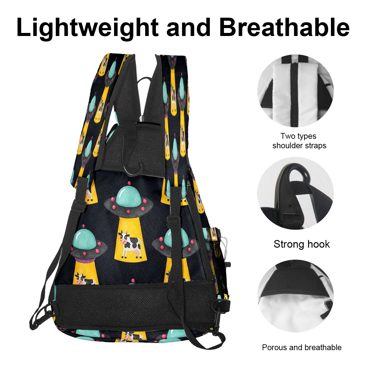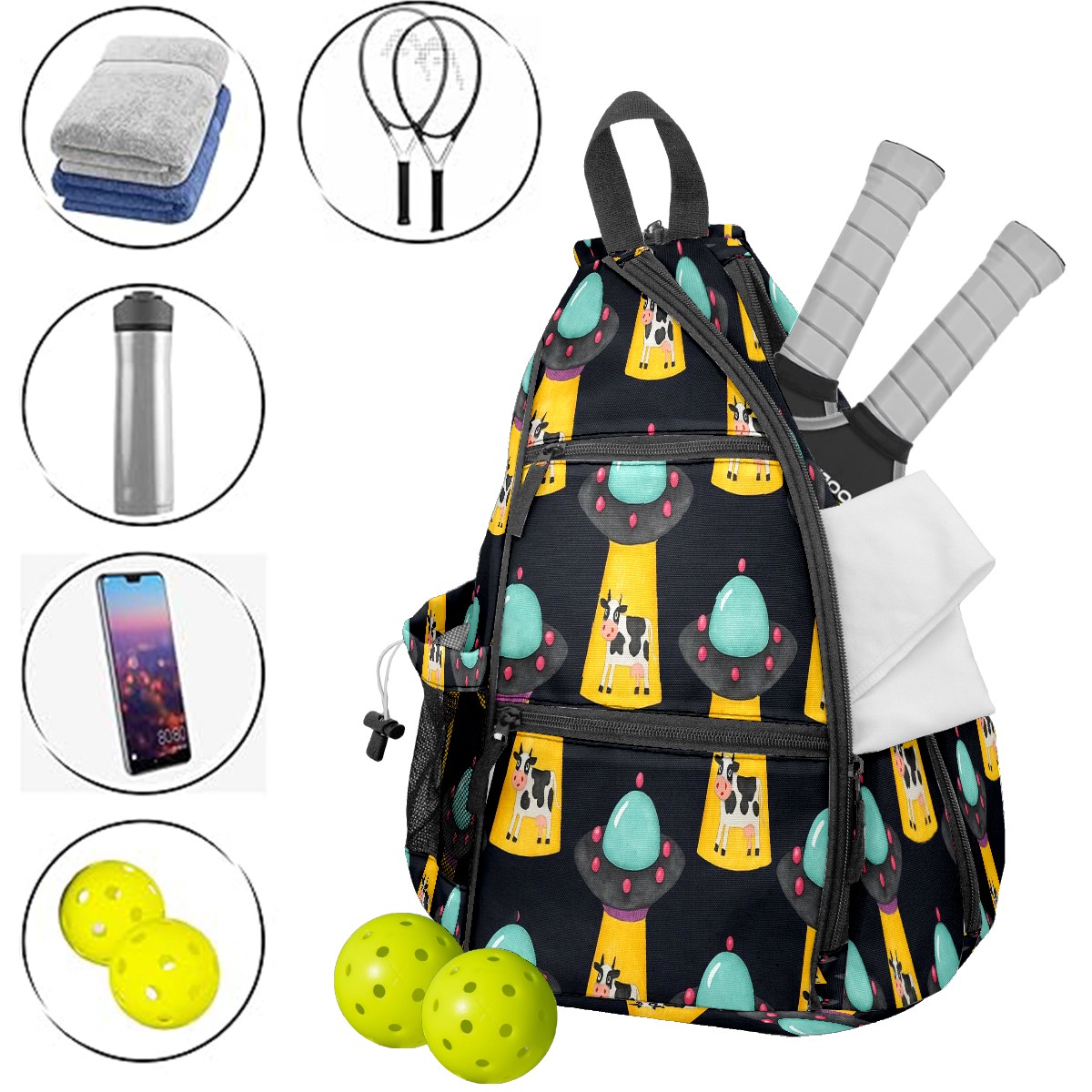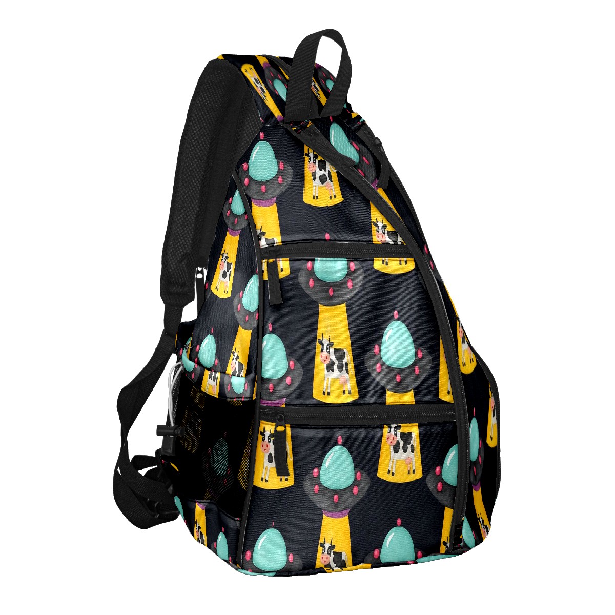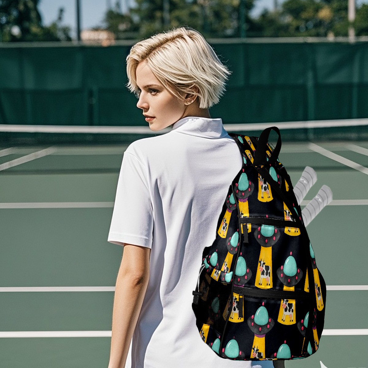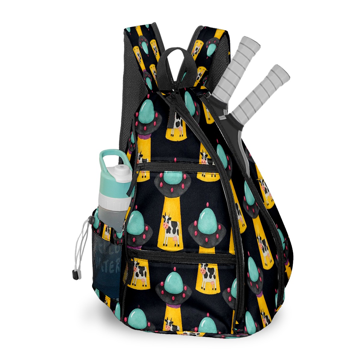 Print Pickleball Backpack Black UFO Cows | Padded 6-Paddle Compartment & Separate Shoe Bag | Multi-Pocket Sports & Gym Backpack for Tennis, Travel, Commute