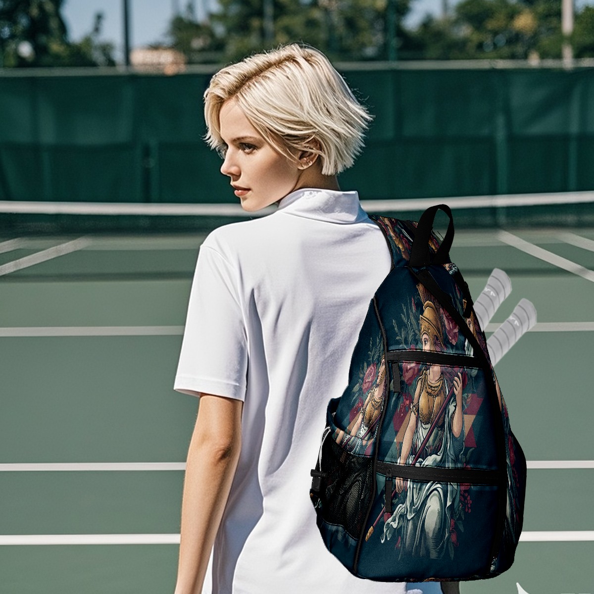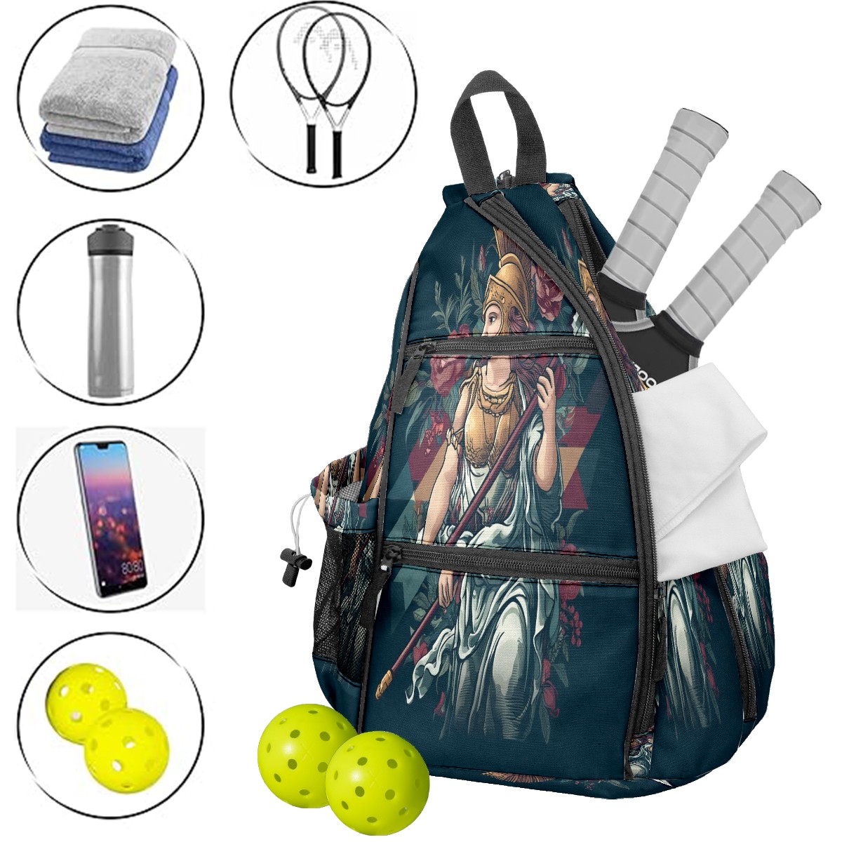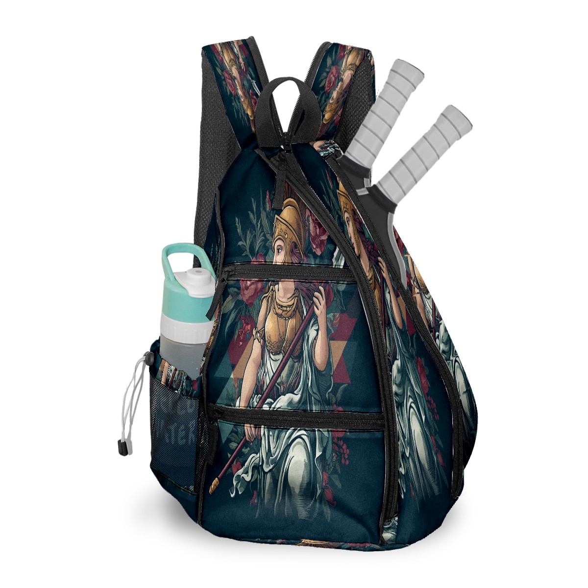 Print Pickleball Backpack Black Greek Goddess | Padded 6-Paddle Compartment & Separate Shoe Bag | Multi-Pocket Sports & Gym Backpack for Tennis, Travel, Commute