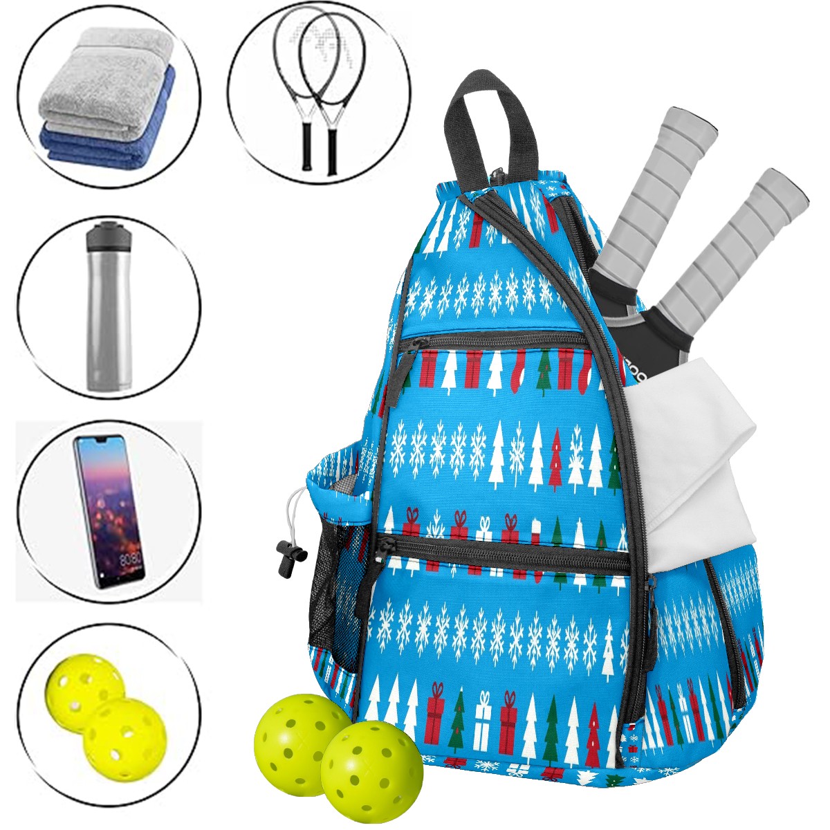 Print Pickleball Backpack Xmas Snowflake BlueWhite Floral | Padded 6-Paddle Compartment & Separate Shoe Bag | Multi-Pocket Sports & Gym Backpack for Tennis, Travel, Commute