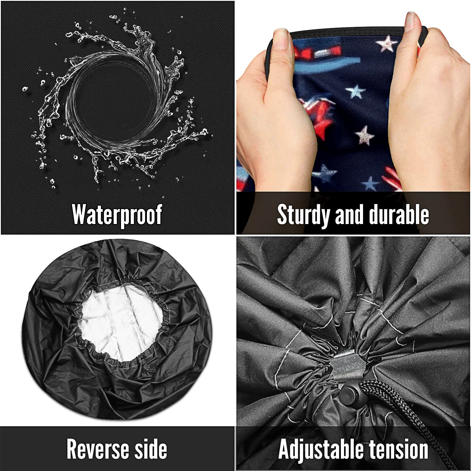 • <p>Keep your spare tire protected and your vehicle looking sharp with our universal Tire Cover. Designed with a sleek single-sided print and classic black sides, this durable cover is made from high-quality polyester fabric that is fully waterproof. The adjustable nylon rope ensures a secure, custom fit for any tire, helping to maintain a clean and professional appearance for your vehicle.</p>