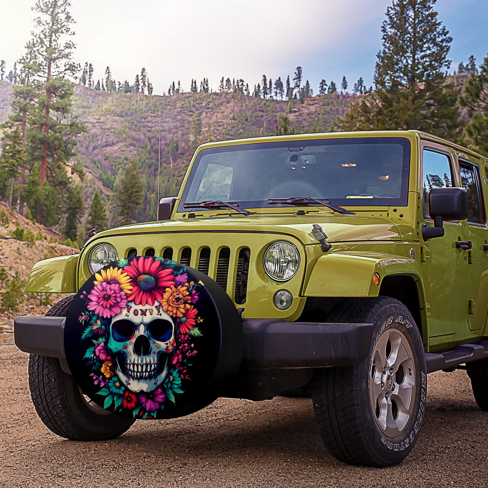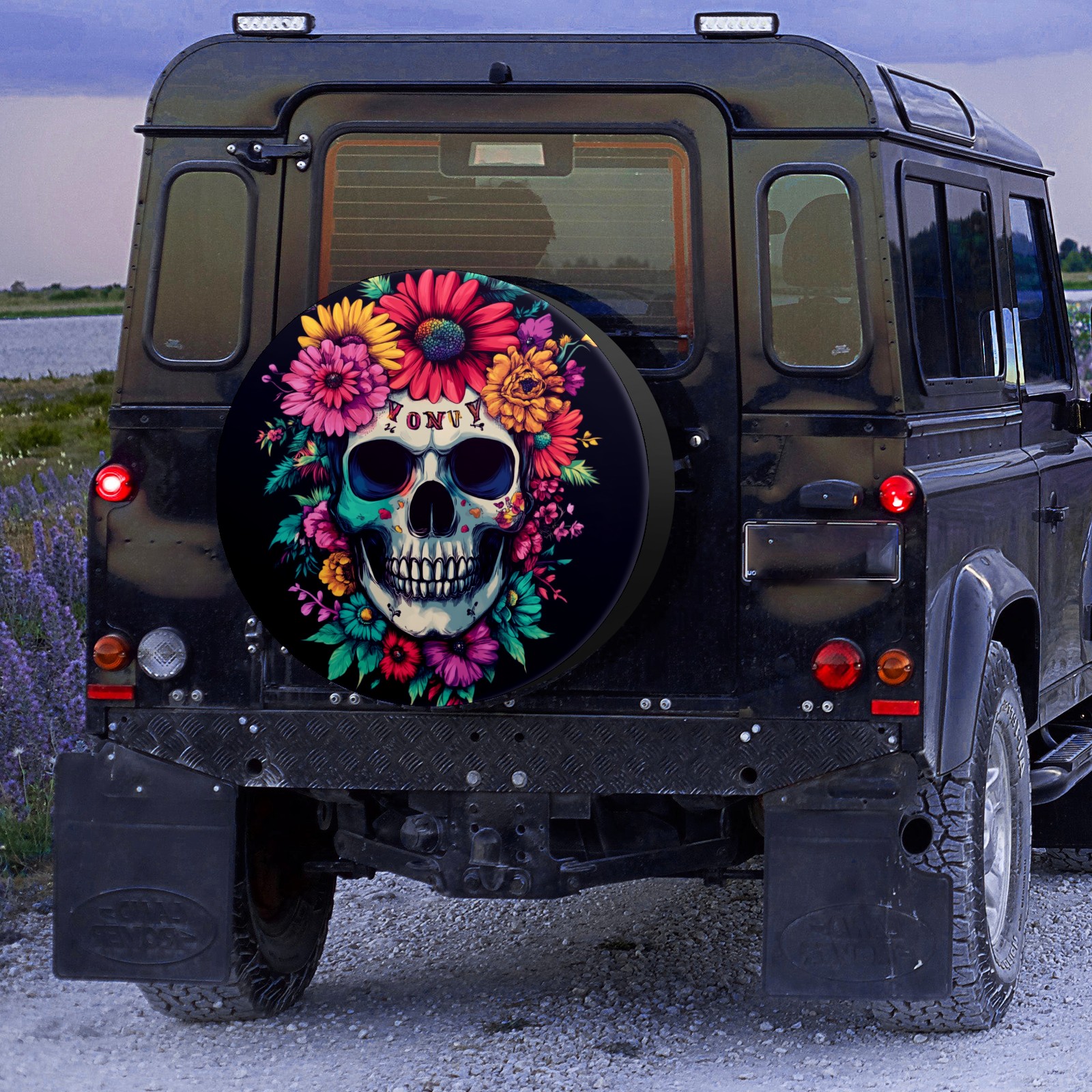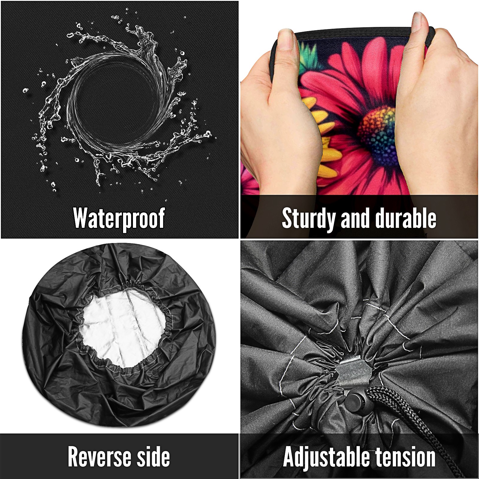 • <p>Keep your spare tire protected and your vehicle looking sharp with our universal Tire Cover. Designed with a sleek single-sided print and classic black sides, this durable cover is made from high-quality polyester fabric that is fully waterproof. The adjustable nylon rope ensures a secure, custom fit for any tire, helping to maintain a clean and professional appearance for your vehicle.</p>