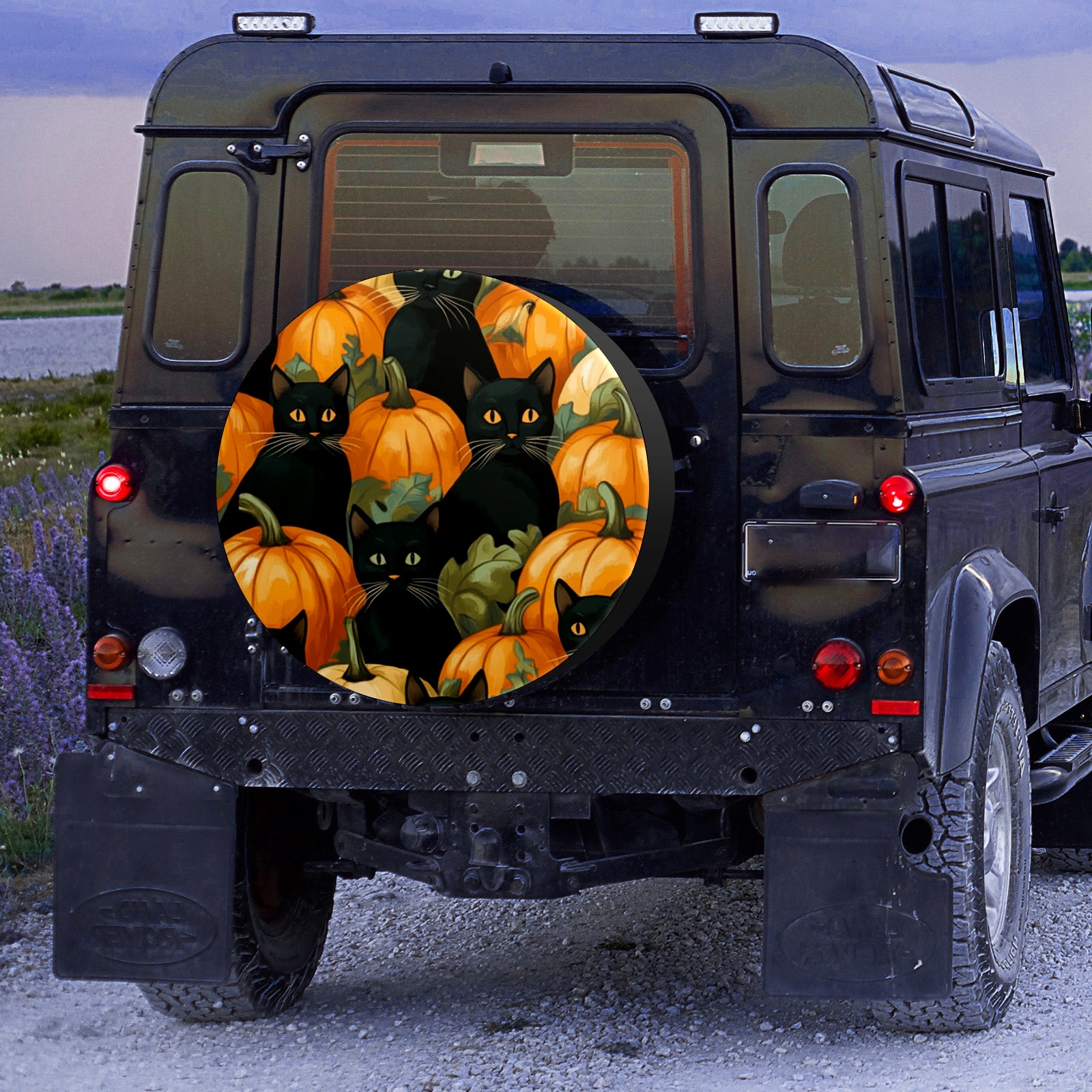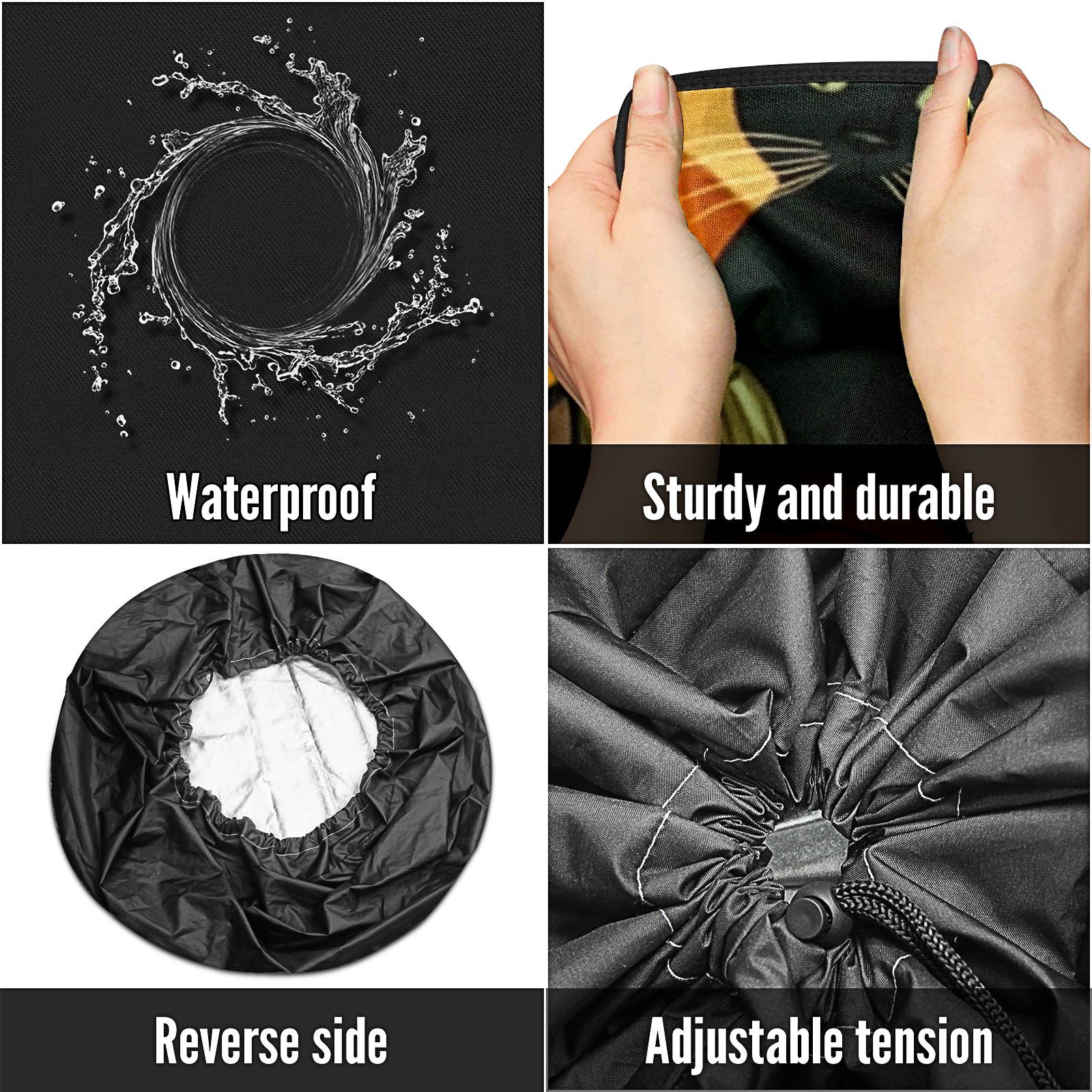 • <p>Keep your spare tire protected and your vehicle looking sharp with our universal Tire Cover. Designed with a sleek single-sided print and classic black sides, this durable cover is made from high-quality polyester fabric that is fully waterproof. The adjustable nylon rope ensures a secure, custom fit for any tire, helping to maintain a clean and professional appearance for your vehicle.</p>