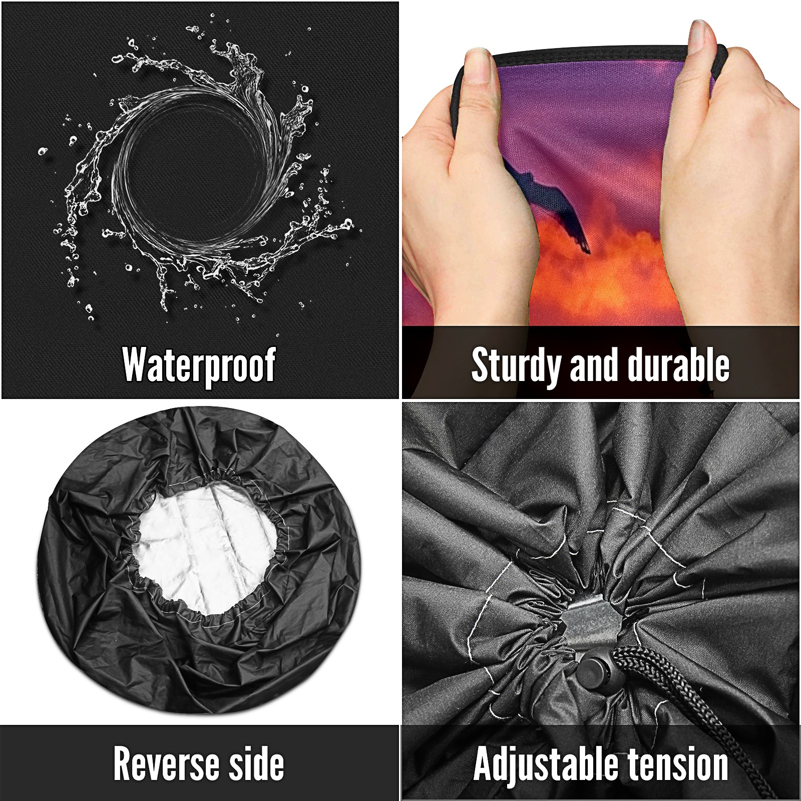 • <p>Keep your spare tire protected and your vehicle looking sharp with our universal Tire Cover. Designed with a sleek single-sided print and classic black sides, this durable cover is made from high-quality polyester fabric that is fully waterproof. The adjustable nylon rope ensures a secure, custom fit for any tire, helping to maintain a clean and professional appearance for your vehicle.</p>
