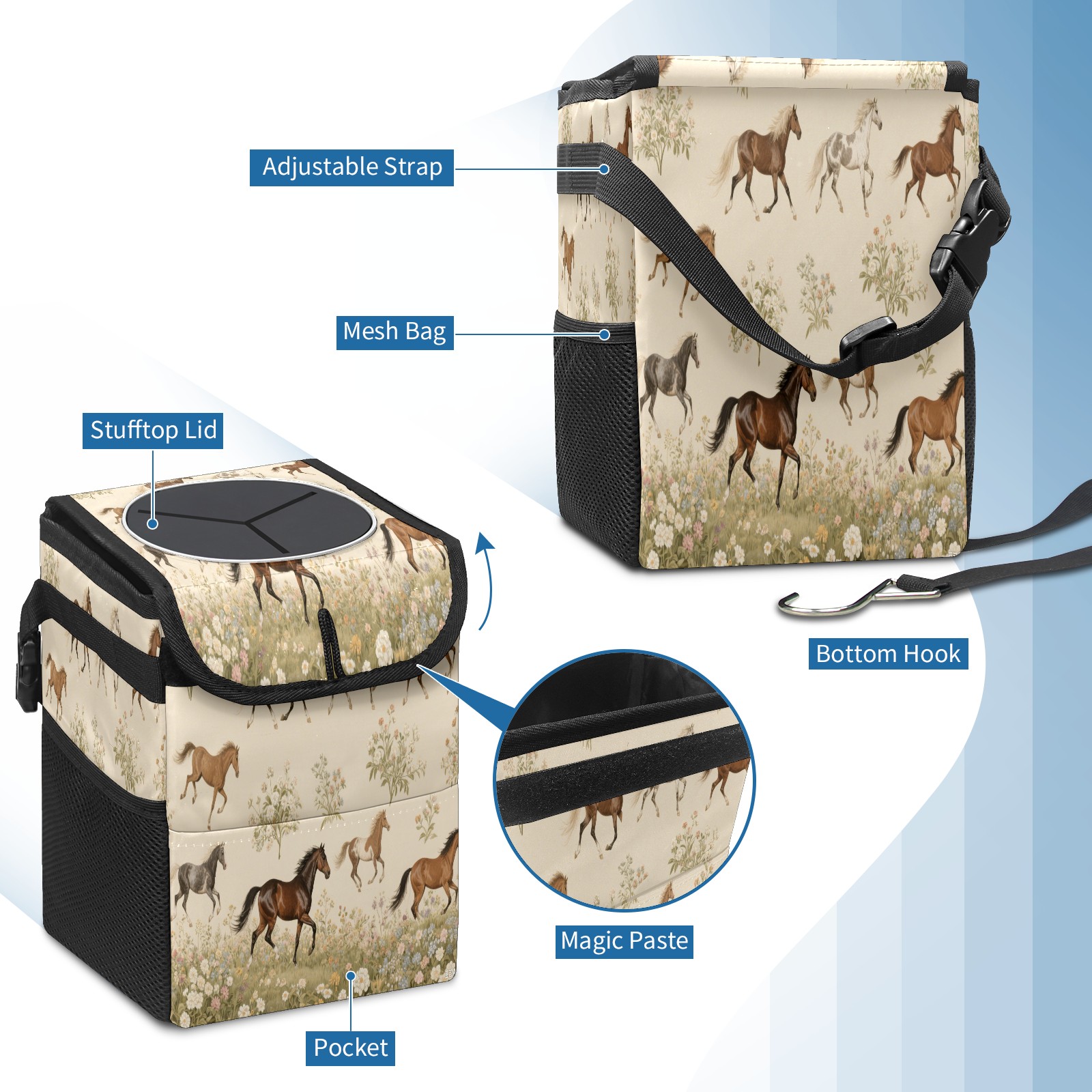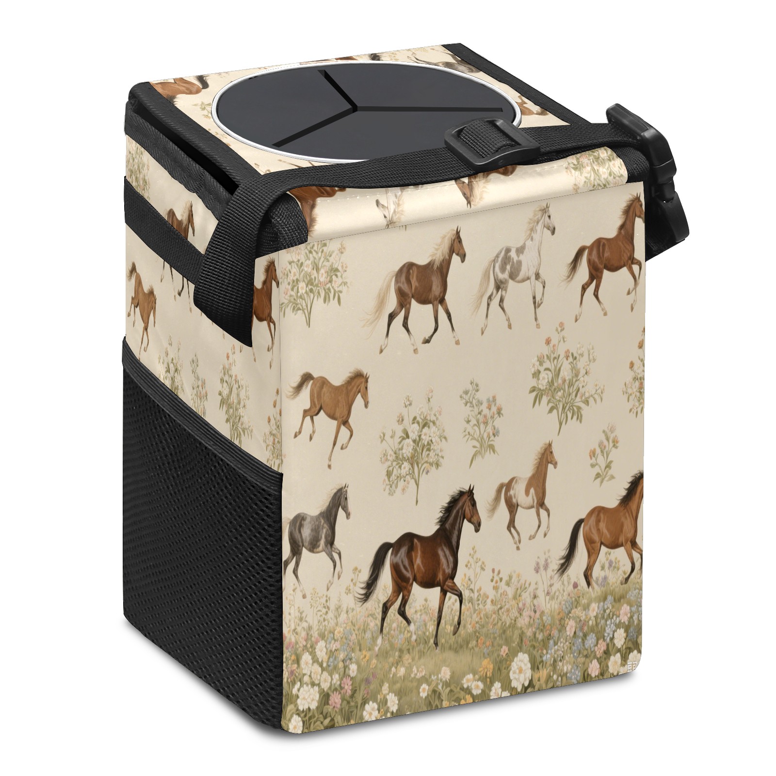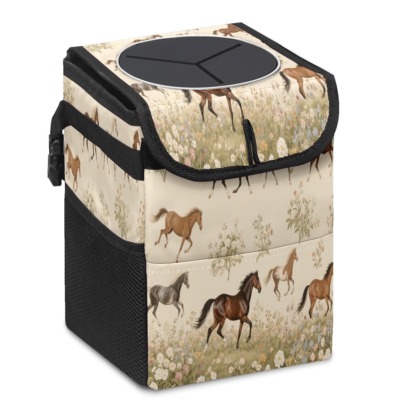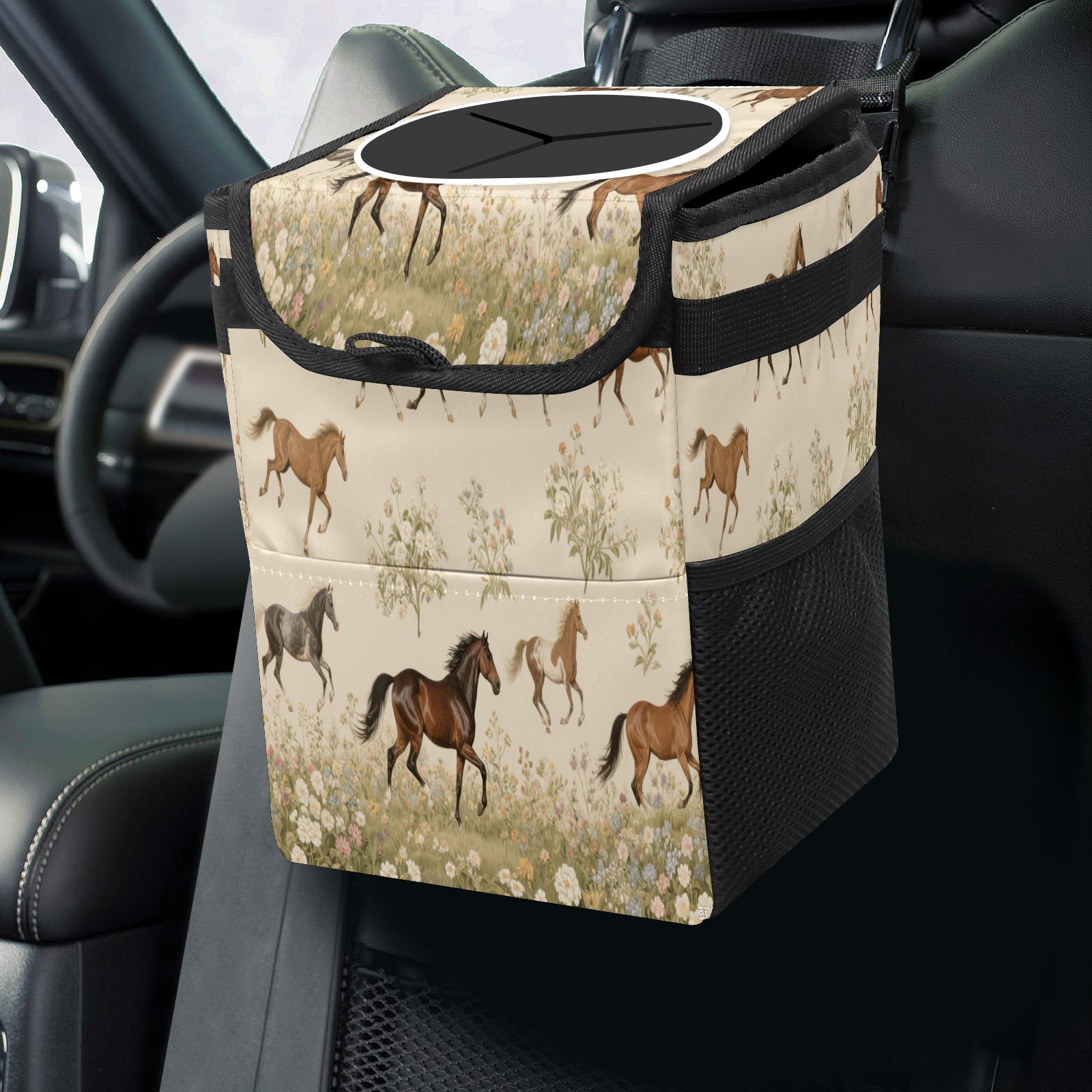 Car Trash Can with Lid & Multiple Pockets ,Foldable Vehicle Garbage Bin Waterproof & Leak Proof Automotive Garbage Cans Car Accessories for Women Men Road Trip Essentials Horses
