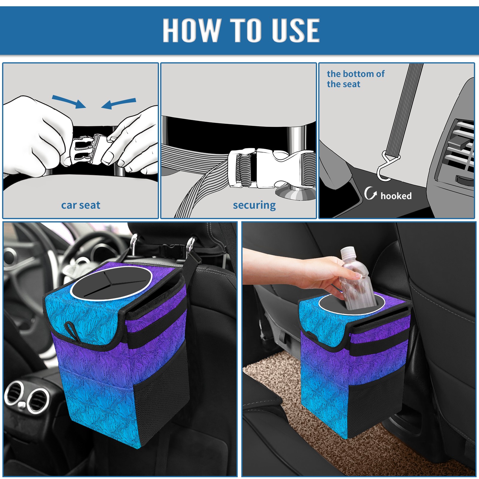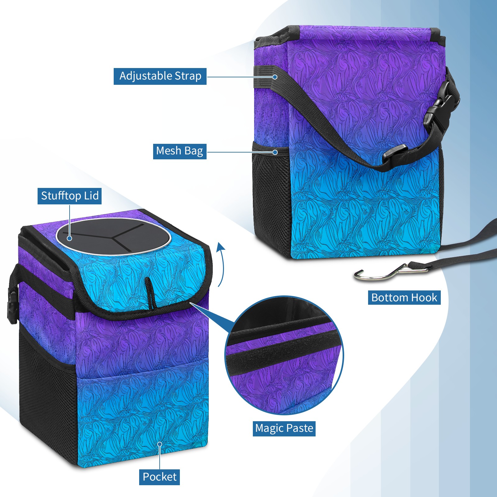 Car Trash Can with Lid & Multiple Pockets ,Foldable Vehicle Garbage Bin Waterproof & Leak Proof Automotive Garbage Cans Car Accessories for Women Men Road Trip Essentials Purple Blue Gradient