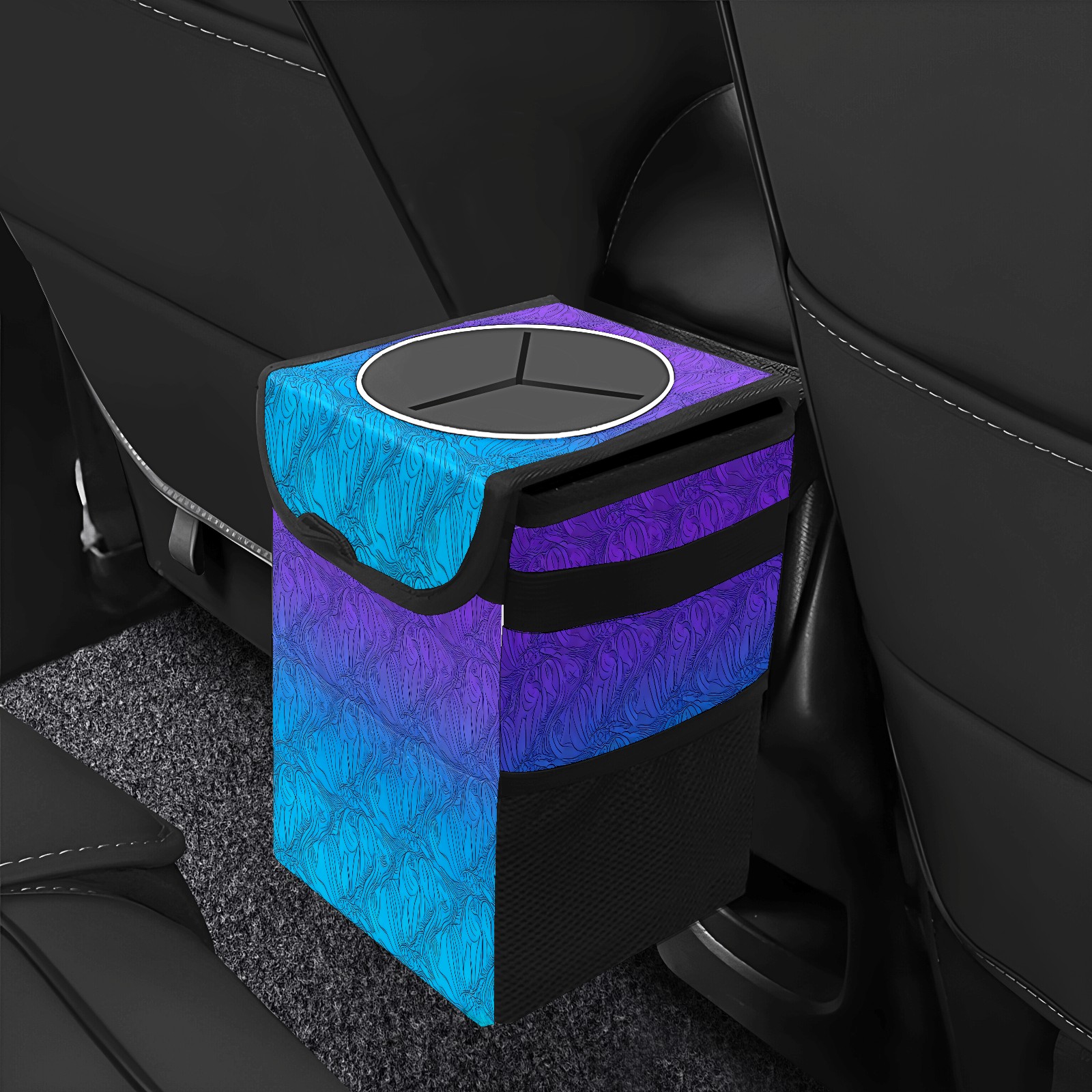 <p>The foldable car trash can Made of durable twill fabric and webbing with full printing, it measures 9.5x6.7x6.3 in to hold tissues, wrappers, bottles, and wet waste with an inner garbage bag. Features side mesh pockets and a front pouch for snacks, phones, and small items. Equipped with an adjustable strap (for headrest/armrest) and elastic hooks (for seat bottom) for double stability, minimizes shaking while driving. Foldable design saves space when not in use, easy to clean by hand—avoid prolonged sun exposure. A versatile organizer for a tidy in-car life!<br></p>