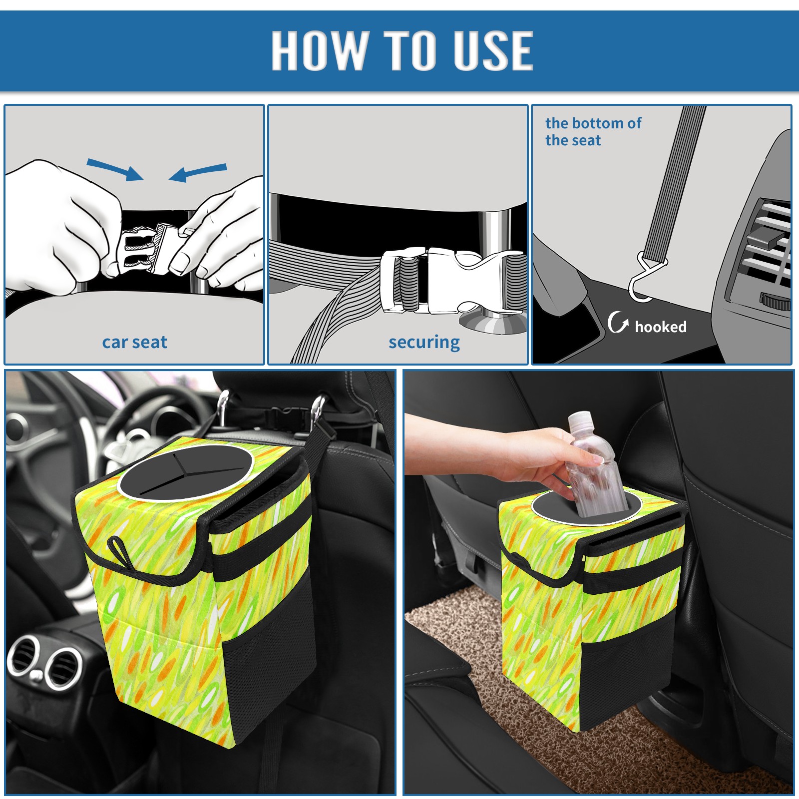 • <p>The foldable car trash can Made of durable twill fabric and webbing with full printing, it measures 9.5x6.7x6.3 in to hold tissues, wrappers, bottles, and wet waste with an inner garbage bag. Features side mesh pockets and a front pouch for snacks, phones, and small items. Equipped with an adjustable strap (for headrest/armrest) and elastic hooks (for seat bottom) for double stability, minimizes shaking while driving. Foldable design saves space when not in use, easy to clean by hand—avoid prolonged sun exposure. A versatile organizer for a tidy in-car life!<br></p>