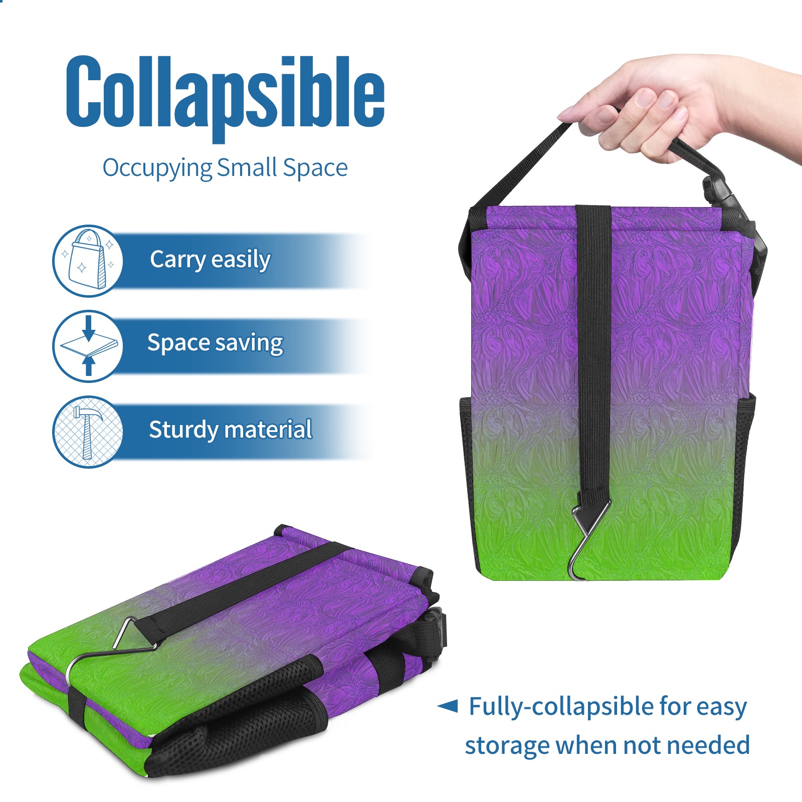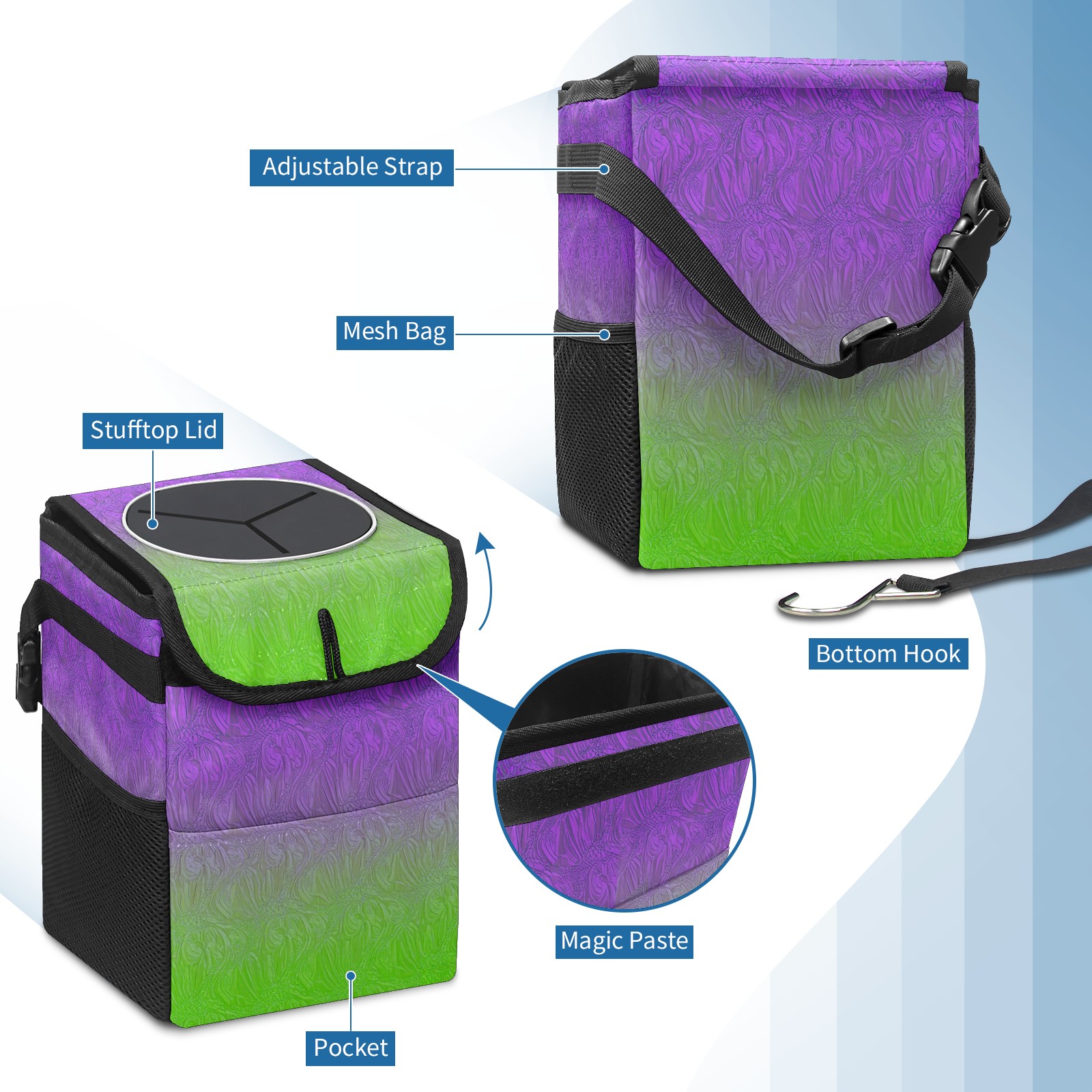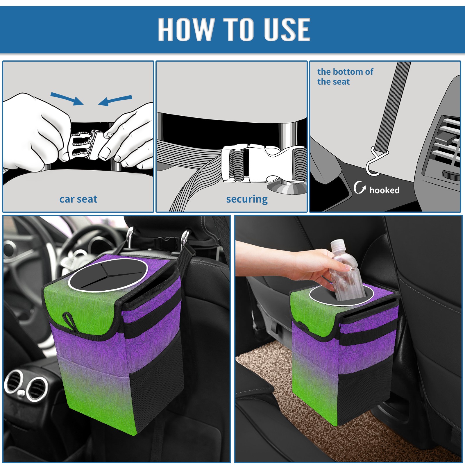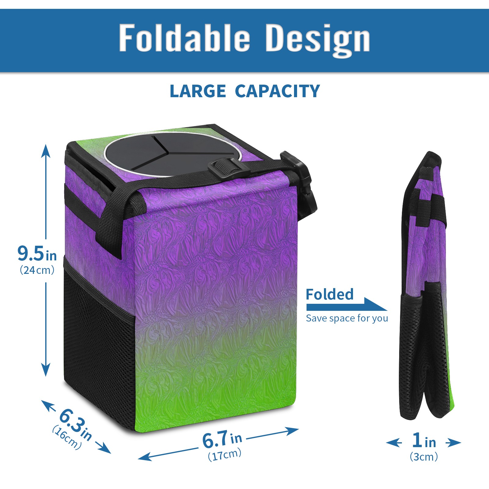 • <p>The foldable car trash can Made of durable twill fabric and webbing with full printing, it measures 9.5x6.7x6.3 in to hold tissues, wrappers, bottles, and wet waste with an inner garbage bag. Features side mesh pockets and a front pouch for snacks, phones, and small items. Equipped with an adjustable strap (for headrest/armrest) and elastic hooks (for seat bottom) for double stability, minimizes shaking while driving. Foldable design saves space when not in use, easy to clean by hand—avoid prolonged sun exposure. A versatile organizer for a tidy in-car life!<br></p>