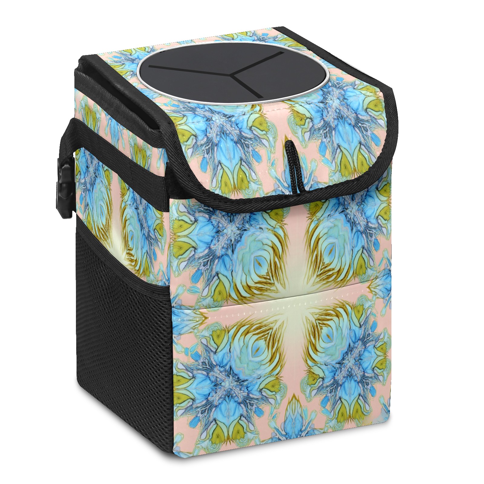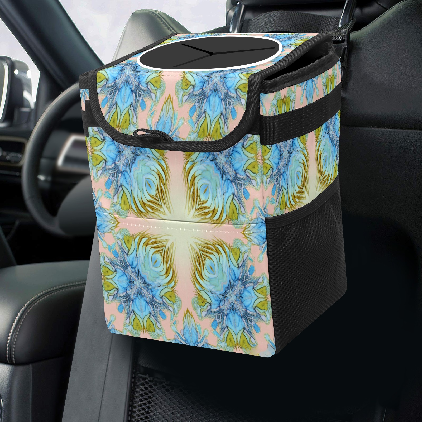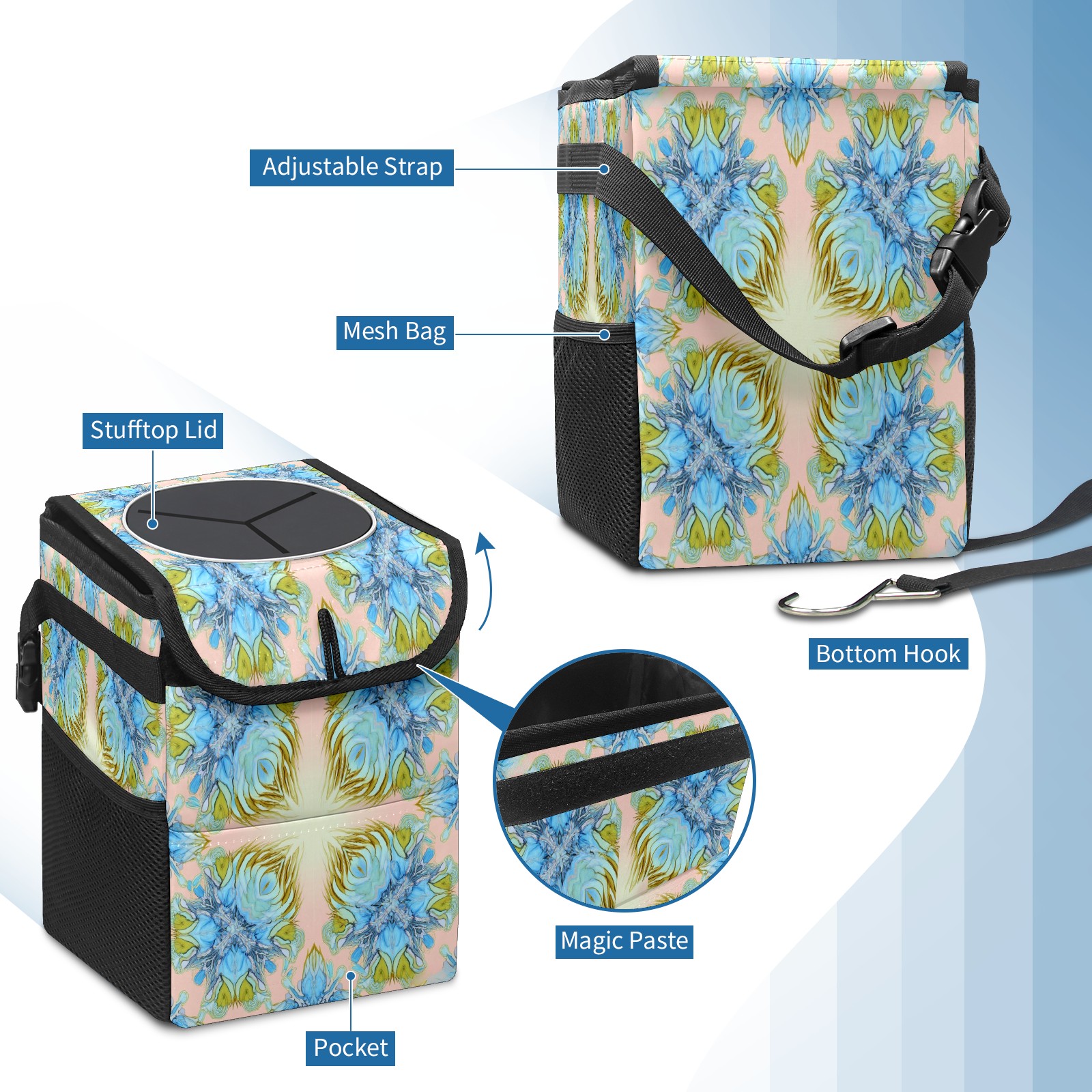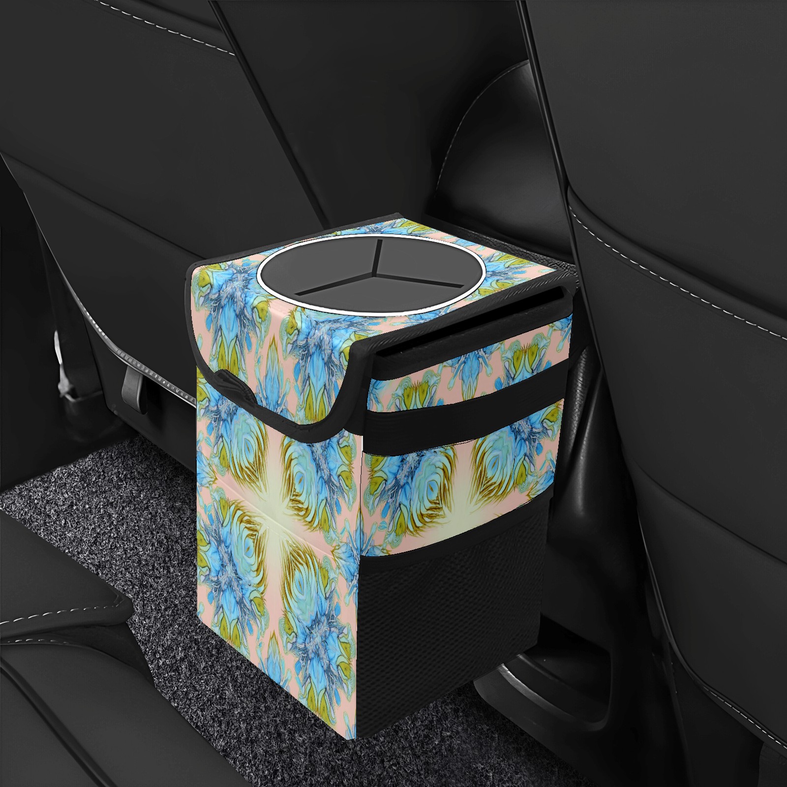 • <p>The foldable car trash can Made of durable twill fabric and webbing with full printing, it measures 9.5x6.7x6.3 in to hold tissues, wrappers, bottles, and wet waste with an inner garbage bag. Features side mesh pockets and a front pouch for snacks, phones, and small items. Equipped with an adjustable strap (for headrest/armrest) and elastic hooks (for seat bottom) for double stability, minimizes shaking while driving. Foldable design saves space when not in use, easy to clean by hand—avoid prolonged sun exposure. A versatile organizer for a tidy in-car life!<br></p>