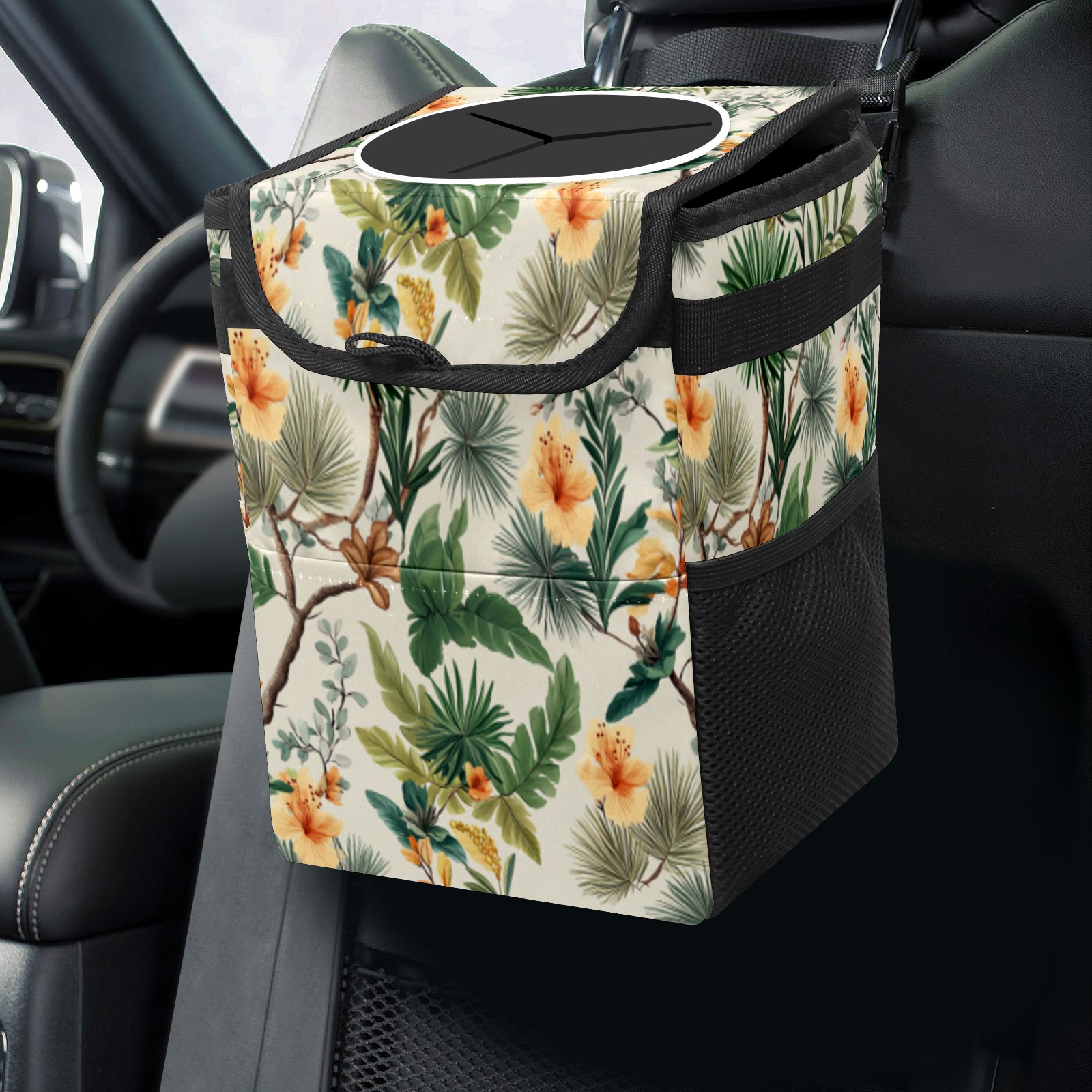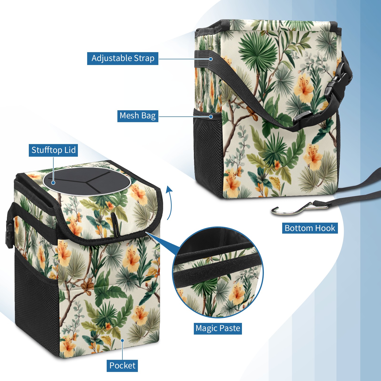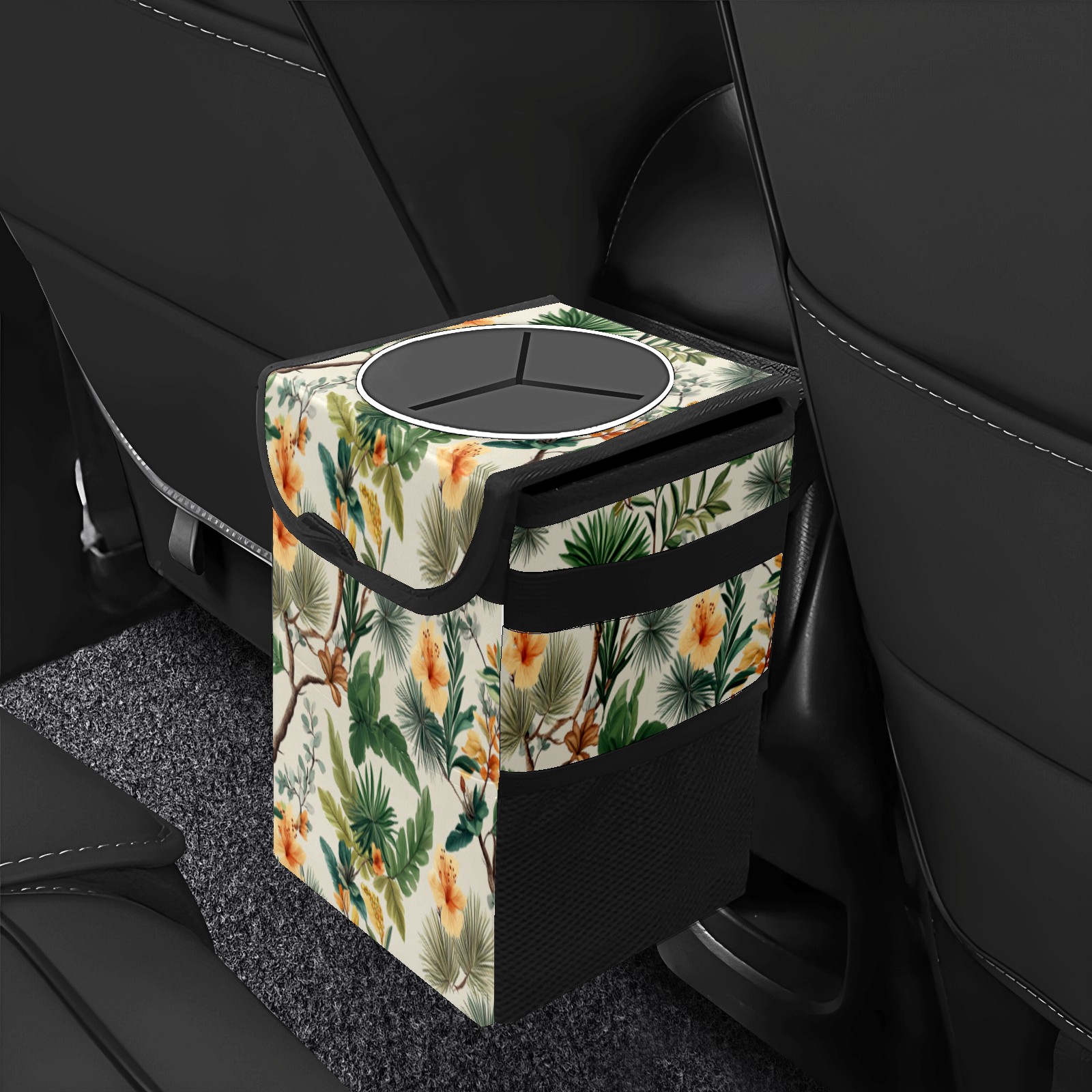 Car Trash Can with Lid & Multiple Pockets ,Foldable Vehicle Garbage Bin Waterproof & Leak Proof Automotive Garbage Cans Car Accessories for Women Men Road Trip Essentials Tropical Plant Pattern