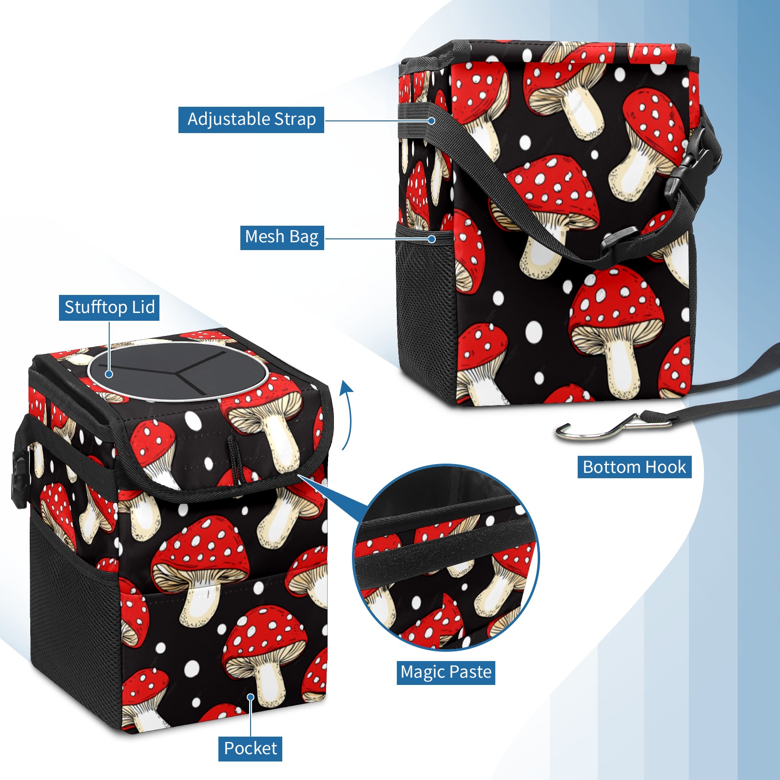 • <p>The foldable car trash can Made of durable twill fabric and webbing with full printing, it measures 9.5x6.7x6.3 in to hold tissues, wrappers, bottles, and wet waste with an inner garbage bag. Features side mesh pockets and a front pouch for snacks, phones, and small items. Equipped with an adjustable strap (for headrest/armrest) and elastic hooks (for seat bottom) for double stability, minimizes shaking while driving. Foldable design saves space when not in use, easy to clean by hand—avoid prolonged sun exposure. A versatile organizer for a tidy in-car life!<br></p>