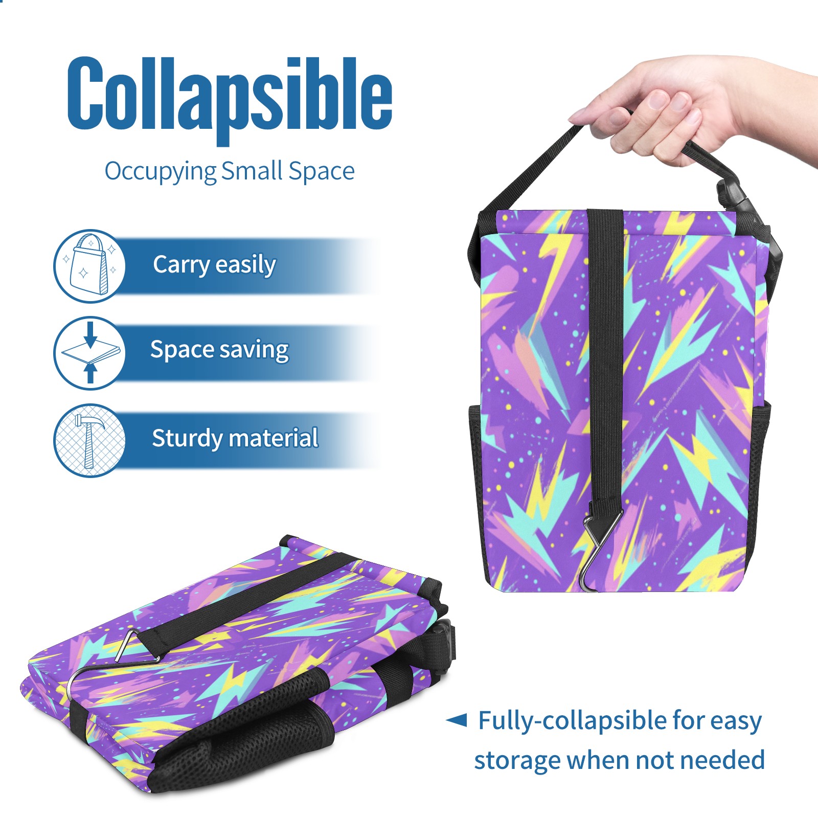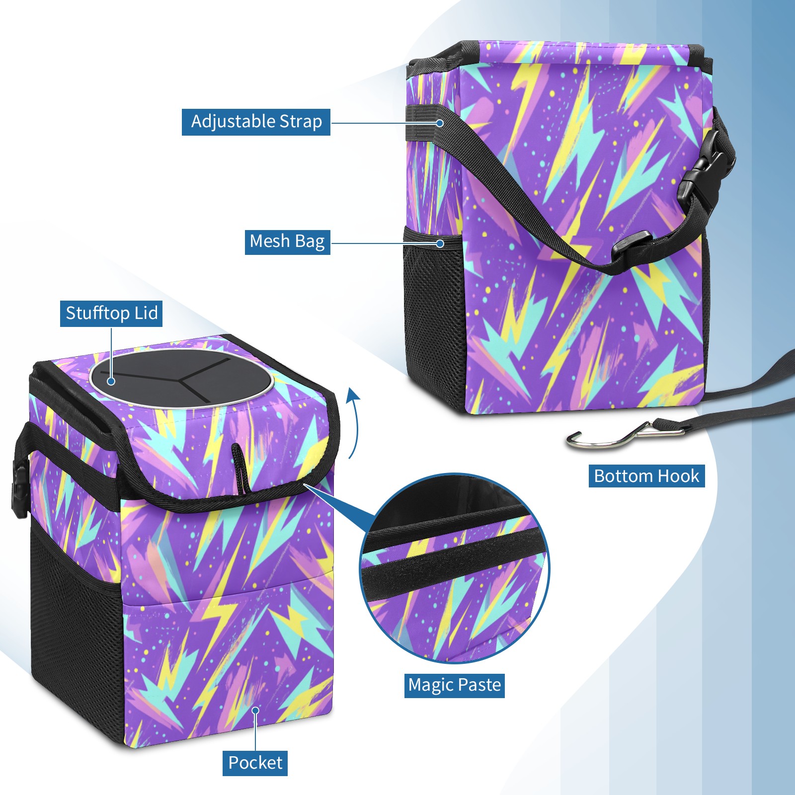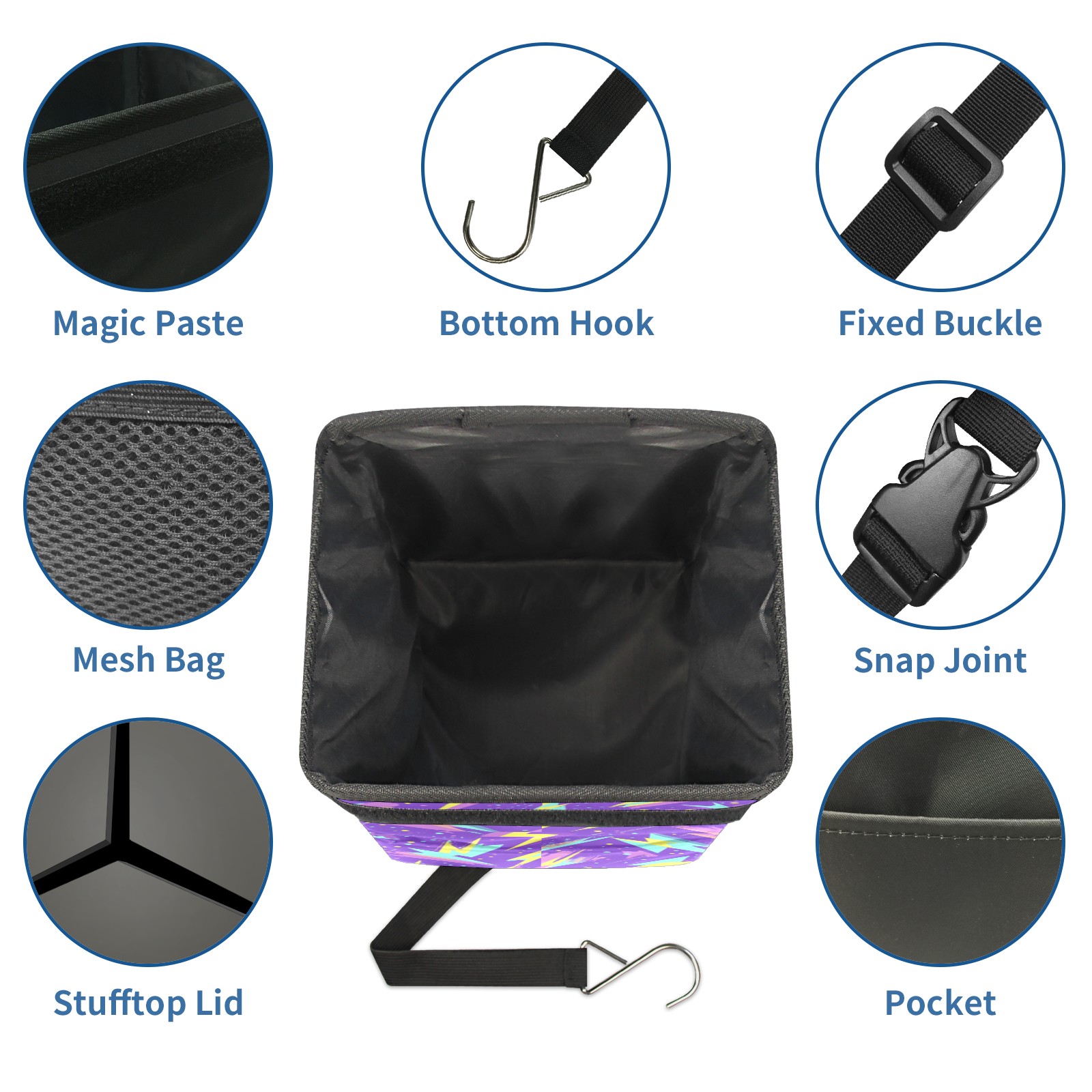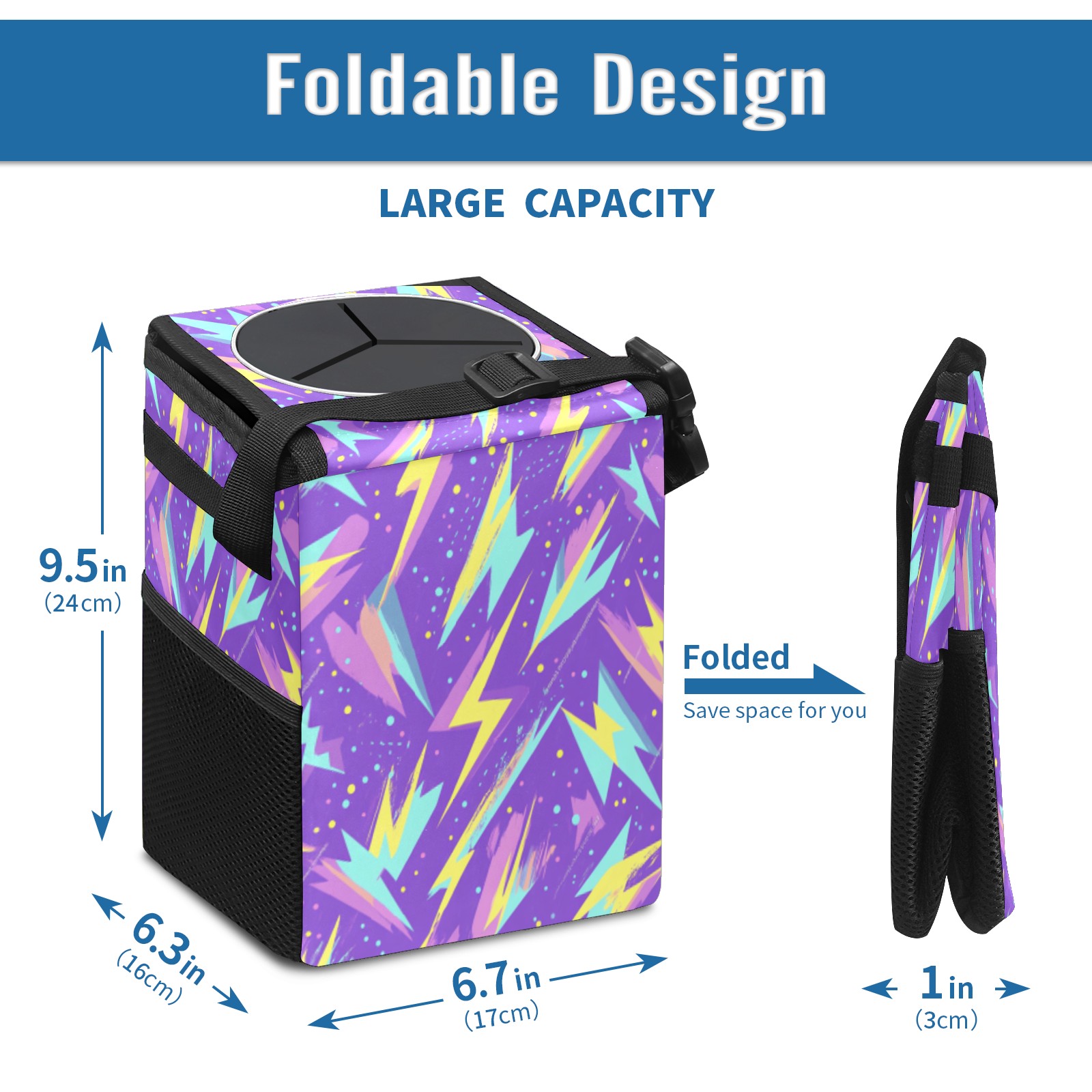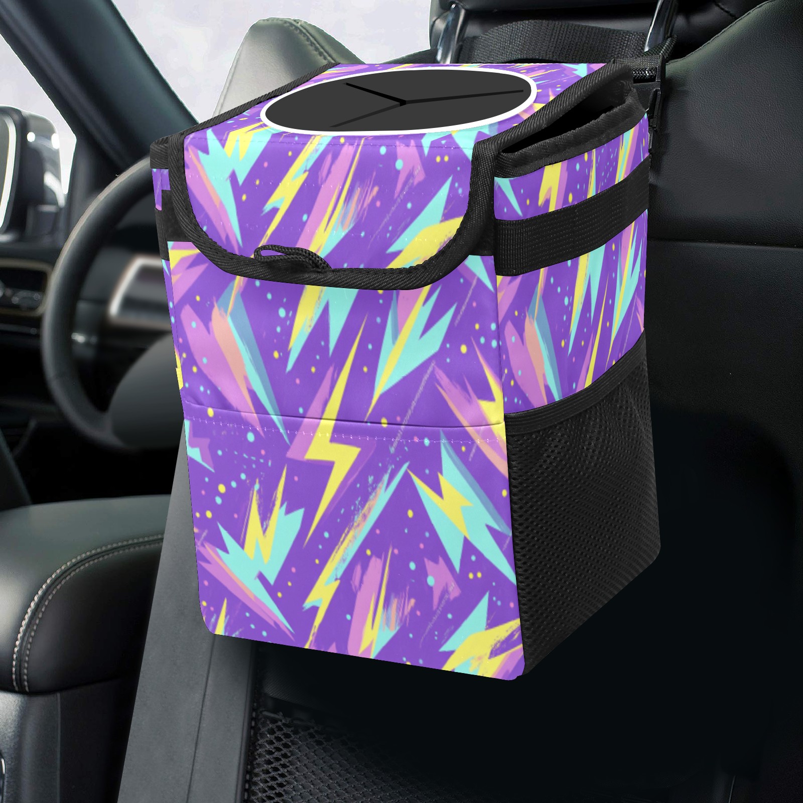 • <p>The foldable car trash can Made of durable twill fabric and webbing with full printing, it measures 9.5x6.7x6.3 in to hold tissues, wrappers, bottles, and wet waste with an inner garbage bag. Features side mesh pockets and a front pouch for snacks, phones, and small items. Equipped with an adjustable strap (for headrest/armrest) and elastic hooks (for seat bottom) for double stability, minimizes shaking while driving. Foldable design saves space when not in use, easy to clean by hand—avoid prolonged sun exposure. A versatile organizer for a tidy in-car life!<br></p>