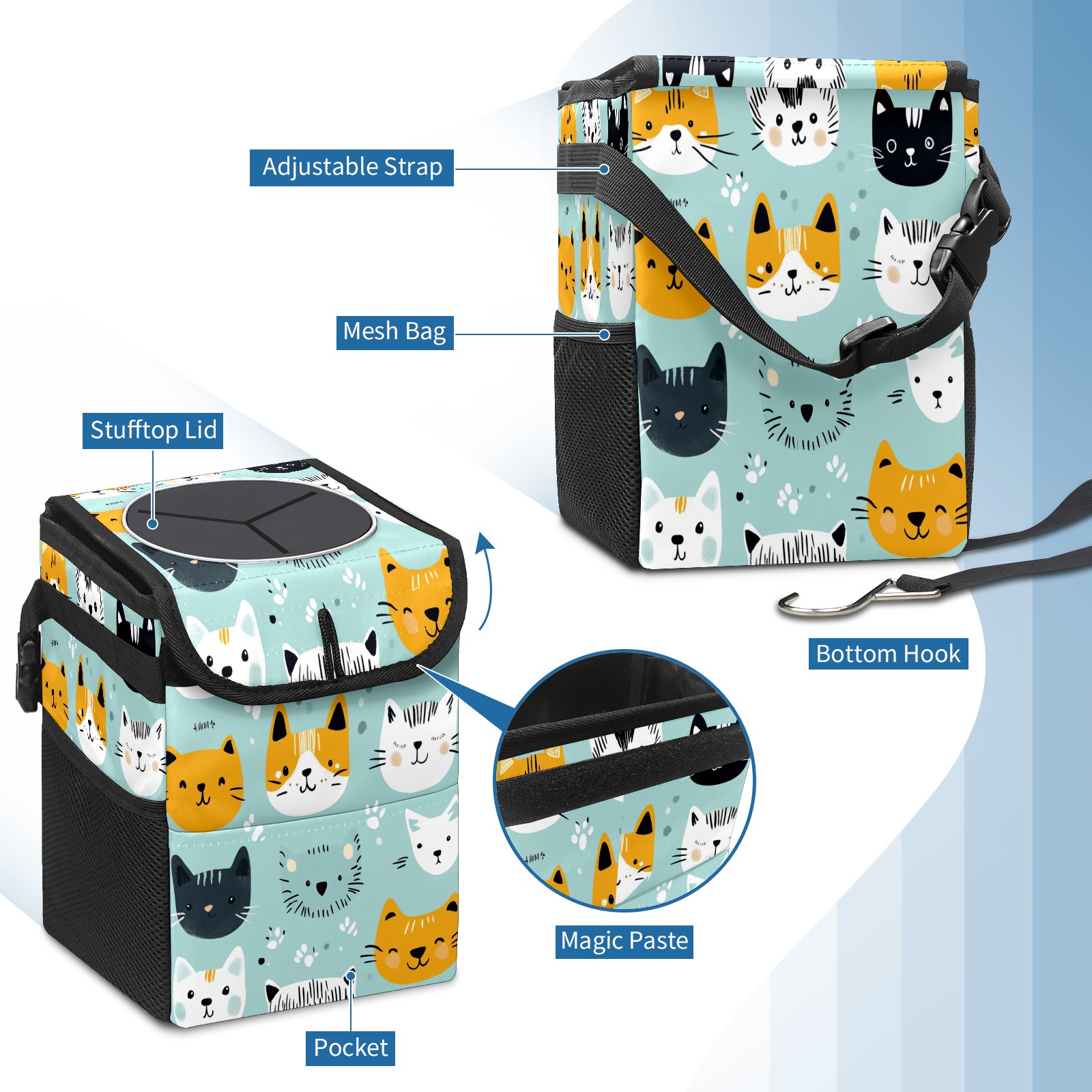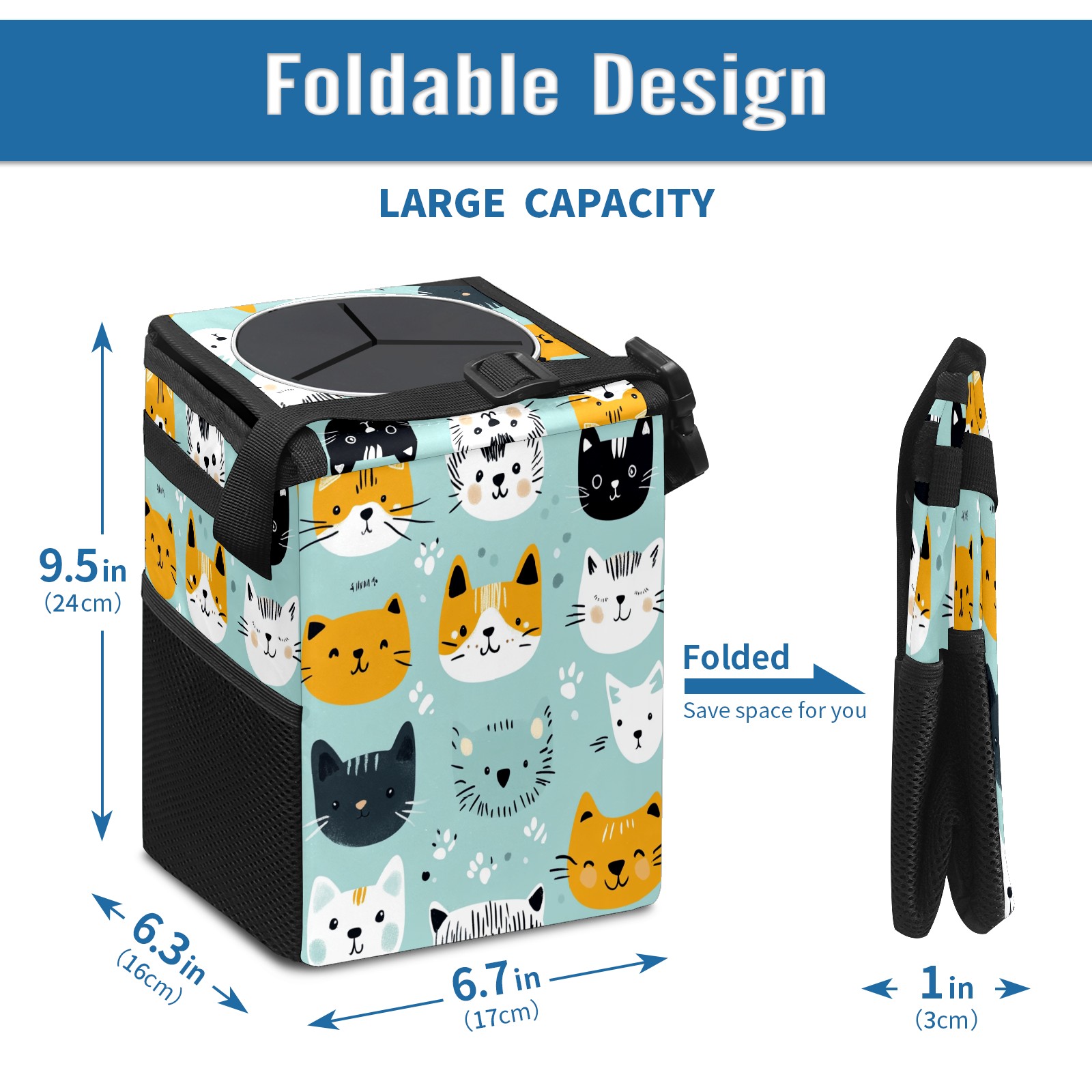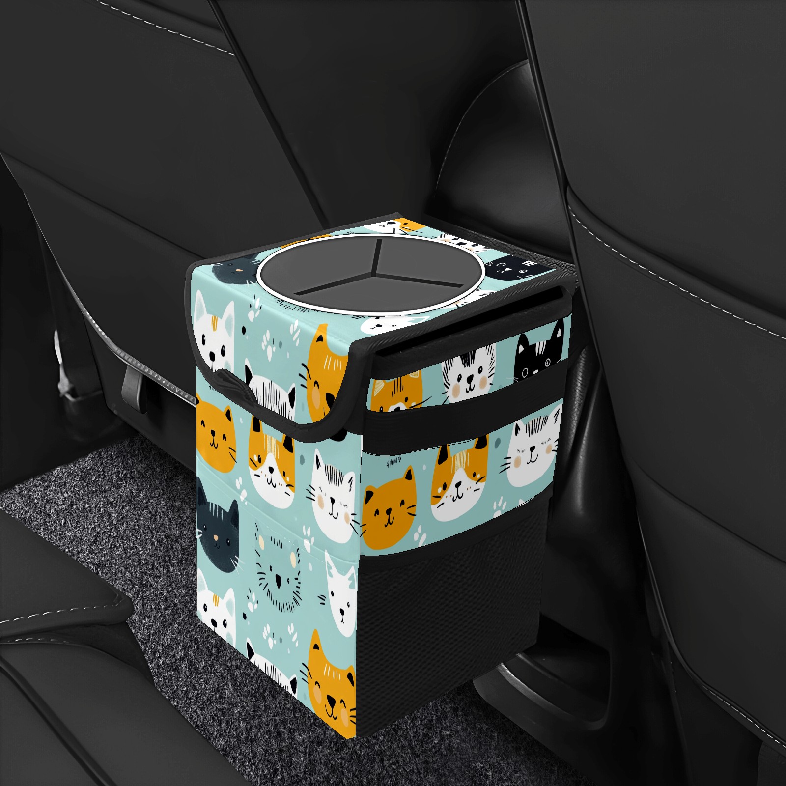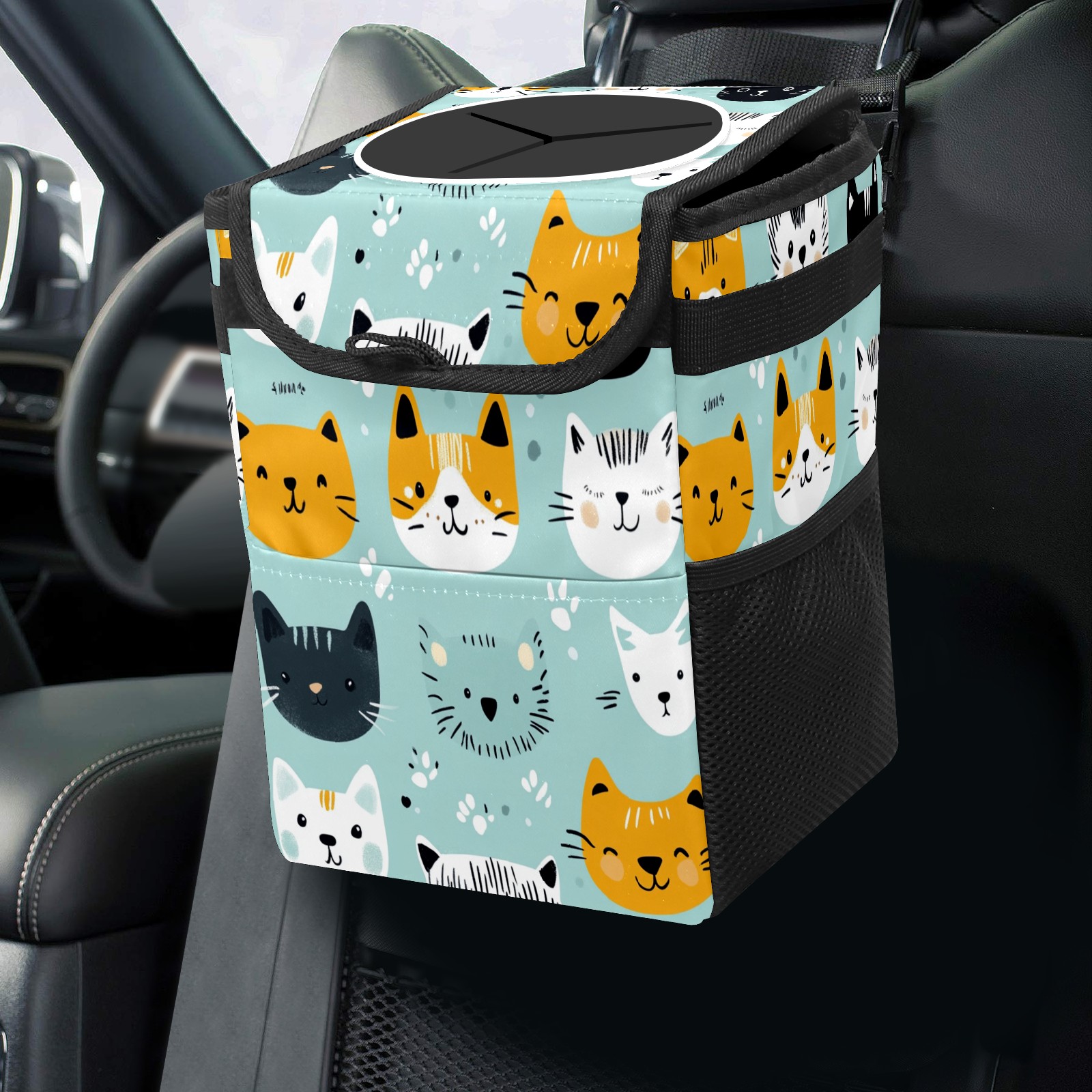 Car Trash Can with Lid & Multiple Pockets ,Foldable Vehicle Garbage Bin Waterproof & Leak Proof Automotive Garbage Cans Car Accessories for Women Men Road Trip Essentials Cartoon Cat Face Pattern