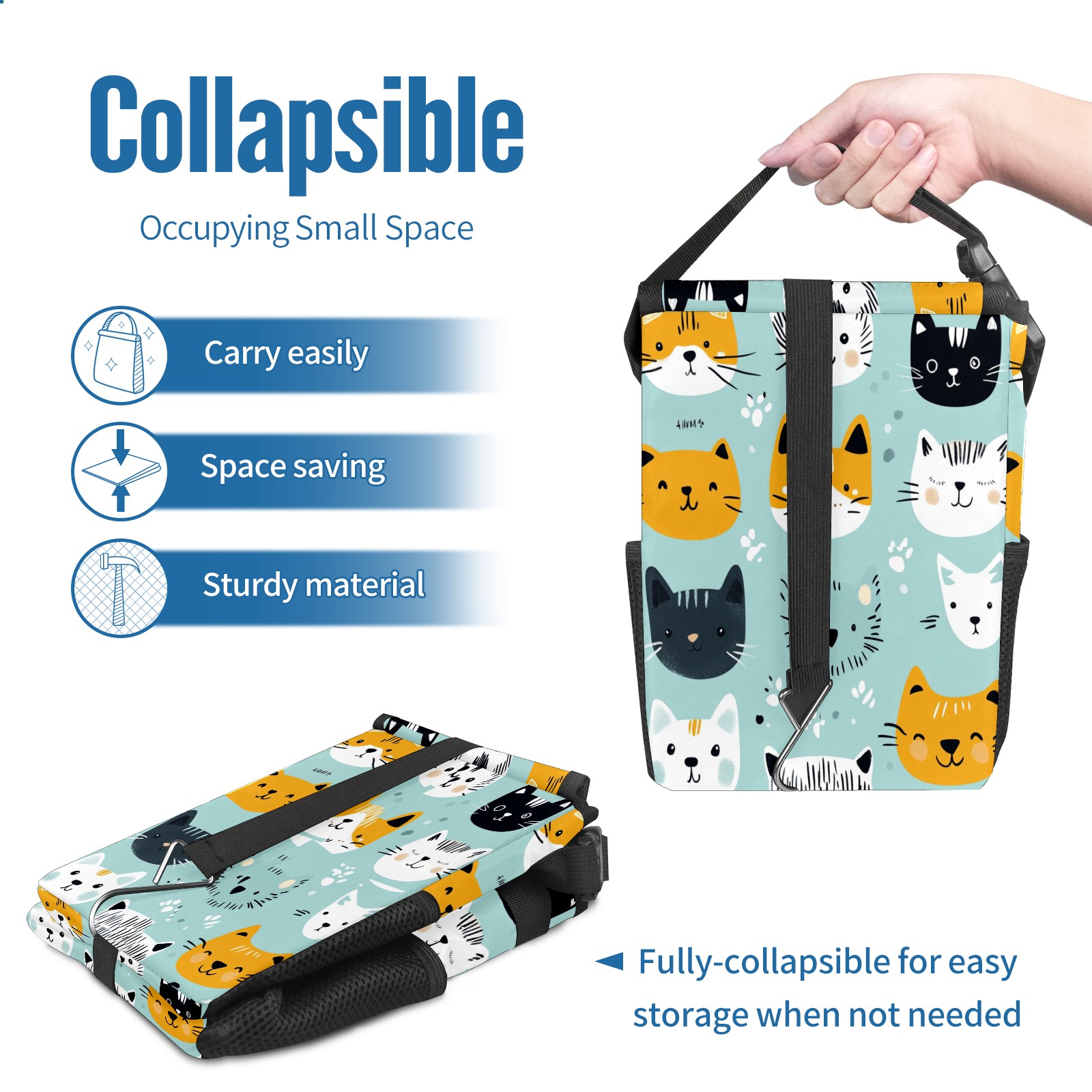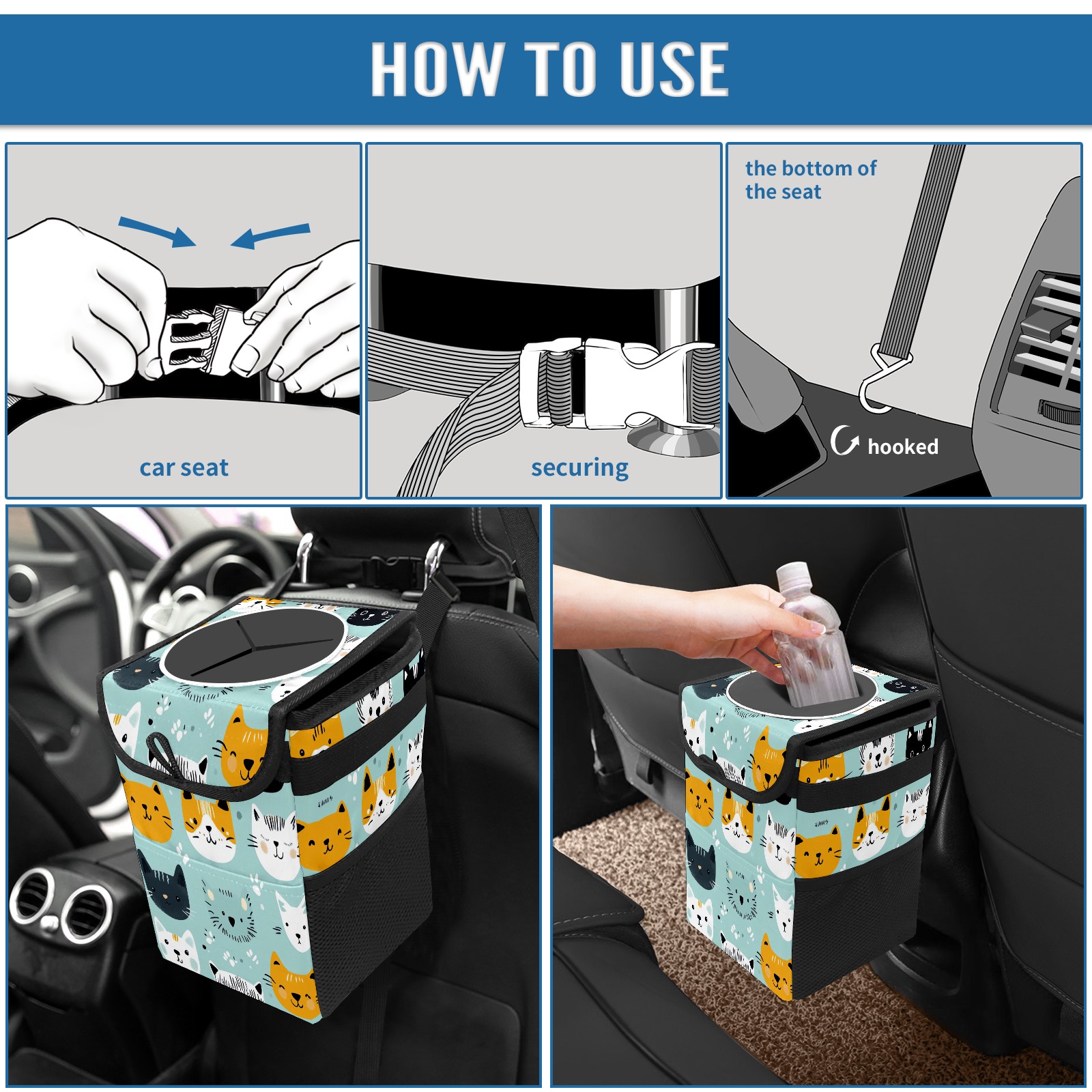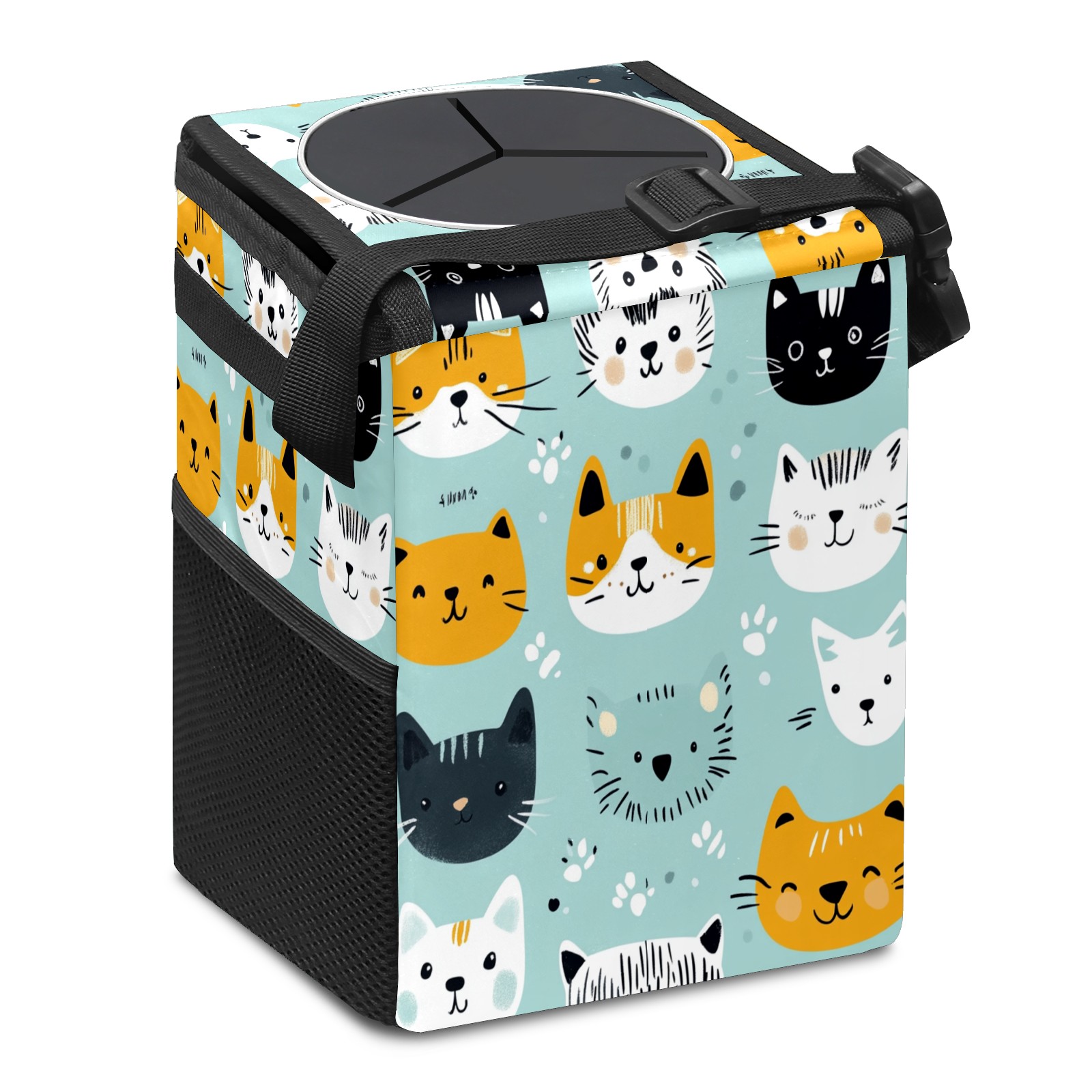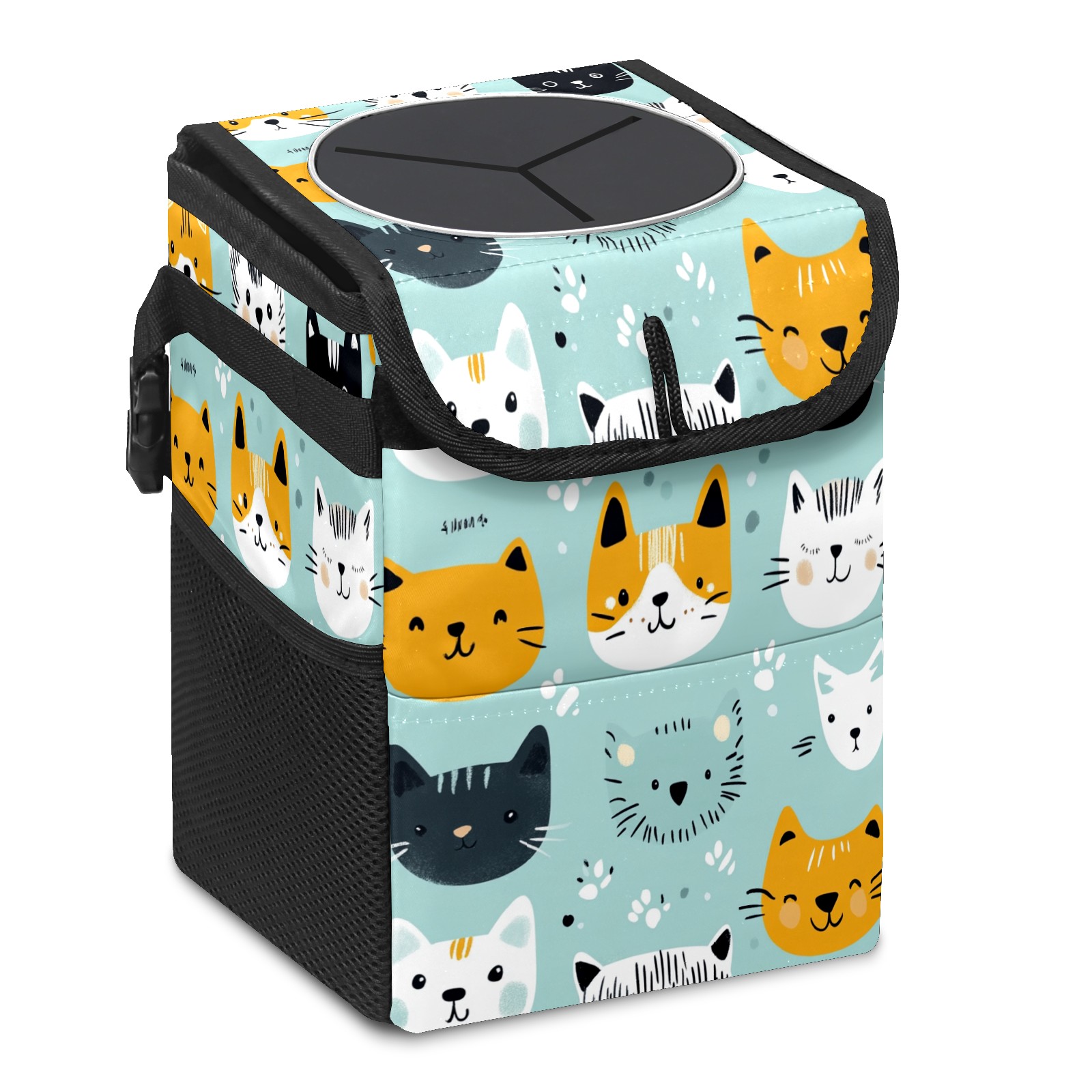 Car Trash Can with Lid & Multiple Pockets ,Foldable Vehicle Garbage Bin Waterproof & Leak Proof Automotive Garbage Cans Car Accessories for Women Men Road Trip Essentials Cartoon Cat Face Pattern