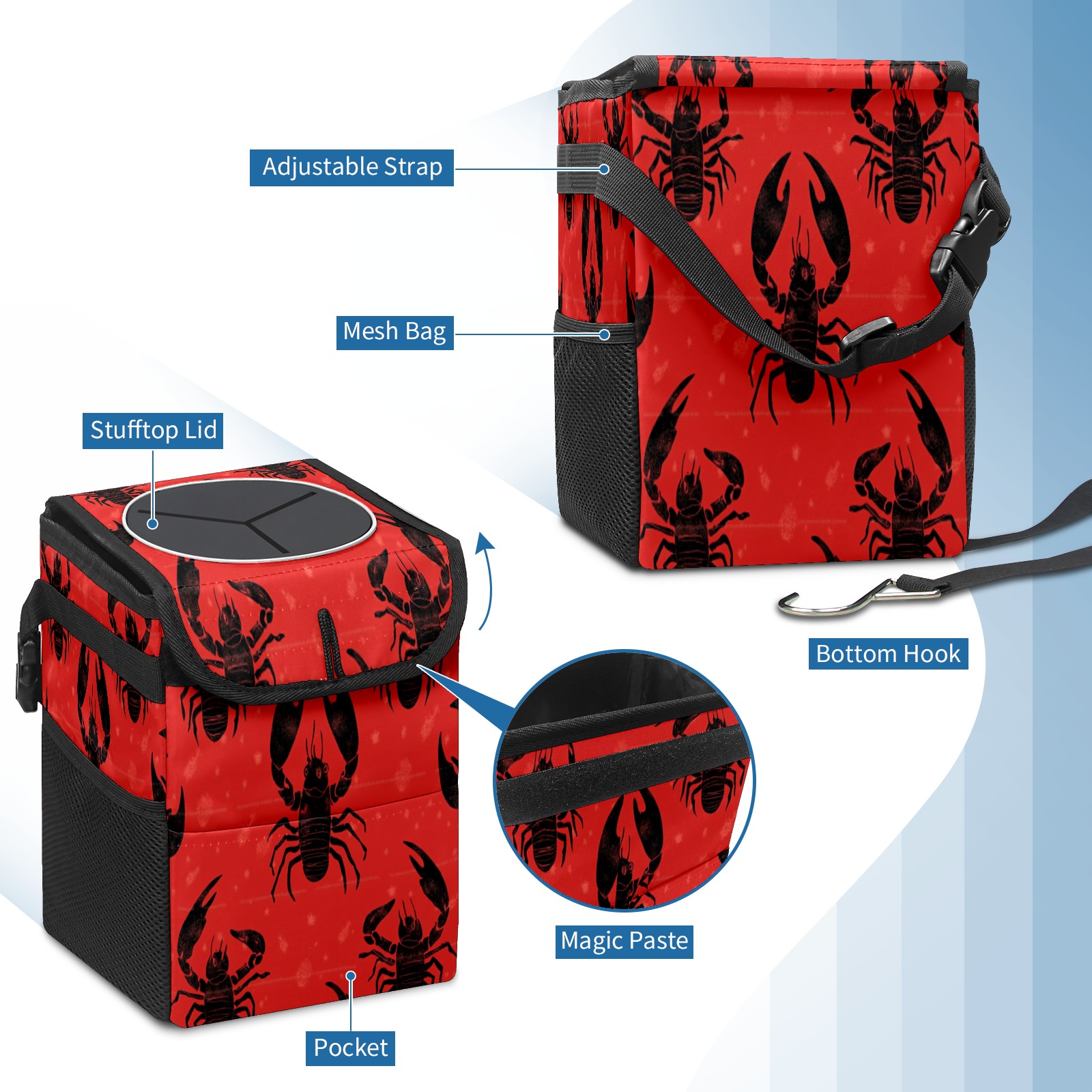 • <p>The foldable car trash can Made of durable twill fabric and webbing with full printing, it measures 9.5x6.7x6.3 in to hold tissues, wrappers, bottles, and wet waste with an inner garbage bag. Features side mesh pockets and a front pouch for snacks, phones, and small items. Equipped with an adjustable strap (for headrest/armrest) and elastic hooks (for seat bottom) for double stability, minimizes shaking while driving. Foldable design saves space when not in use, easy to clean by hand—avoid prolonged sun exposure. A versatile organizer for a tidy in-car life!<br></p>