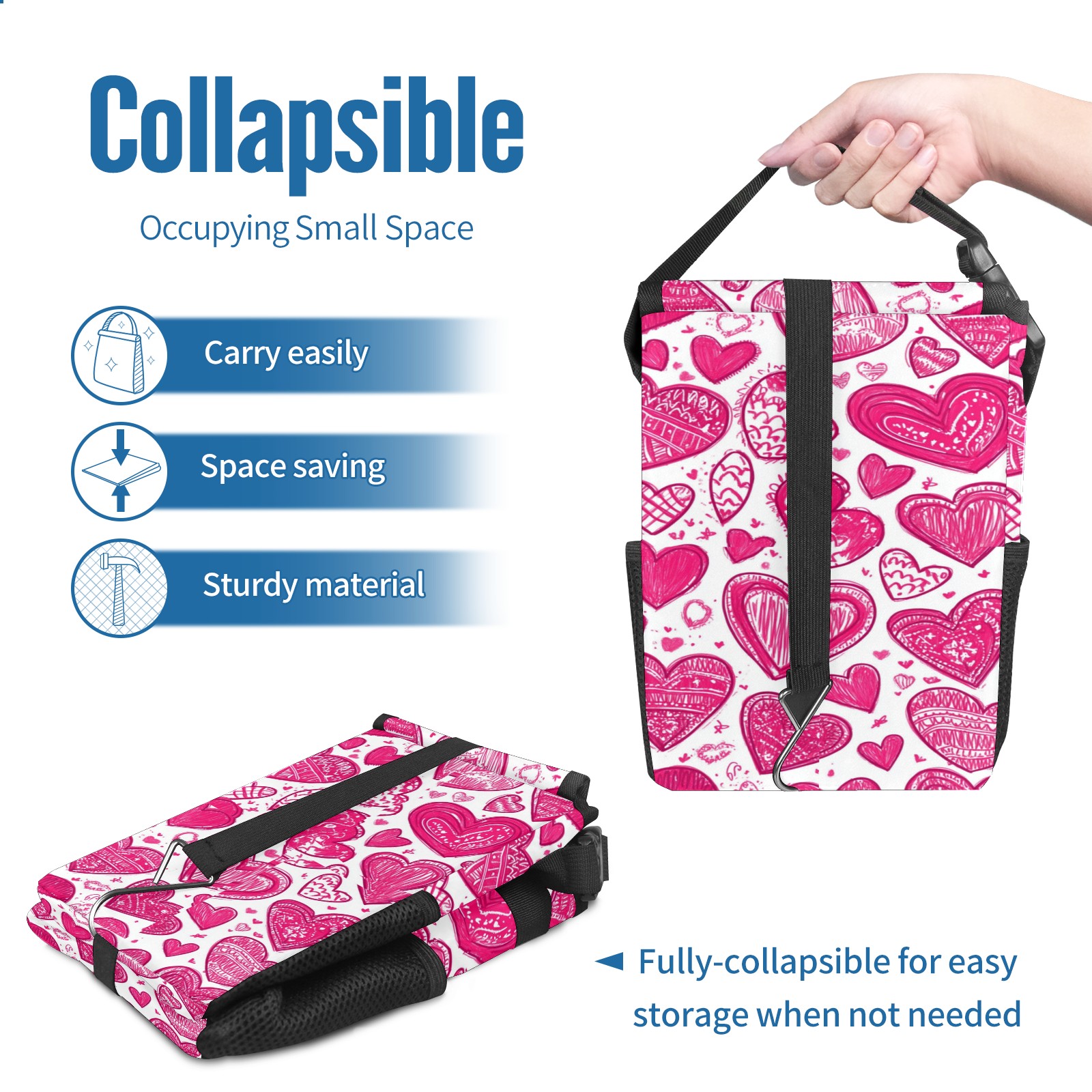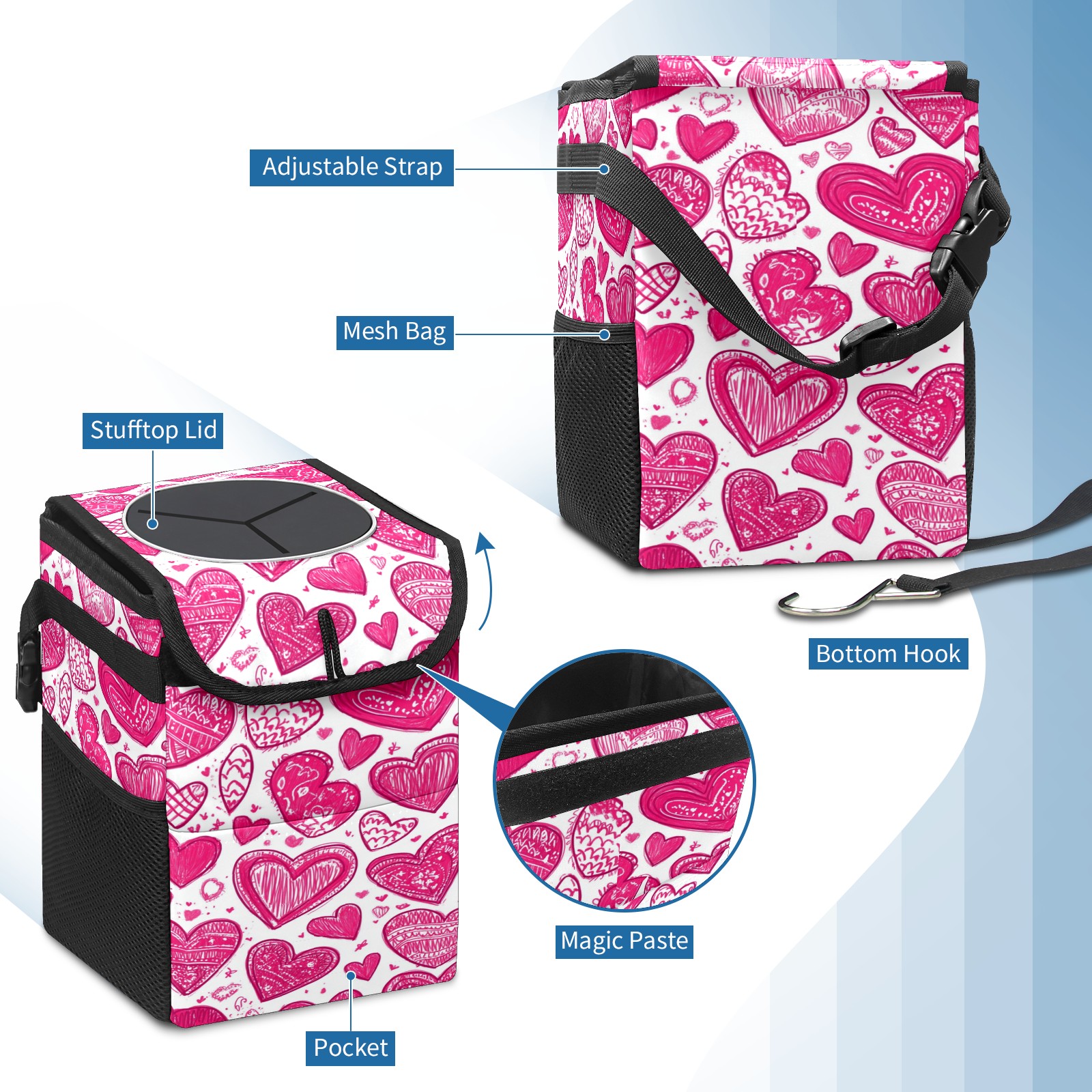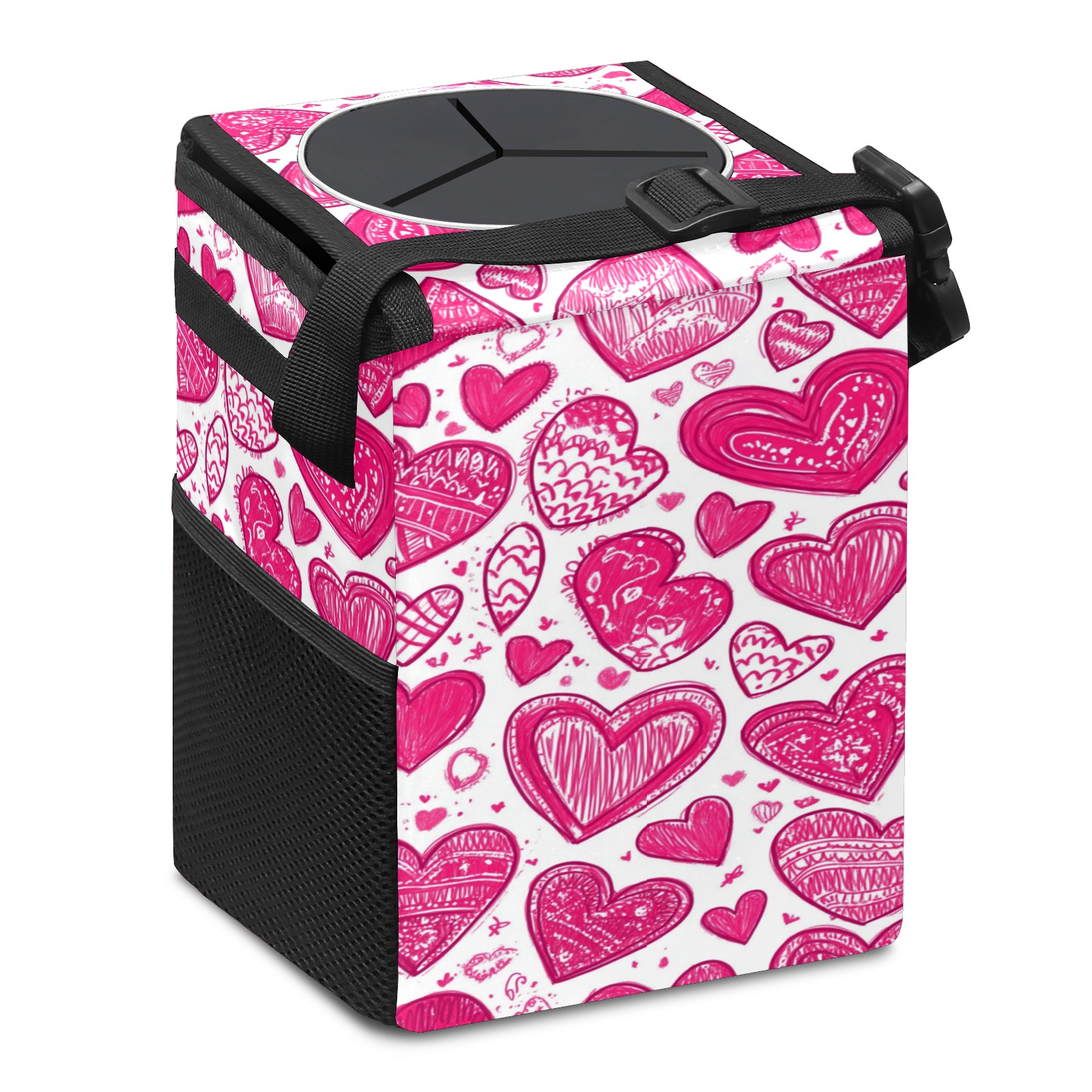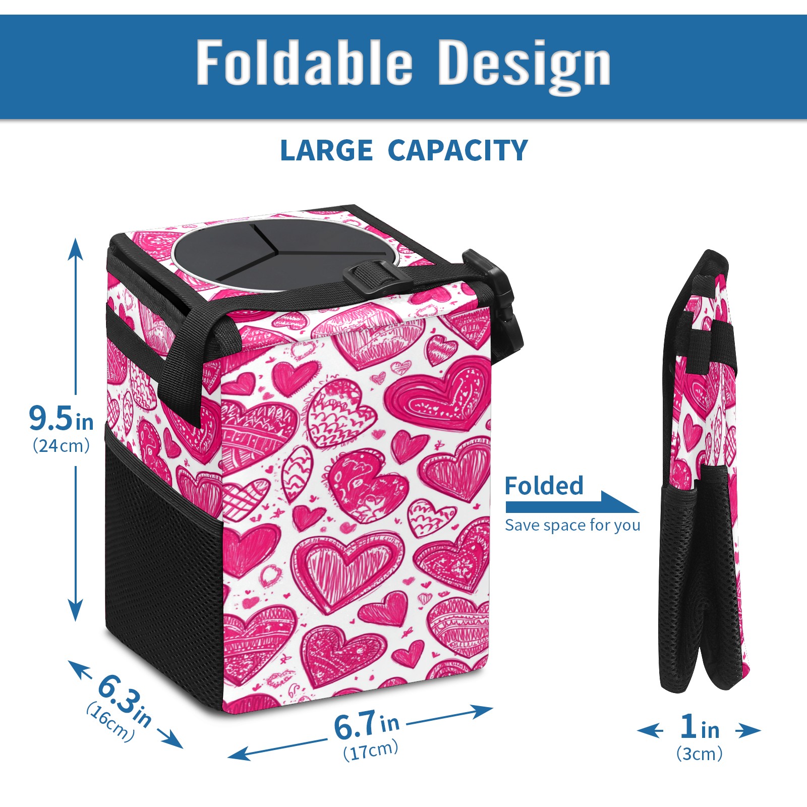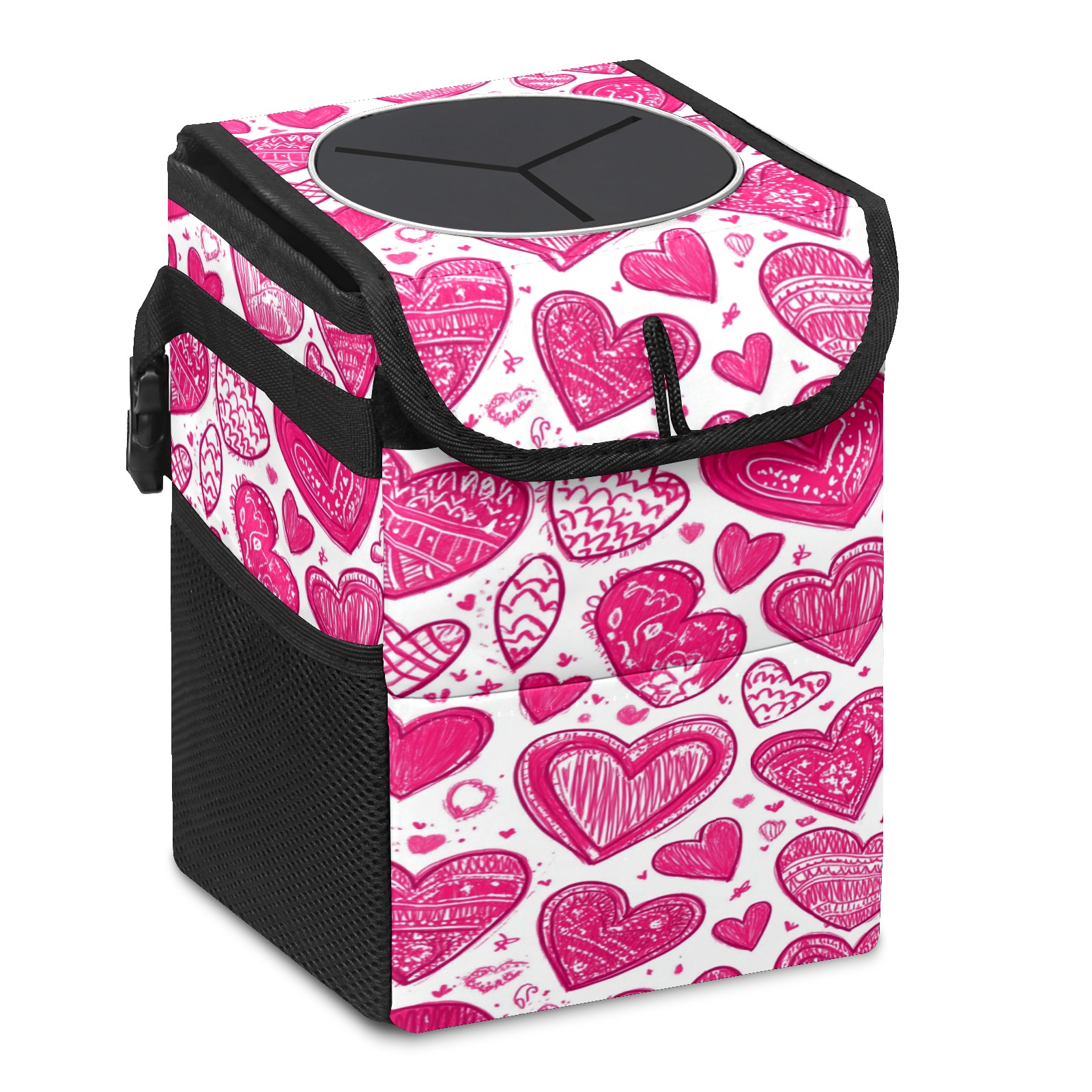 • <p>This multi-functional car trash can features a stylish printed design, combining practicality and aesthetics. Made with high-quality twill fabric and woven straps, it's sturdy and durable. Dimensions: 24×17×16cm (9.5×6.7×6.3 inches). The top rubber opening lid makes disposing of trash easy, while side mesh pockets and a front pocket easily store snacks, mobile phones, and other small items. Equipped with a dual securing system of straps and elastic hooks, it can be flexibly hung behind headrests, inside armrest boxes, or hooked to the bottom of seat cushions. Not only can it be used as a trash can, but it can also function as a food or miscellaneous item storage box, achieving multiple uses. When not in use, it can be folded for storage, saving space and creating a clean and tidy environment for your car.<br></p>