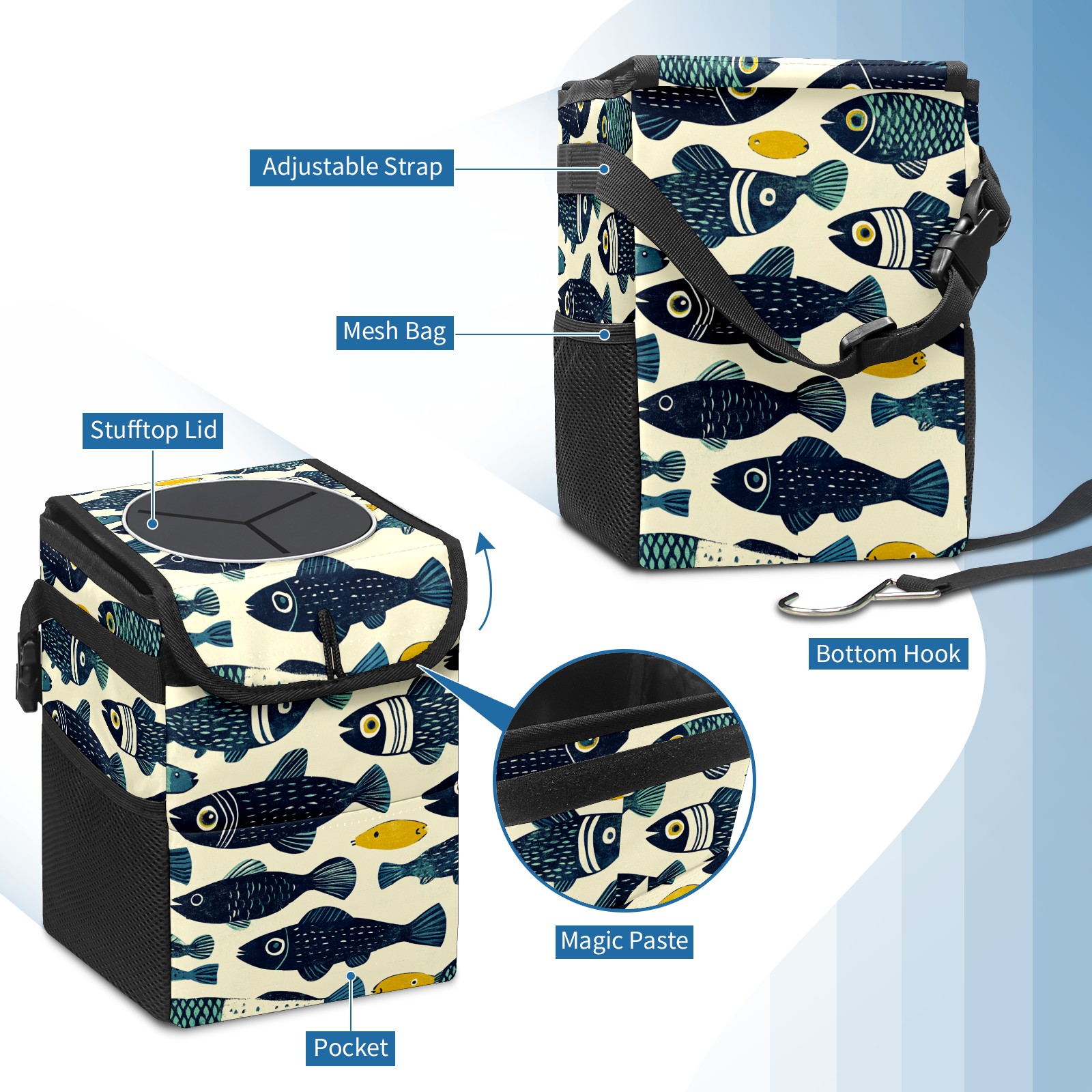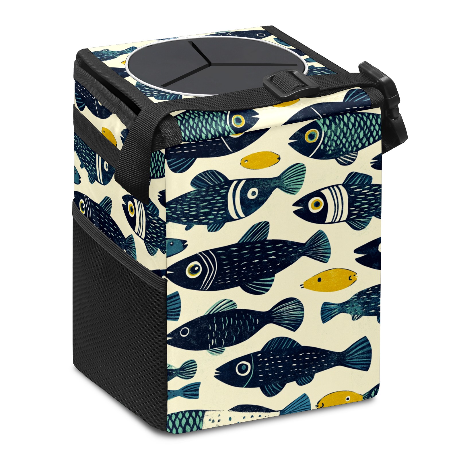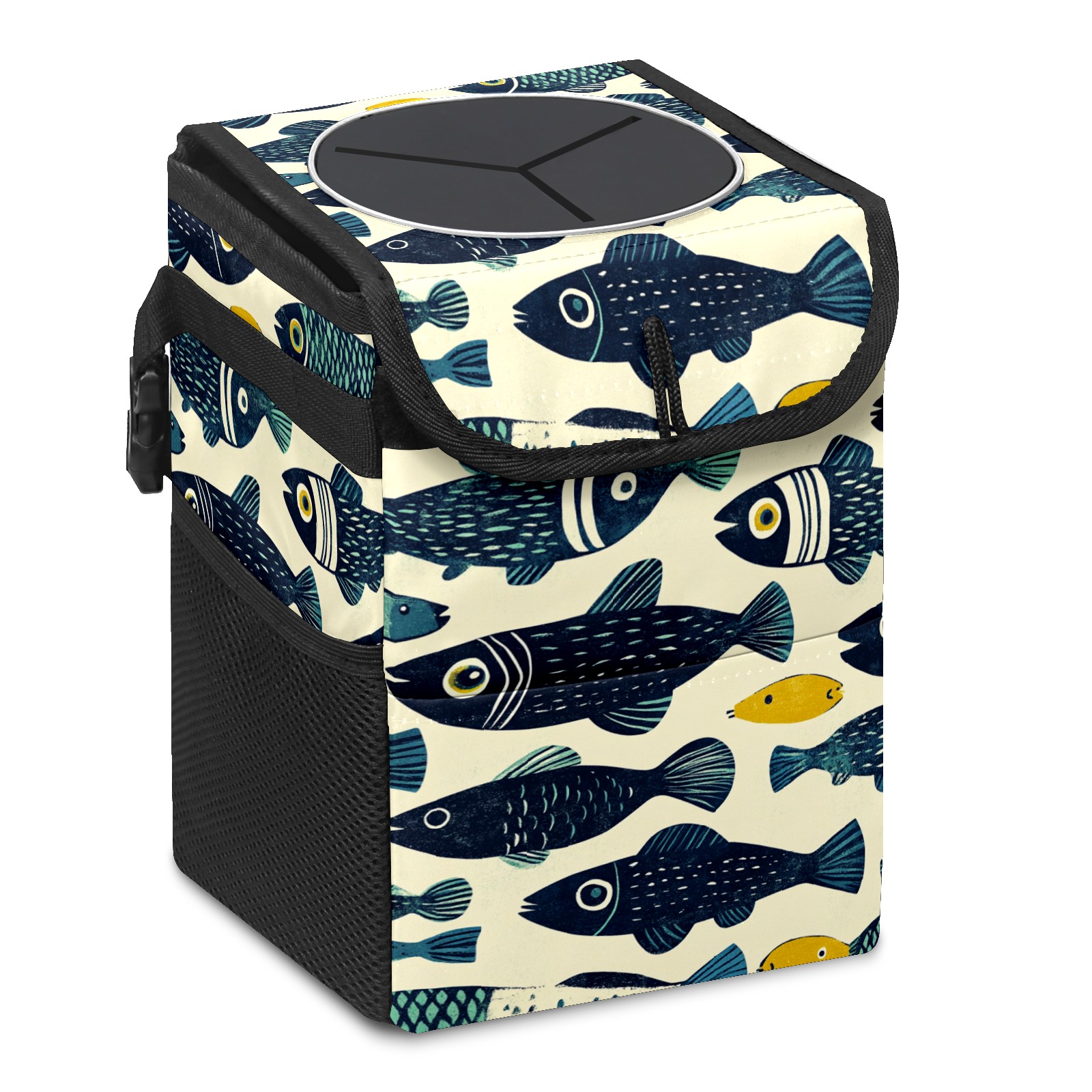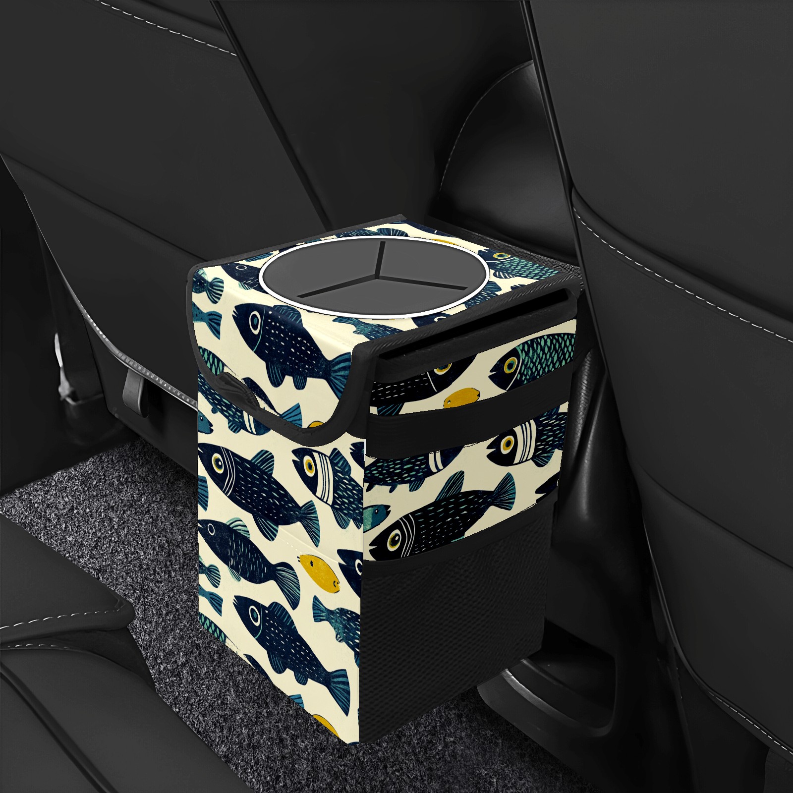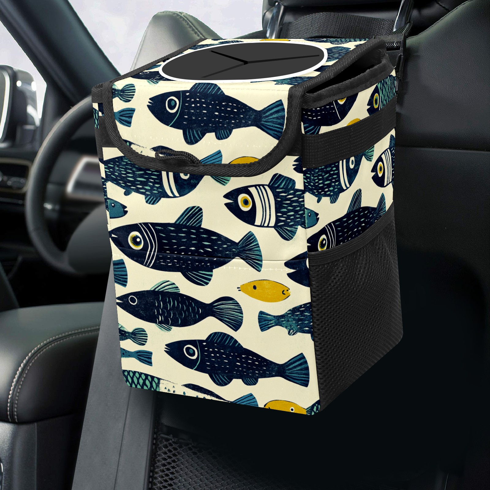 Universal Hanging Car Trash Can - Leakproof Design with Secure Lid | Fits SUV, Truck, Van | Front & Back Seat Friendly | Smart Automotive Accessory Linocut Fish Pattern