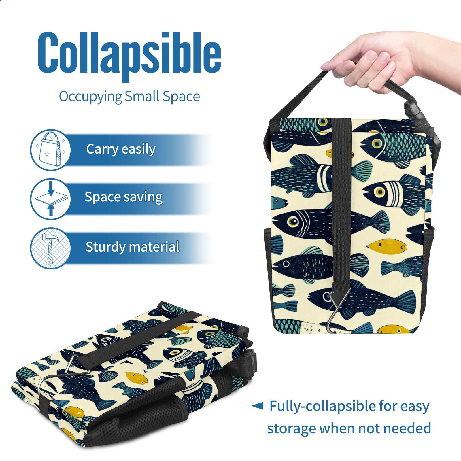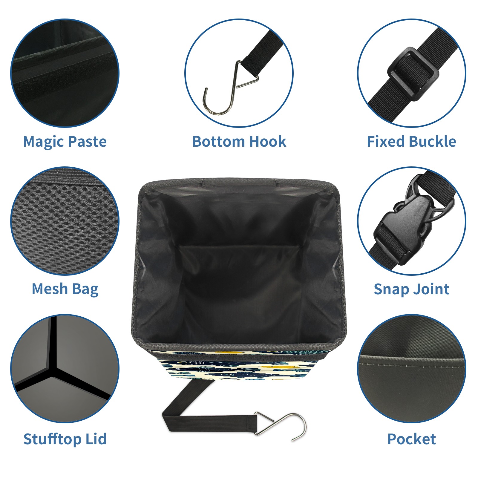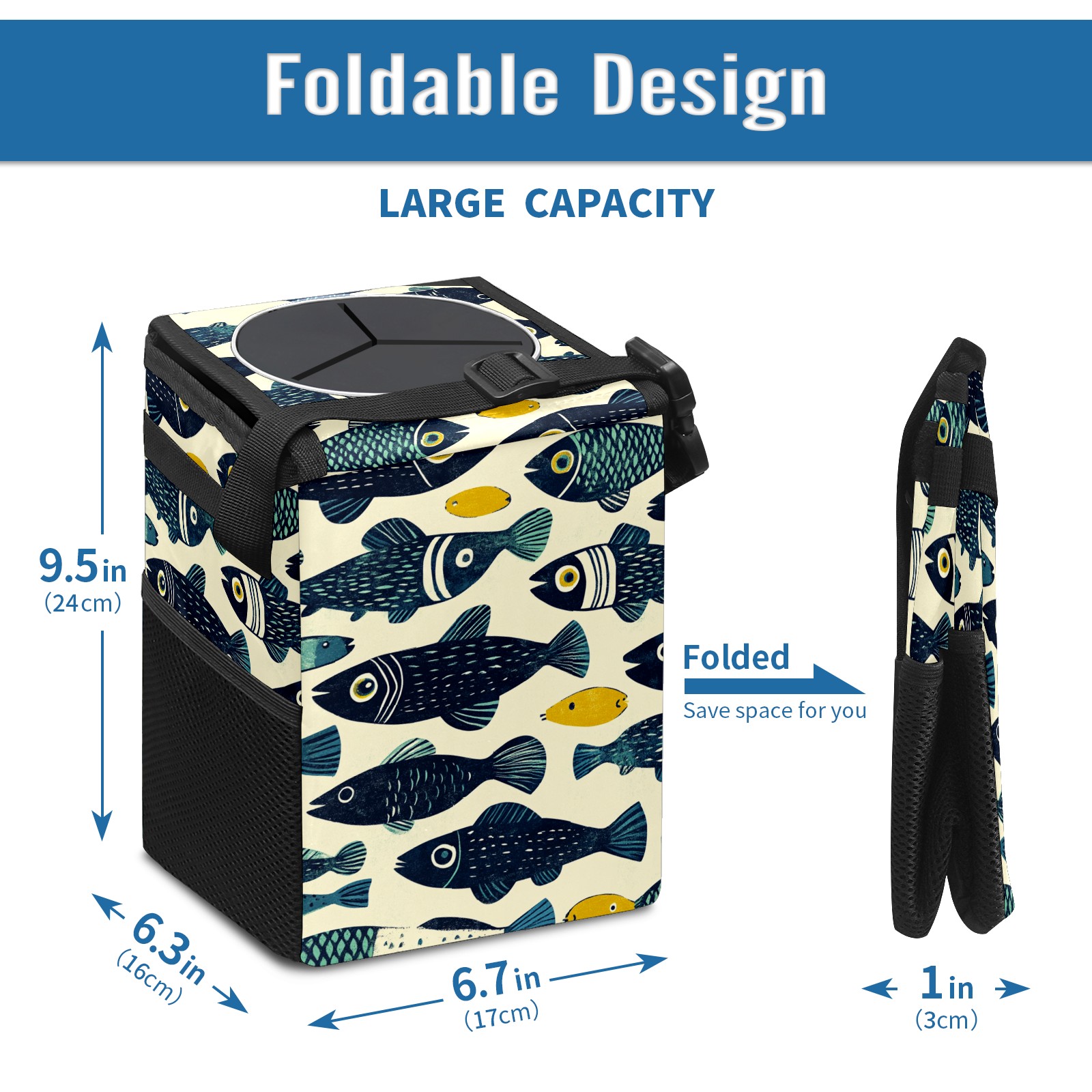 • <p>This multi-functional car trash can features a stylish printed design, combining practicality and aesthetics. Made with high-quality twill fabric and woven straps, it's sturdy and durable. Dimensions: 24×17×16cm (9.5×6.7×6.3 inches). The top rubber opening lid makes disposing of trash easy, while side mesh pockets and a front pocket easily store snacks, mobile phones, and other small items. Equipped with a dual securing system of straps and elastic hooks, it can be flexibly hung behind headrests, inside armrest boxes, or hooked to the bottom of seat cushions. Not only can it be used as a trash can, but it can also function as a food or miscellaneous item storage box, achieving multiple uses. When not in use, it can be folded for storage, saving space and creating a clean and tidy environment for your car.<br></p>