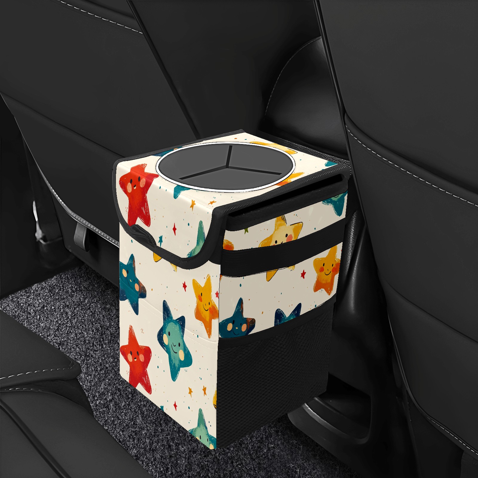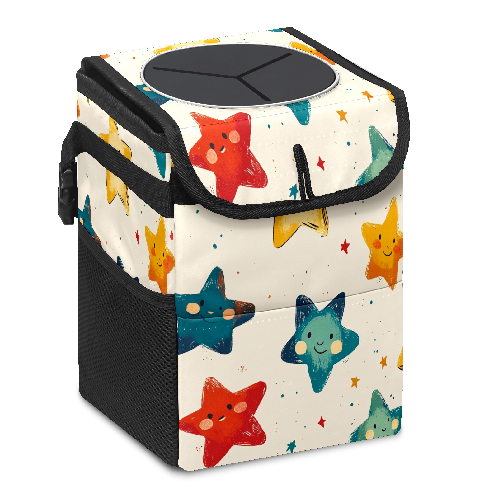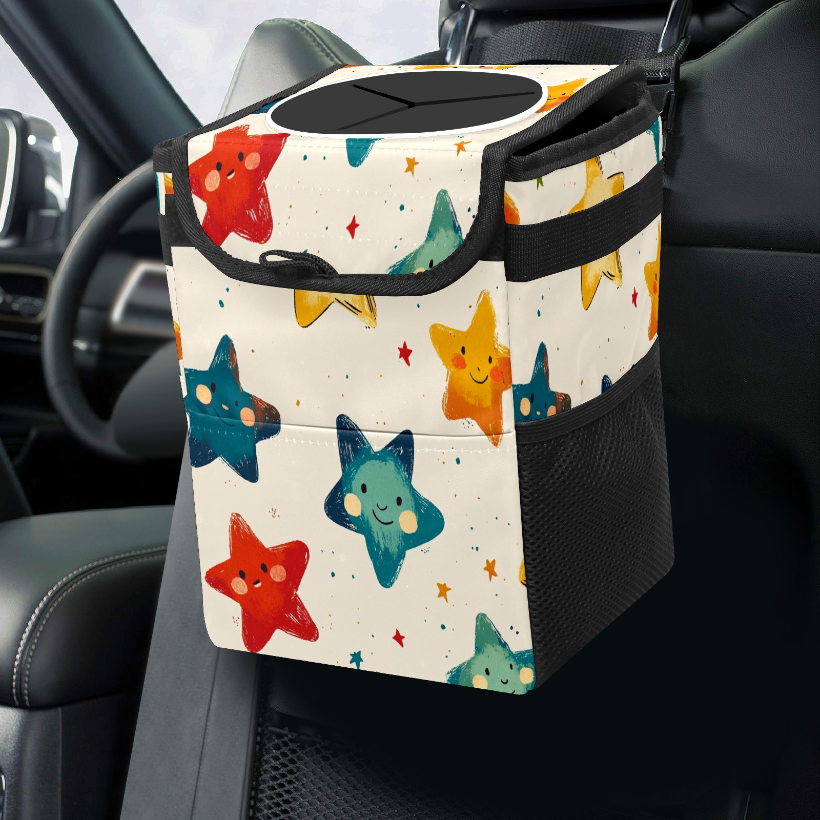 • <p>This multi-functional car trash can features a stylish printed design, combining practicality and aesthetics. Made with high-quality twill fabric and woven straps, it's sturdy and durable. Dimensions: 24×17×16cm (9.5×6.7×6.3 inches). The top rubber opening lid makes disposing of trash easy, while side mesh pockets and a front pocket easily store snacks, mobile phones, and other small items. Equipped with a dual securing system of straps and elastic hooks, it can be flexibly hung behind headrests, inside armrest boxes, or hooked to the bottom of seat cushions. Not only can it be used as a trash can, but it can also function as a food or miscellaneous item storage box, achieving multiple uses. When not in use, it can be folded for storage, saving space and creating a clean and tidy environment for your car.<br></p>