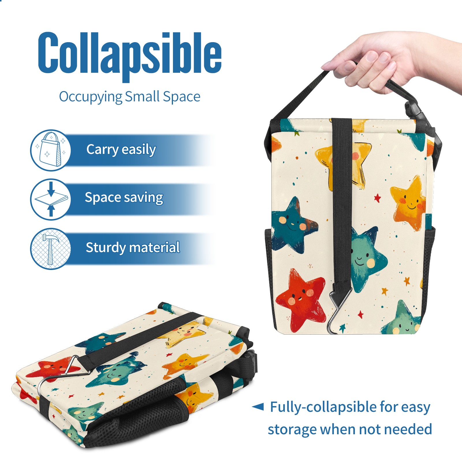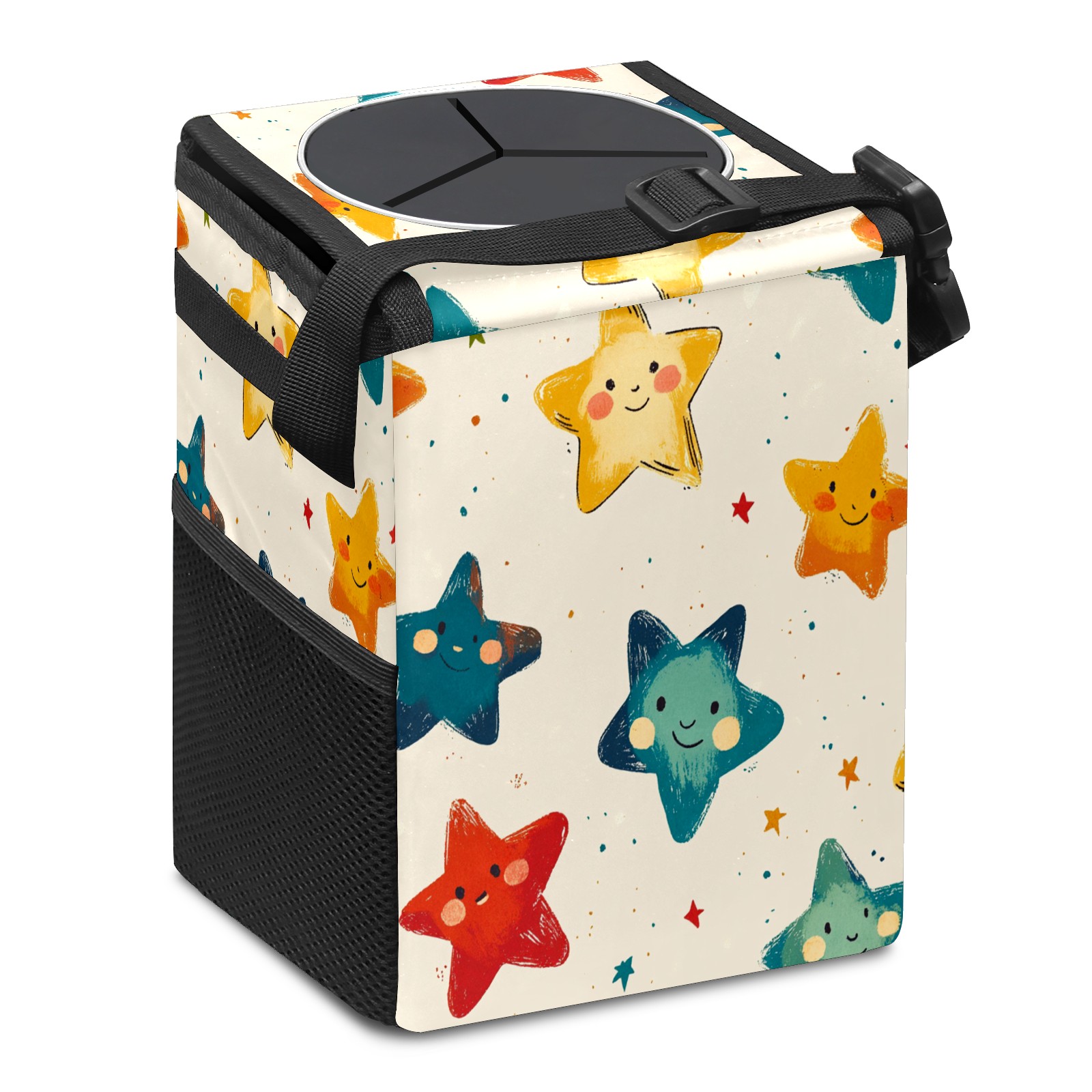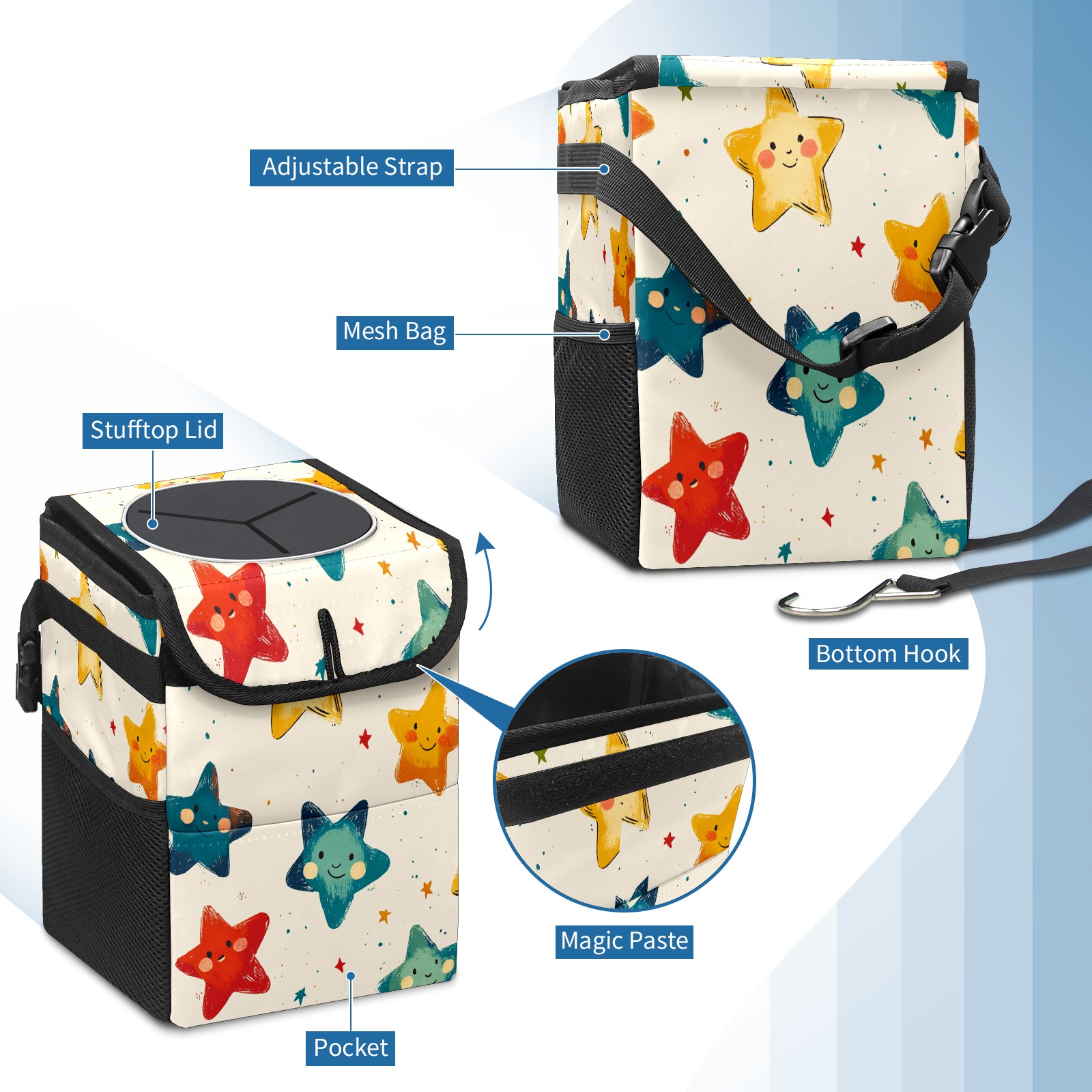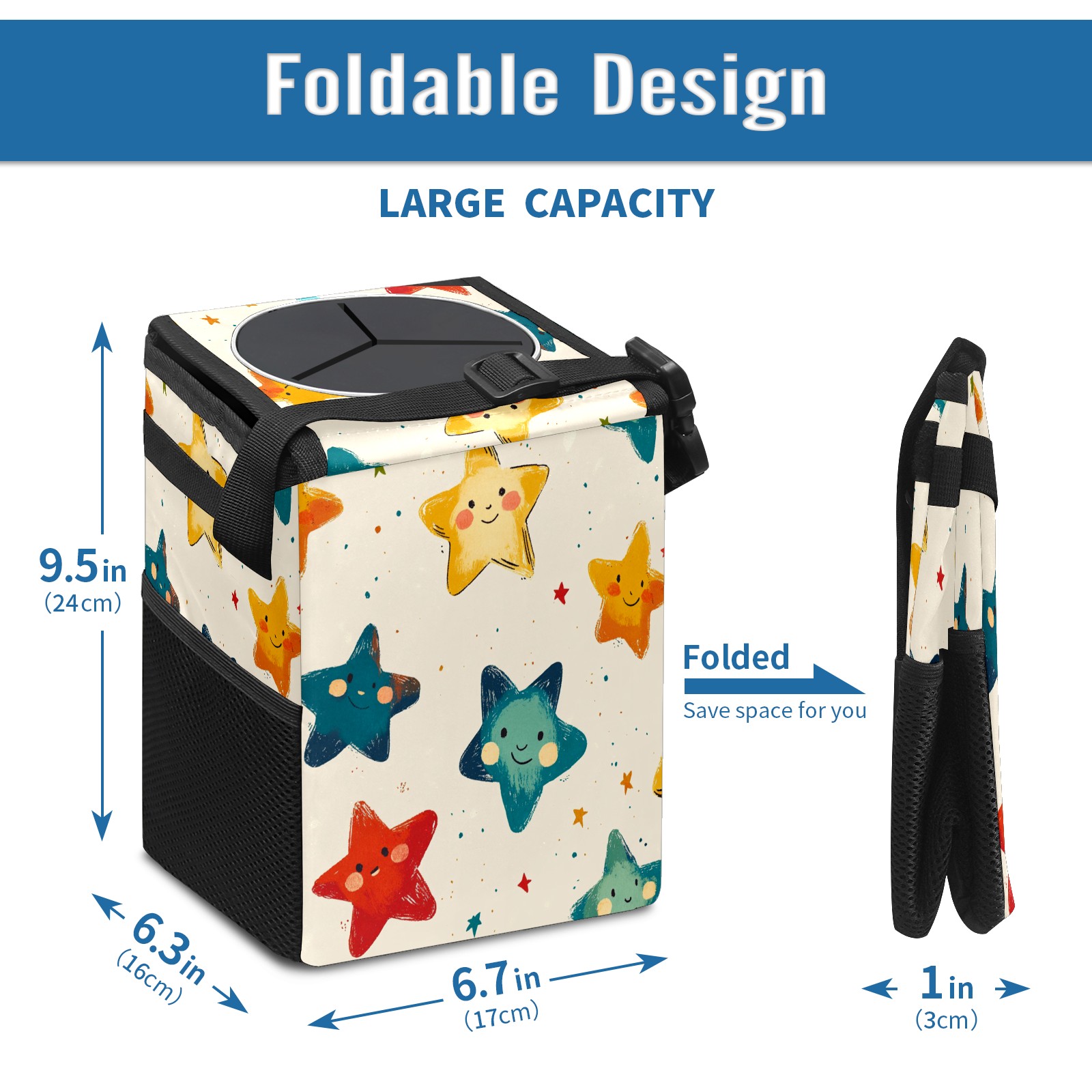• <p>This multi-functional car trash can features a stylish printed design, combining practicality and aesthetics. Made with high-quality twill fabric and woven straps, it's sturdy and durable. Dimensions: 24×17×16cm (9.5×6.7×6.3 inches). The top rubber opening lid makes disposing of trash easy, while side mesh pockets and a front pocket easily store snacks, mobile phones, and other small items. Equipped with a dual securing system of straps and elastic hooks, it can be flexibly hung behind headrests, inside armrest boxes, or hooked to the bottom of seat cushions. Not only can it be used as a trash can, but it can also function as a food or miscellaneous item storage box, achieving multiple uses. When not in use, it can be folded for storage, saving space and creating a clean and tidy environment for your car.<br></p>